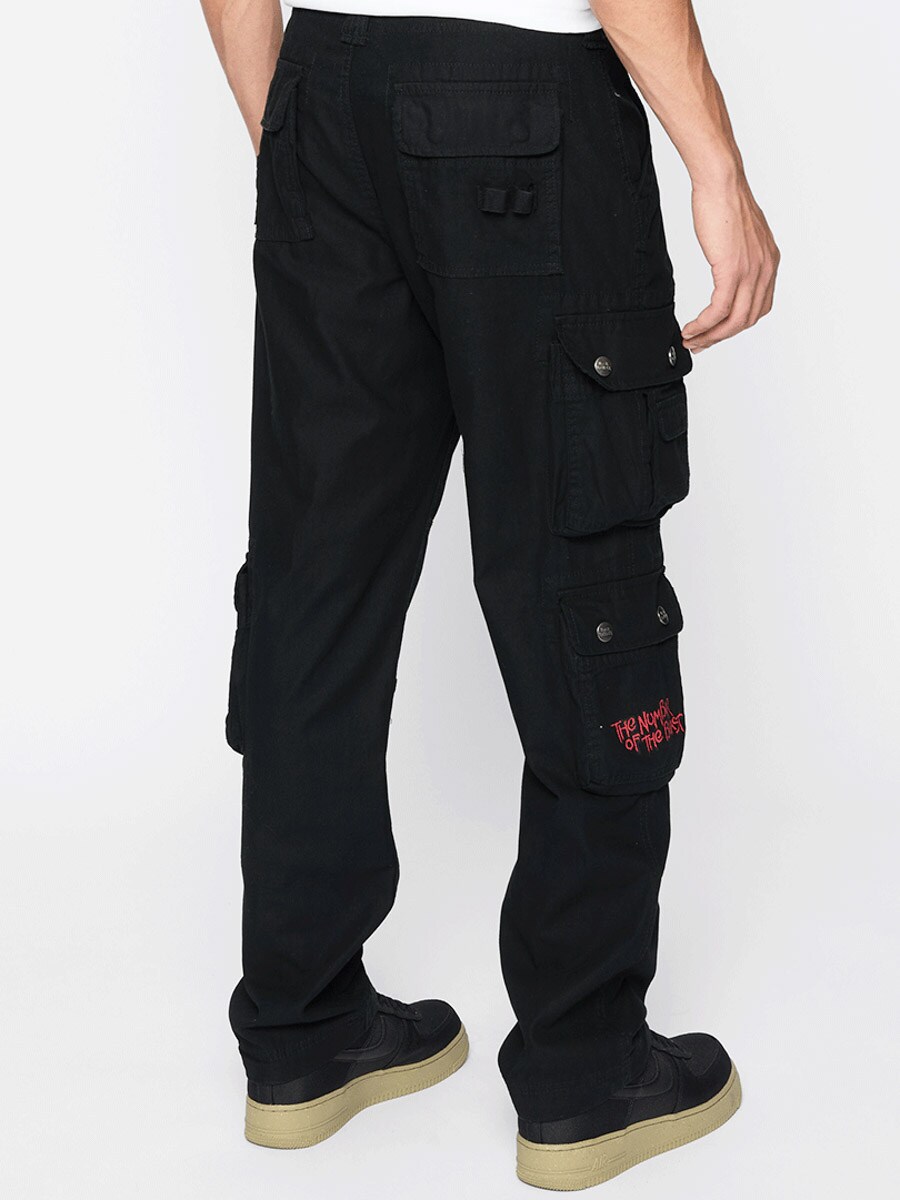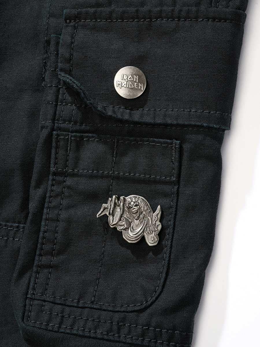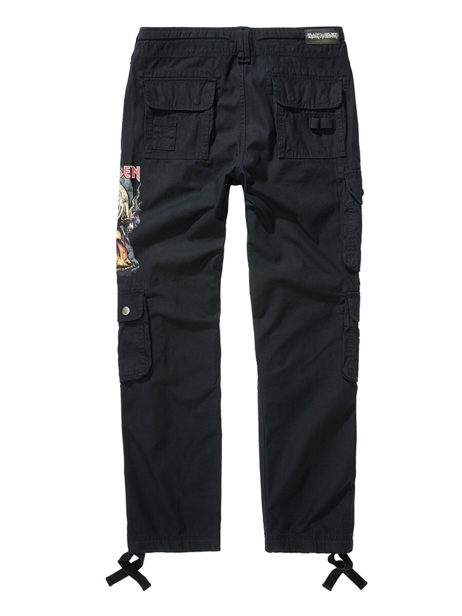 Black slim-fit trousers made from durable, skin-friendly cotton that provides both comfort and strength. Adjustable fabric straps at the waist and cuffs make it easy to customize the fit. Designed with a large Iron Maiden print along the left leg and a “Number of the Beast” print on the right leg pocket — a clear tribute to the iconic heavy metal band Iron Maiden.