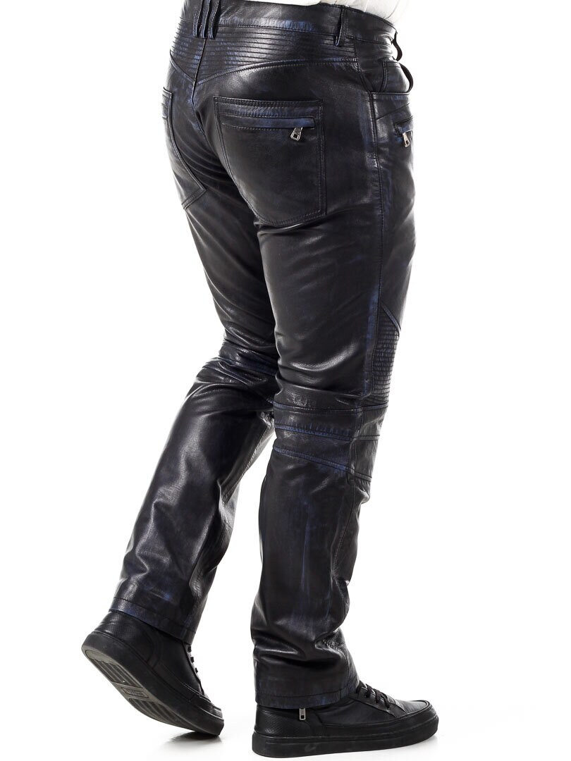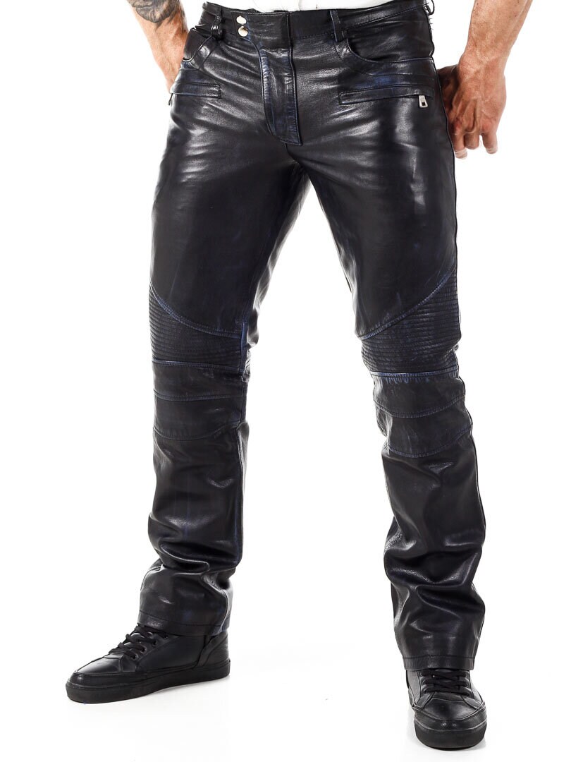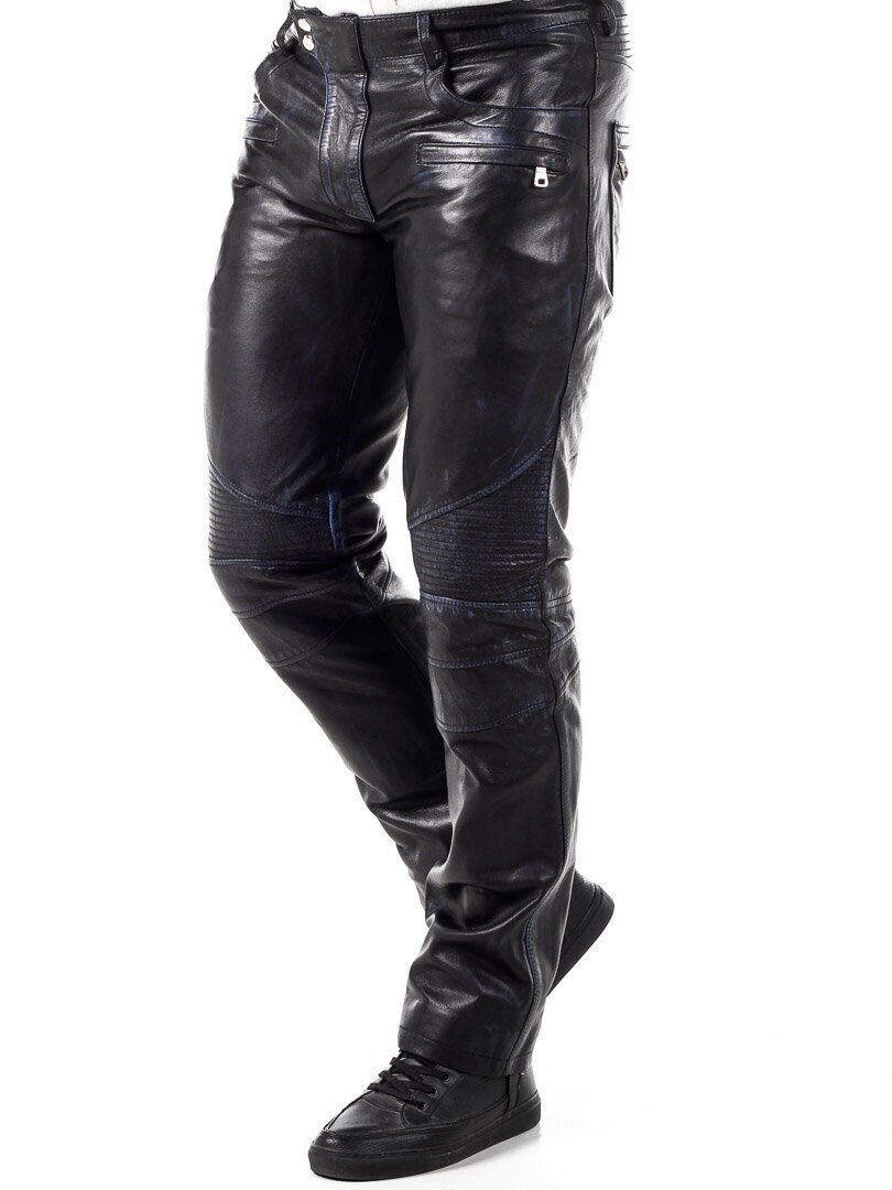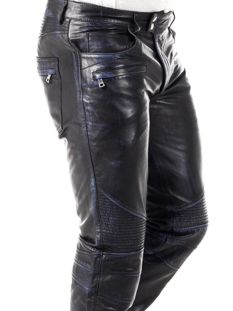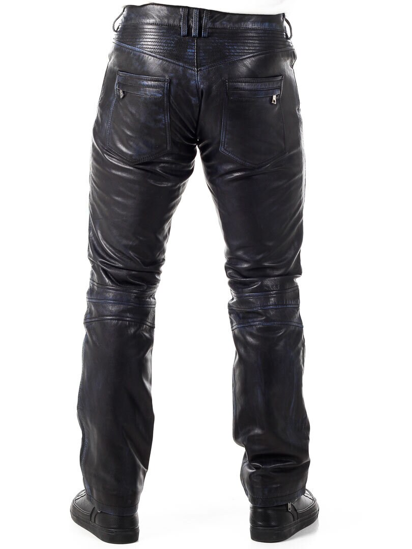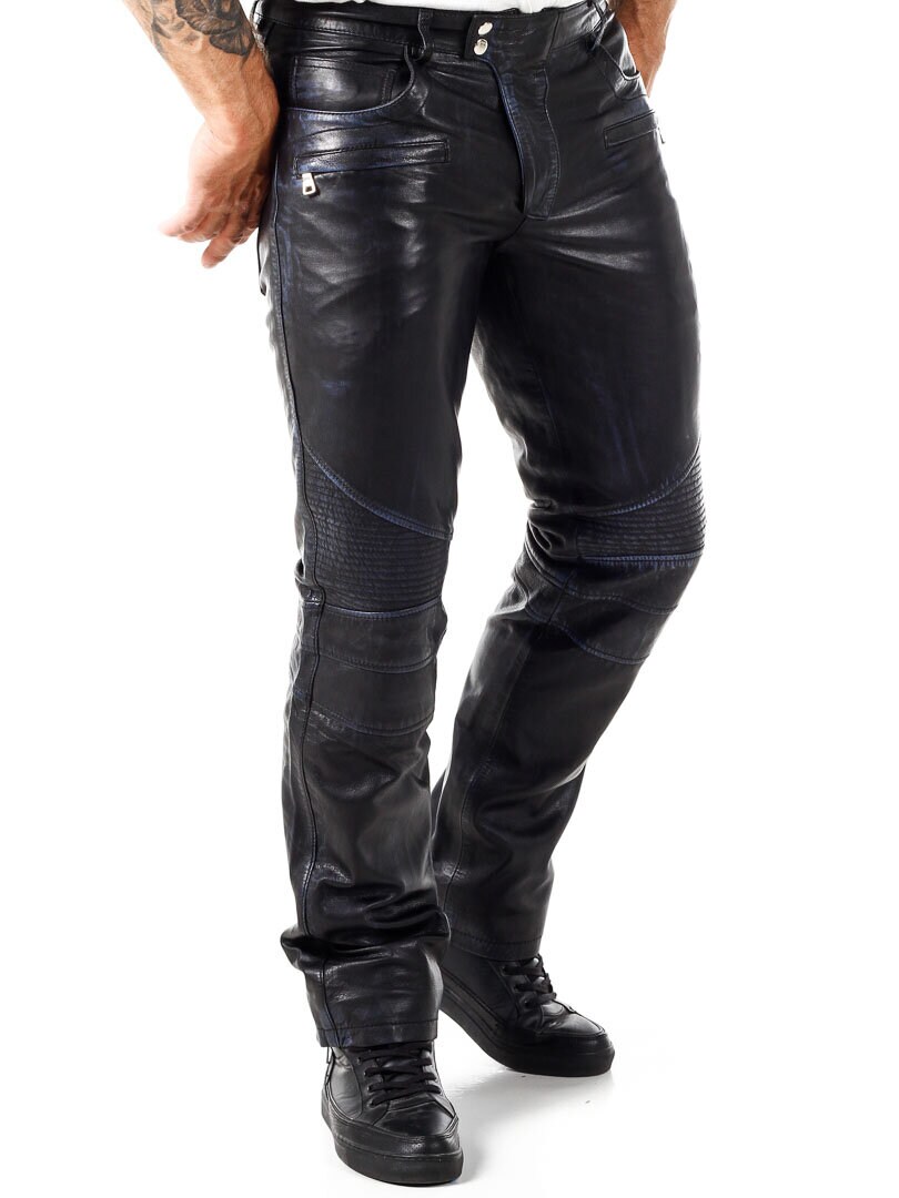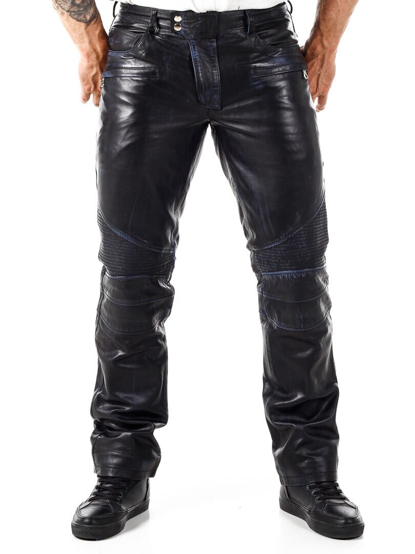 Black leather pants with blue elements. They have several pockets, both open and closable. Biker-inspired design with a classic fit. Made of soft leather and only available at Rockdenim!
