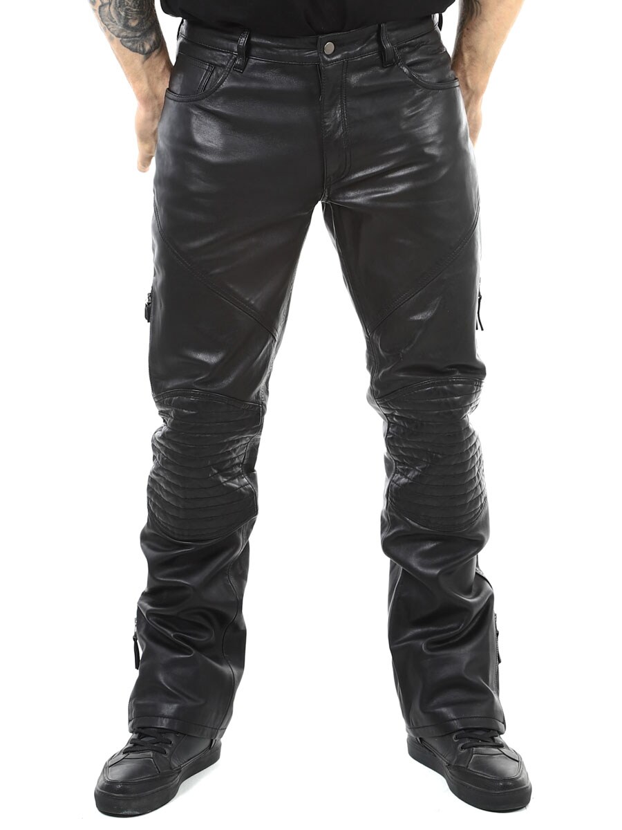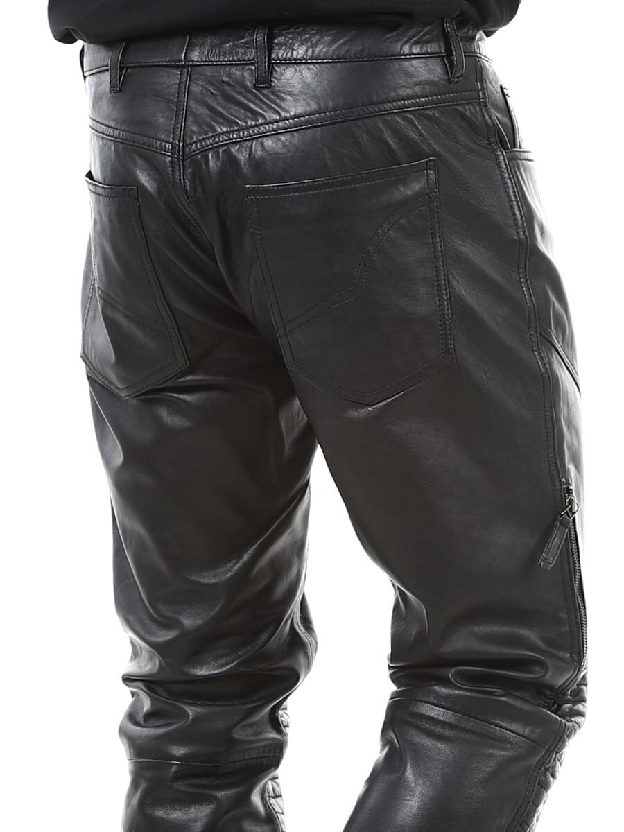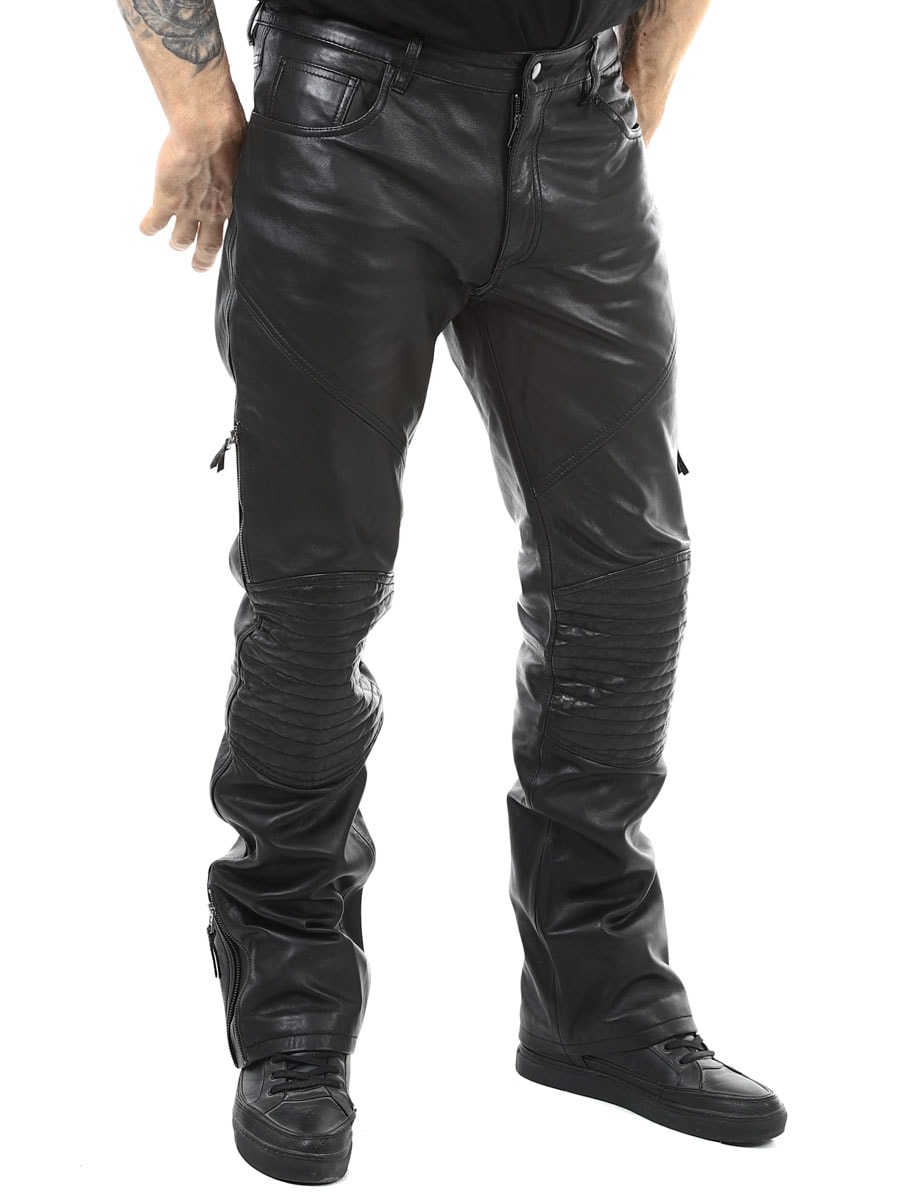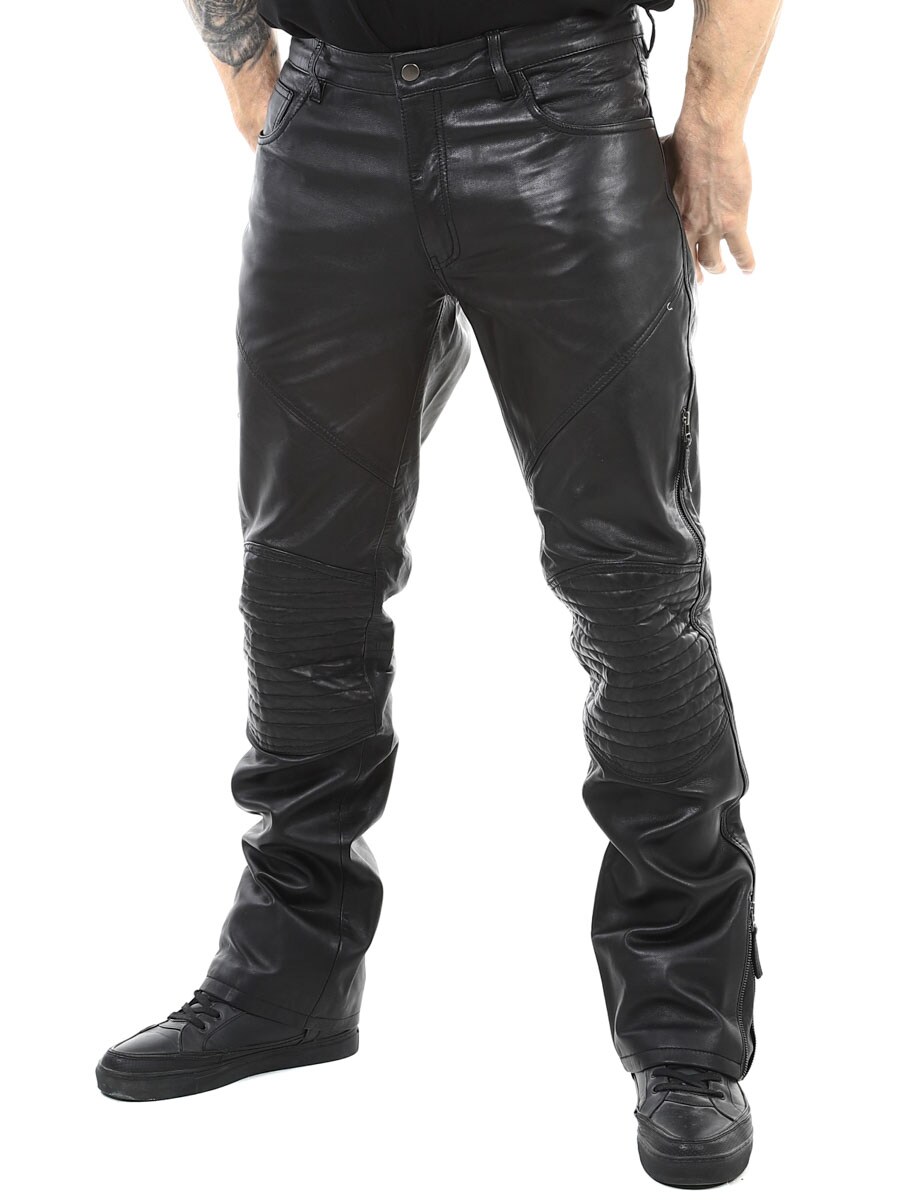 Stylish trousers made from genuine sheep leather, which gives them a soft and supple feel while maintaining a durable and long-lasting quality. They feature five classic pockets and zips at the hems for a customisable fit. Zip detailing and padded knees. Designed for biking enthusiasts and those looking for an edgy look!