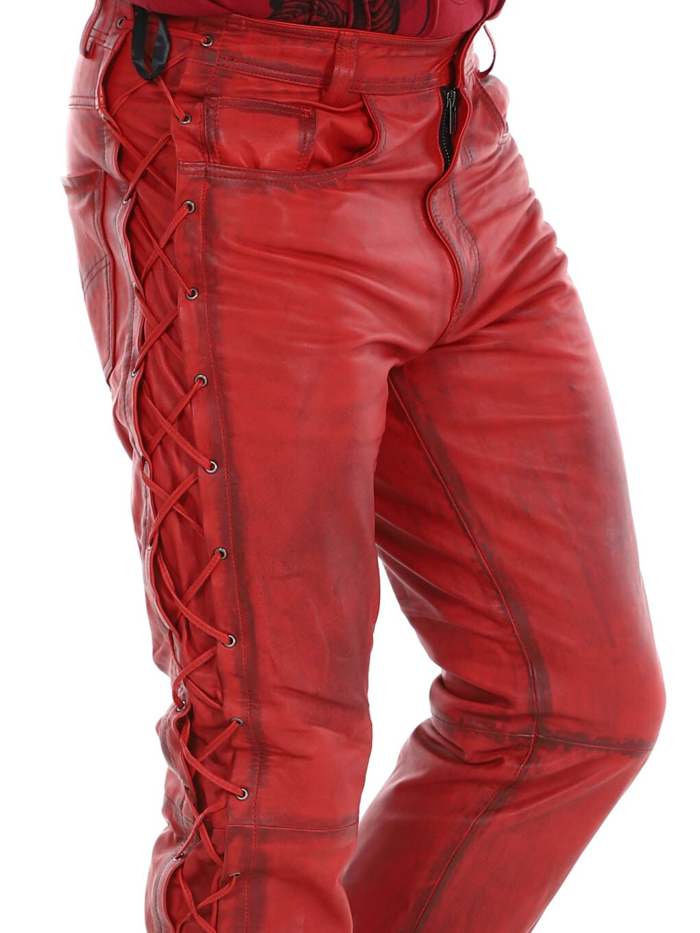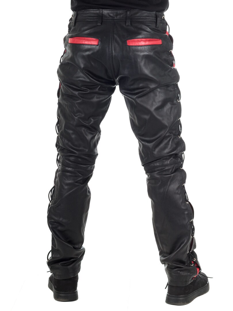 Genuine leather trousers with thin lining and drawstring at the sides to adjust the width. They have three front pockets, two back pockets and waist loops. Zip closure with metal button.