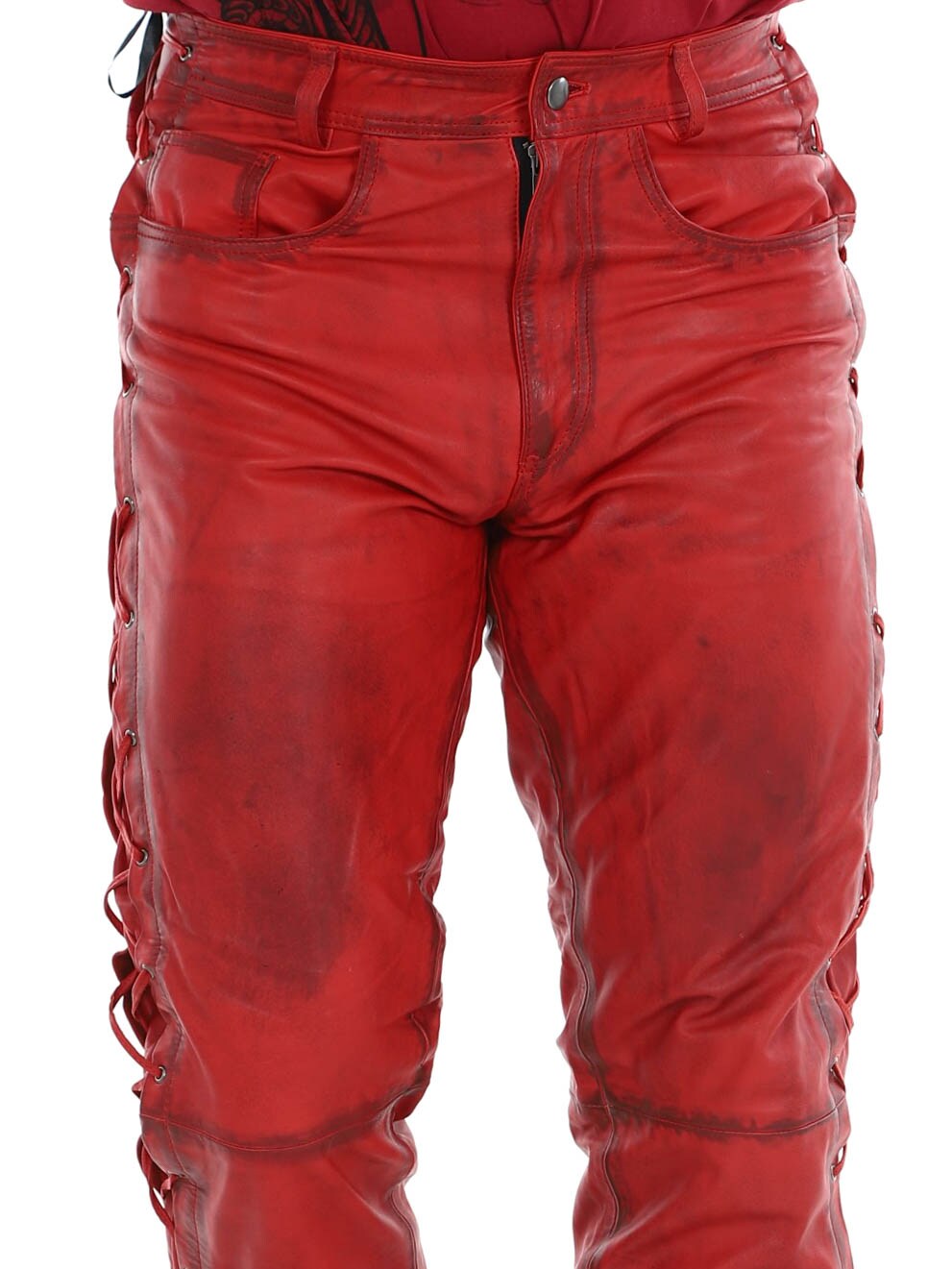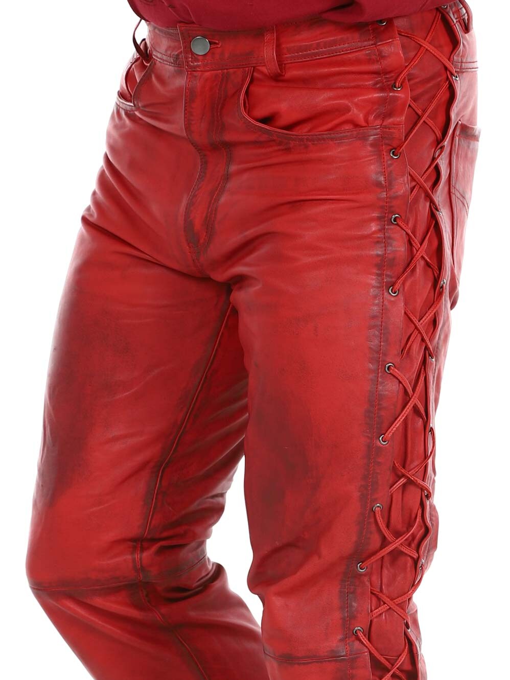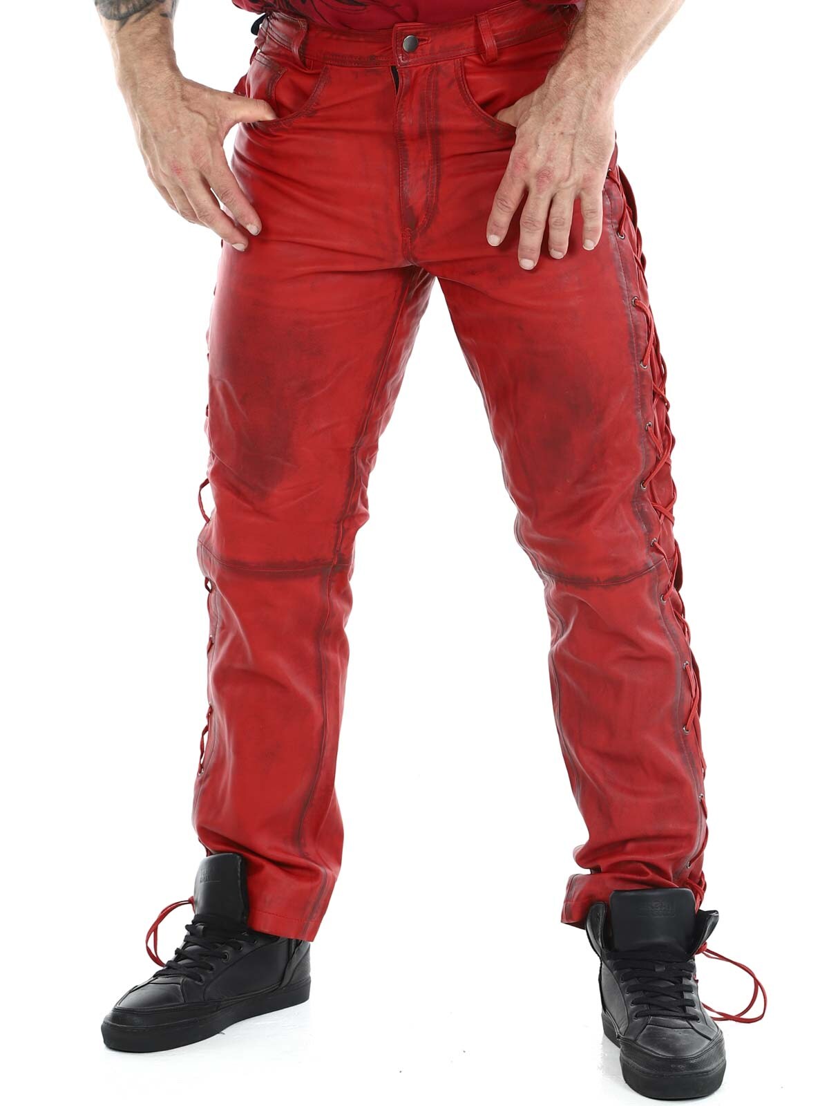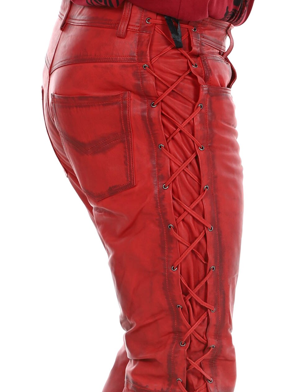 Genuine leather trousers with thin lining and drawstring at the sides to adjust the width. They have three front pockets, two back pockets and waist loops. Zip closure with metal button.