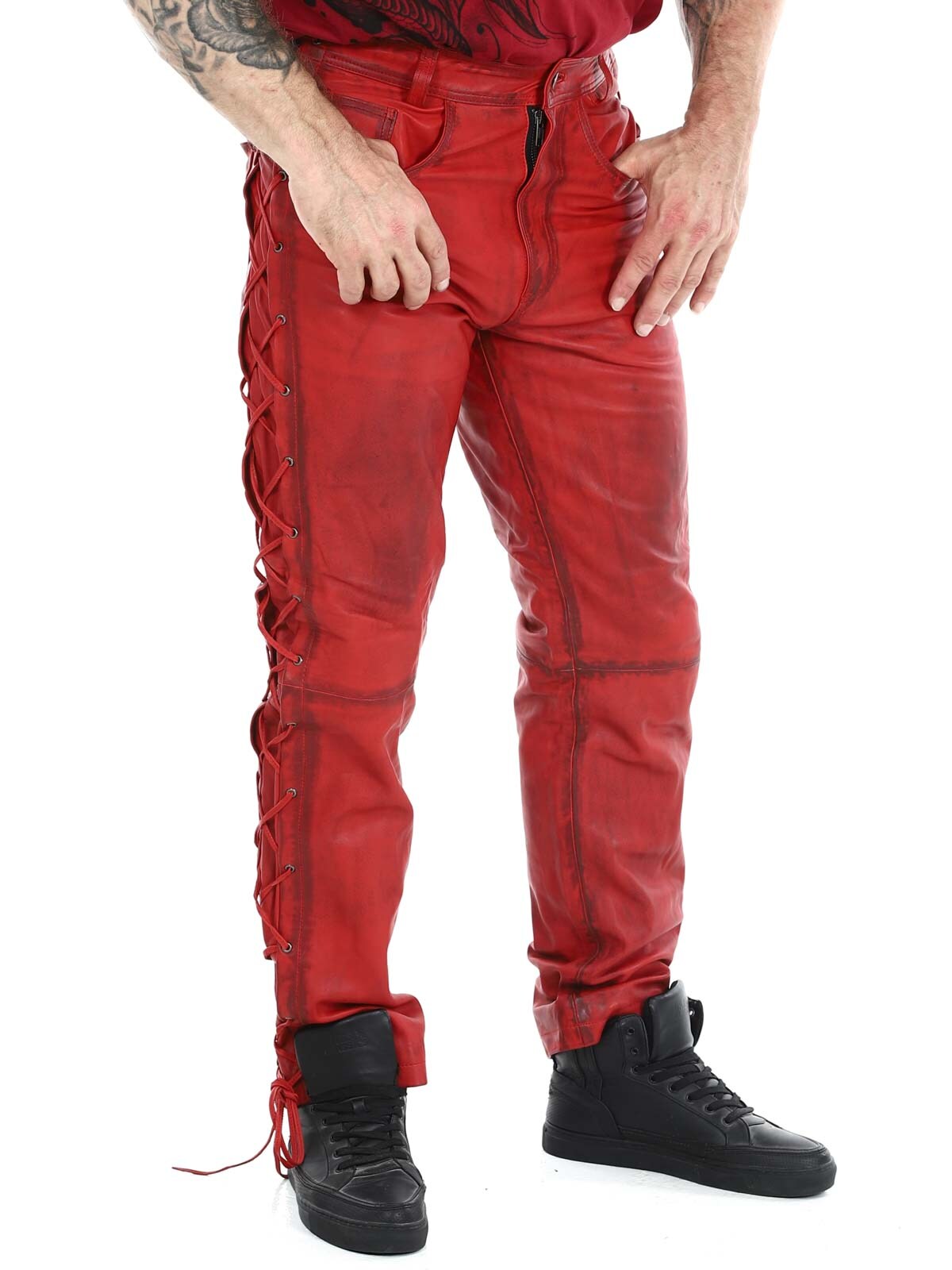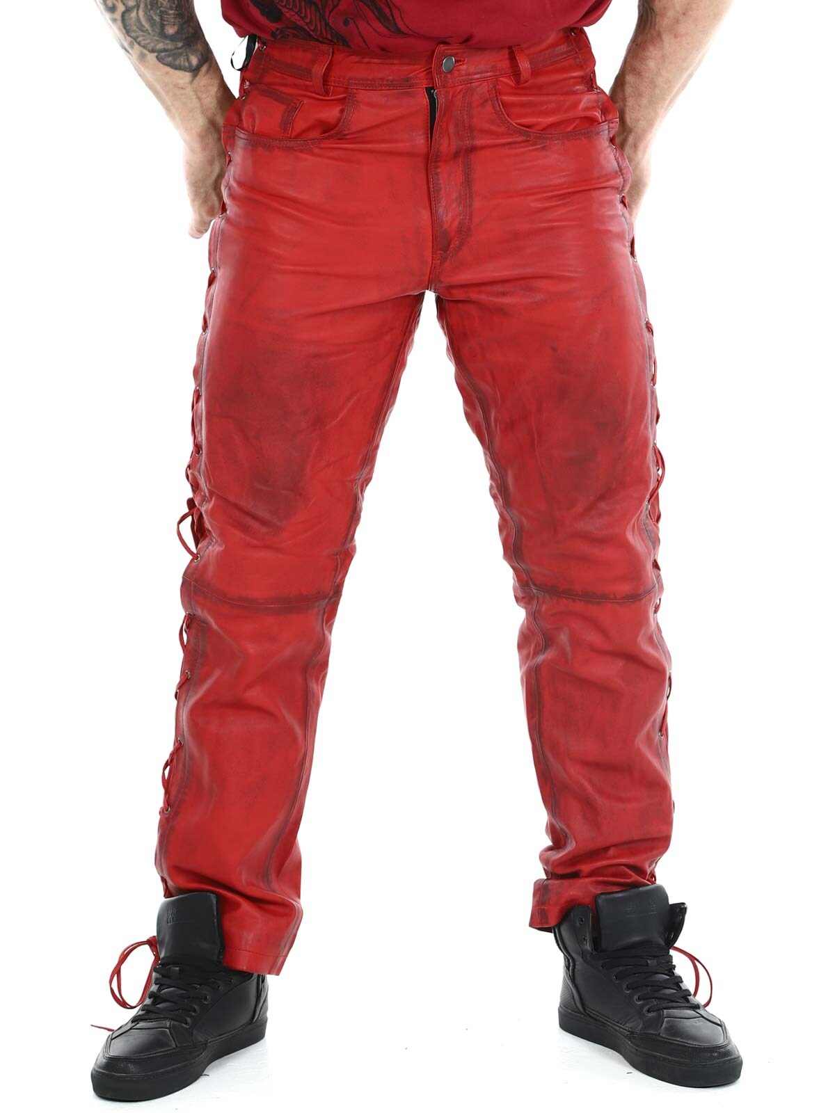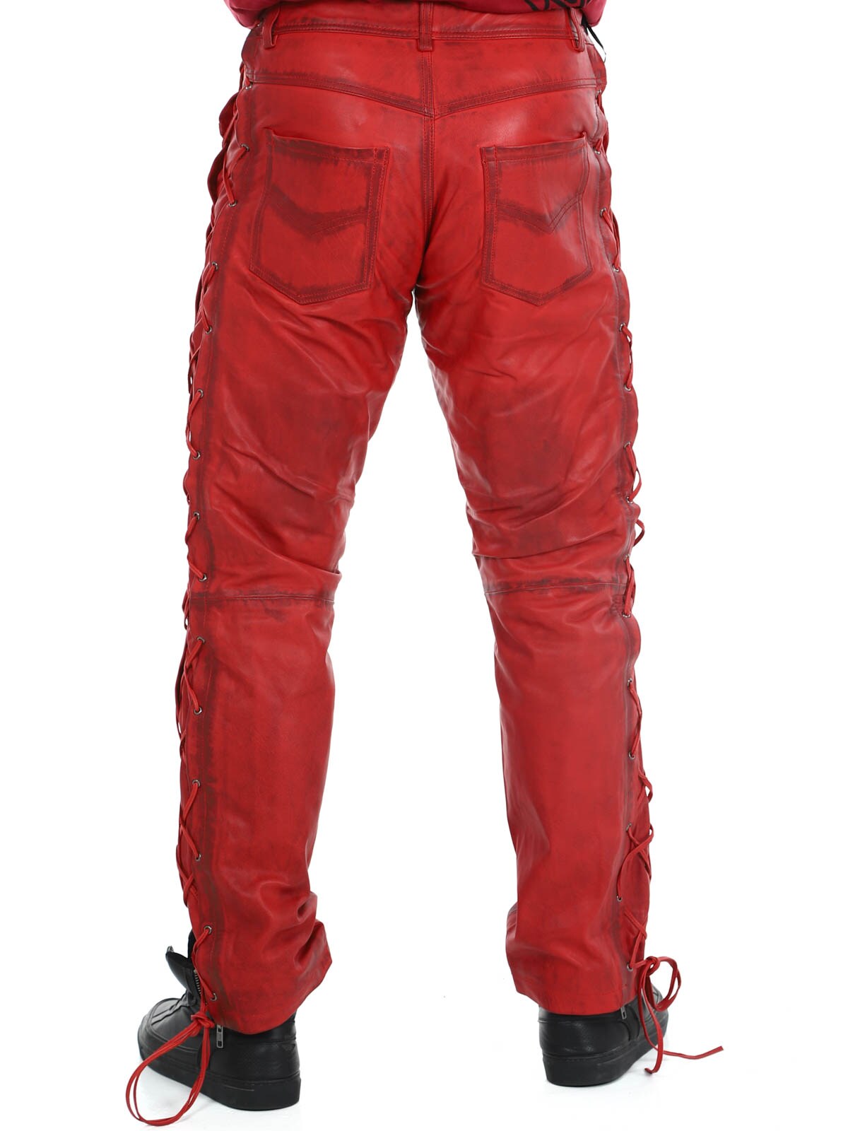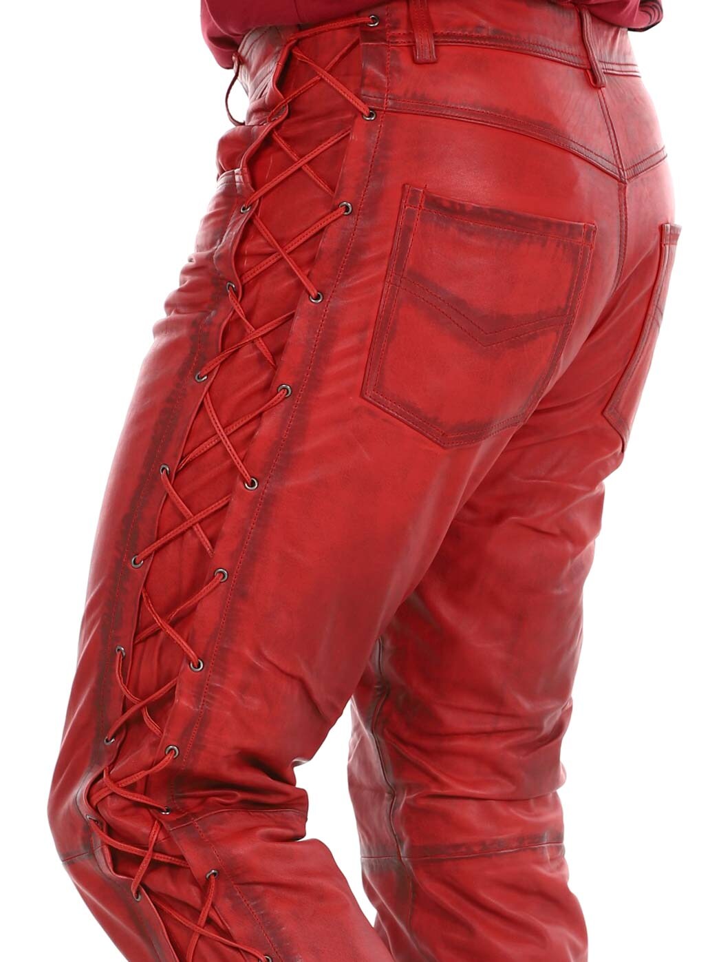 Genuine leather trousers with thin lining and drawstring at the sides to adjust the width. They have three front pockets, two back pockets and waist loops. Zip closure with metal button.