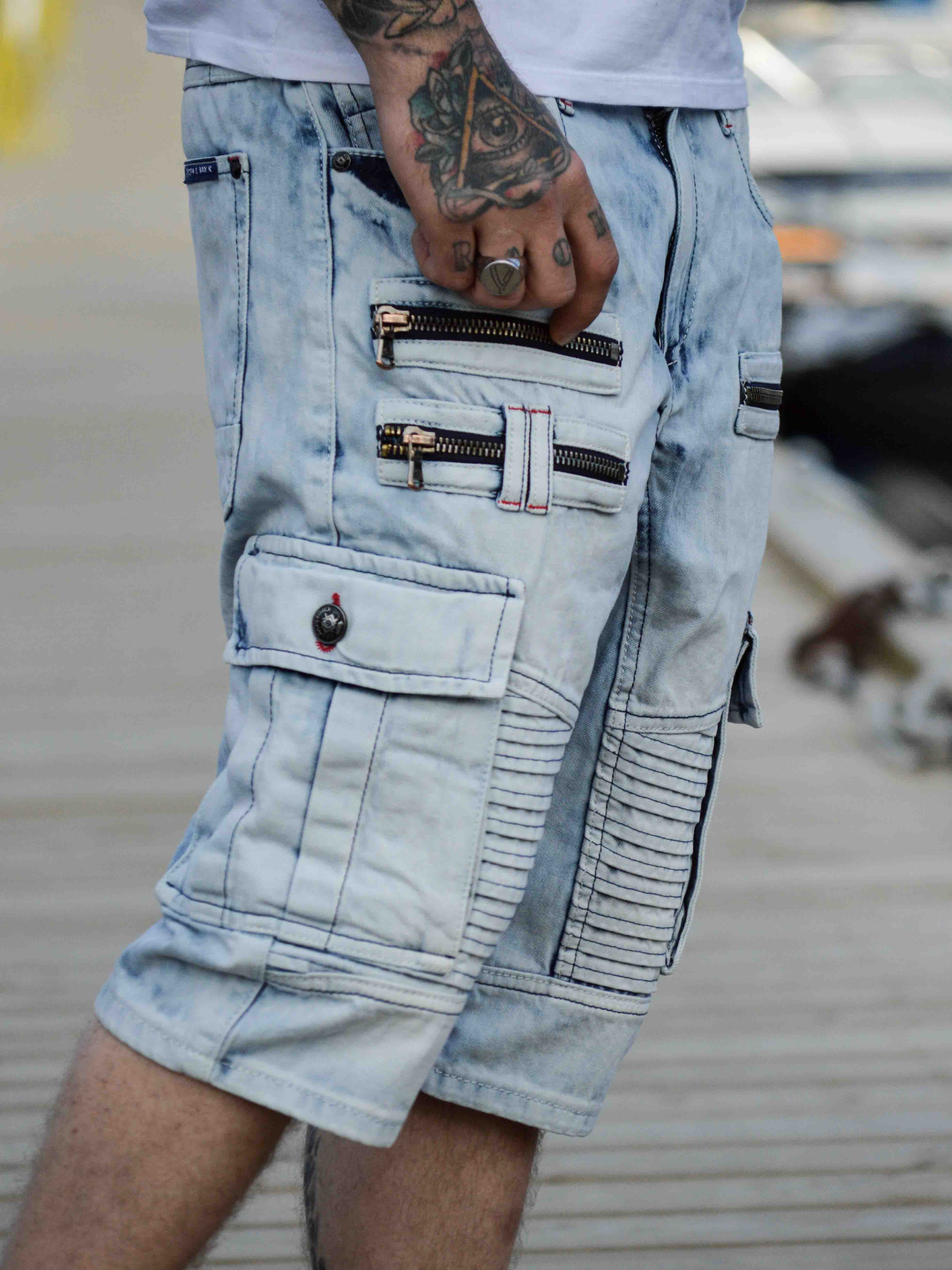 Cargo shorts in stone-washed denim. Knee-length model with five classic pockets and two thigh pockets. The zippers at the front are purely a design detail.