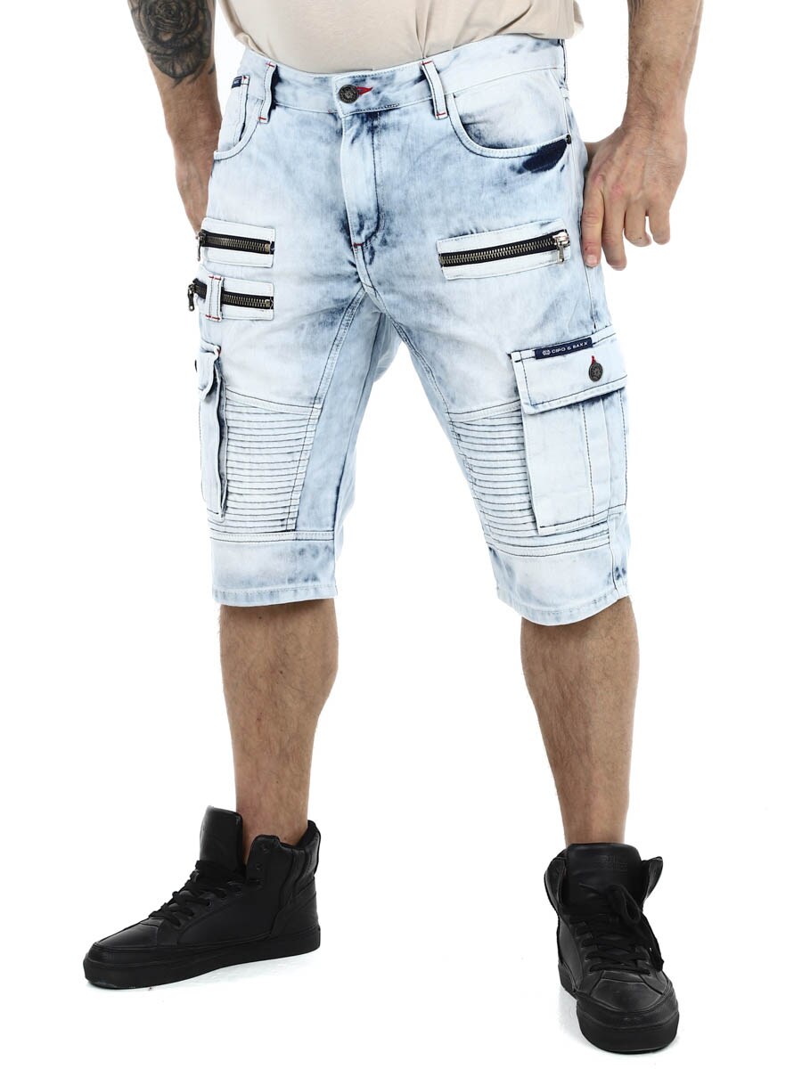 Cargo shorts in stone-washed denim. Knee-length model with five classic pockets and two thigh pockets. The zippers at the front are purely a design detail.