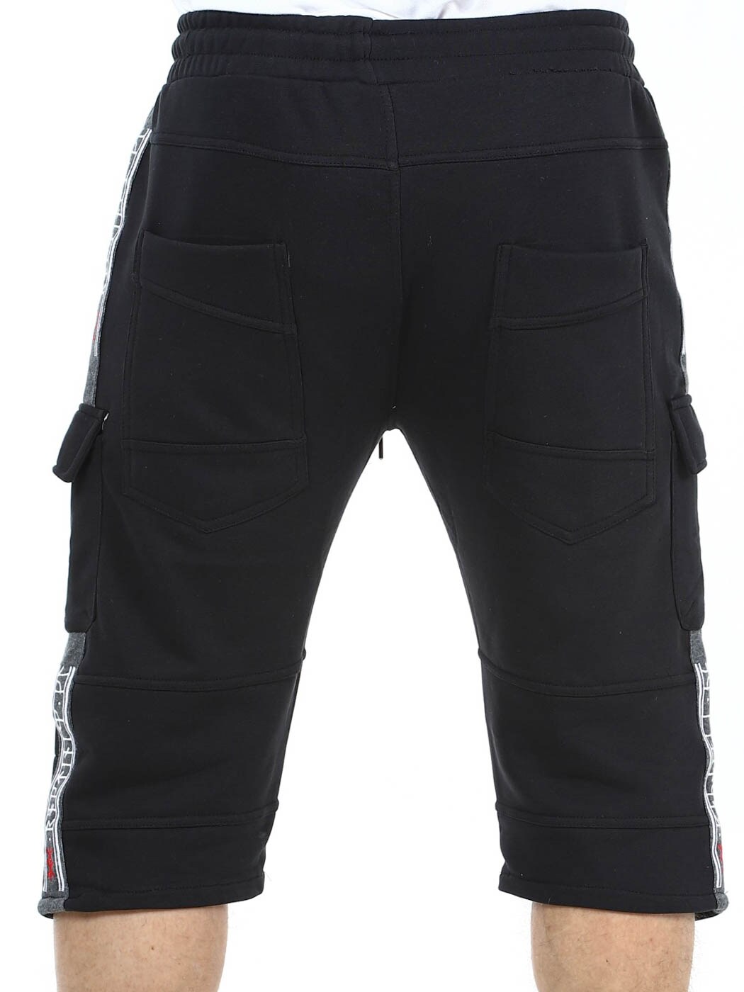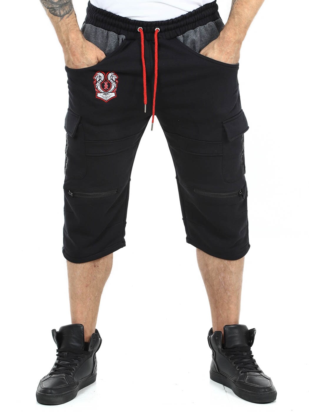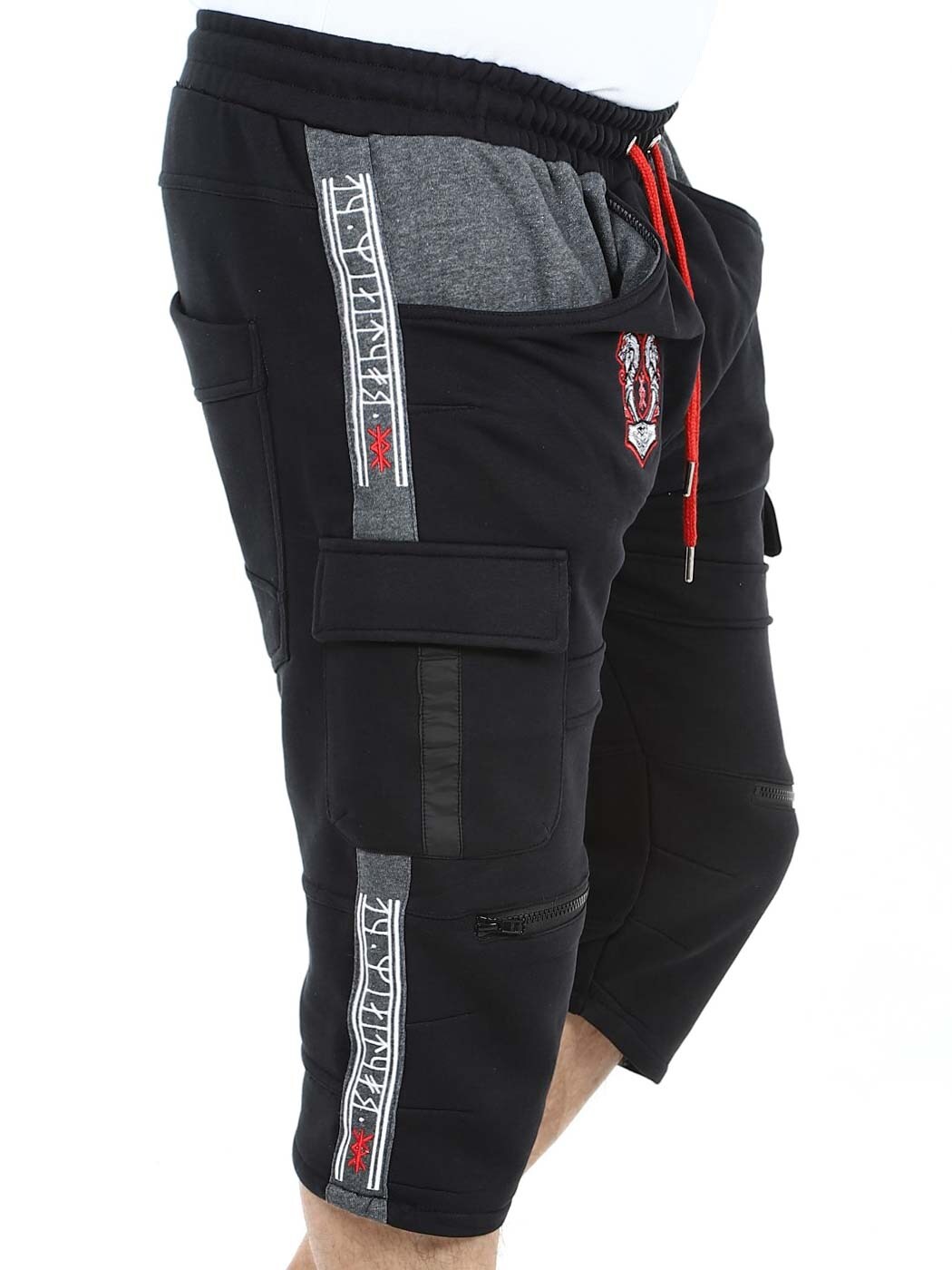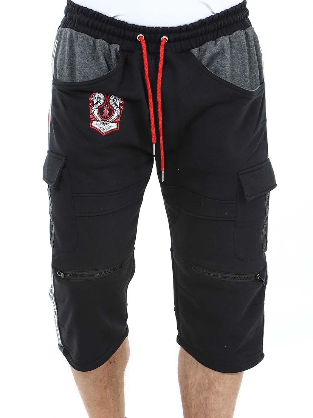 Cargo shorts with Viking-inspired designs. They have several pockets and elasticated cuffs with drawstring at the waist. Zips on the front legs that can be opened and are air holes. These unique shorts are only available at RockDenim!