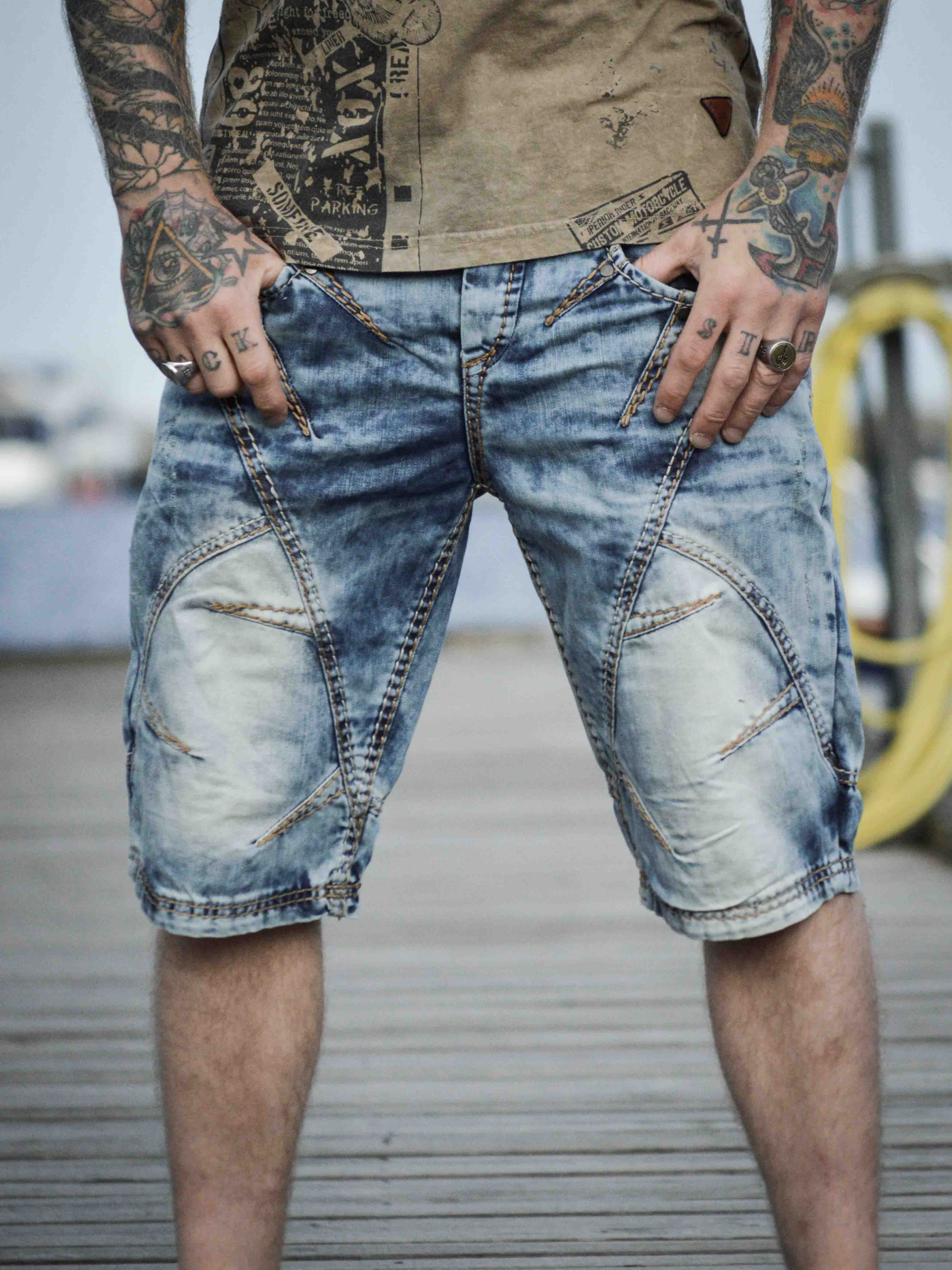 Shorts in denim detailed with coarse stitching, zips, rivets and rips in the hue. Knee-length model with spacious pockets.