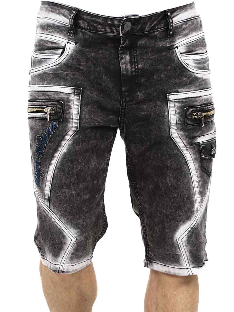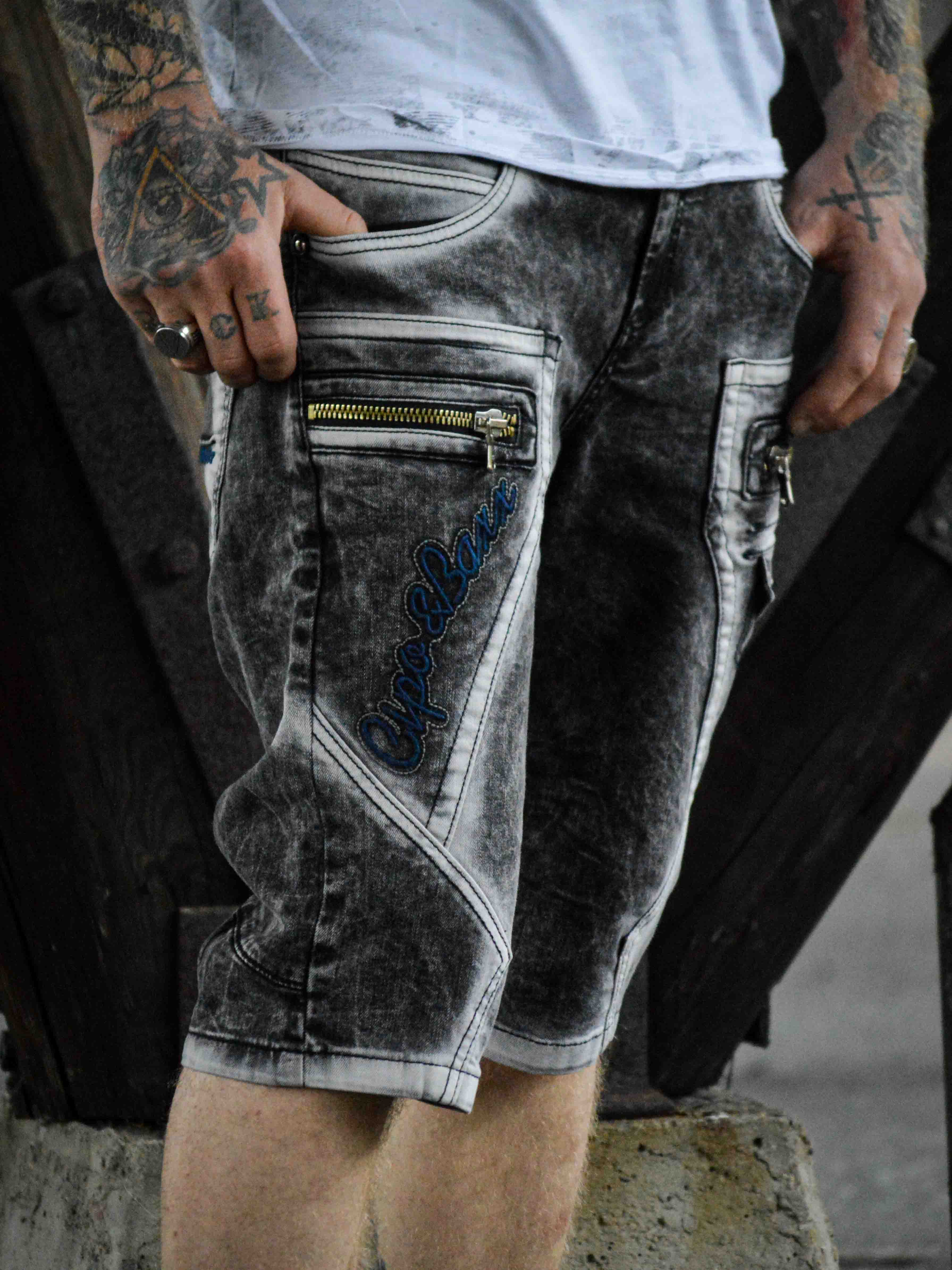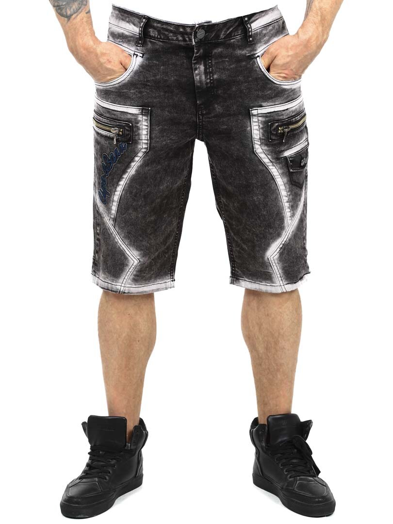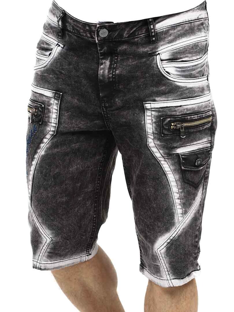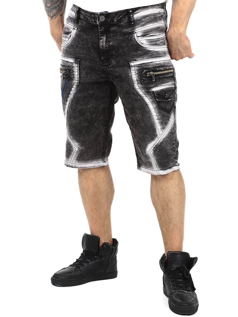 Upgrade your streetwear style with these unique shorts. Made from durable denim with a heavily washed finish for a tough look. They feature multiple functional pockets, embroidered logo and chunky stitching for extra edge. The front zippers are decorative and not functional.