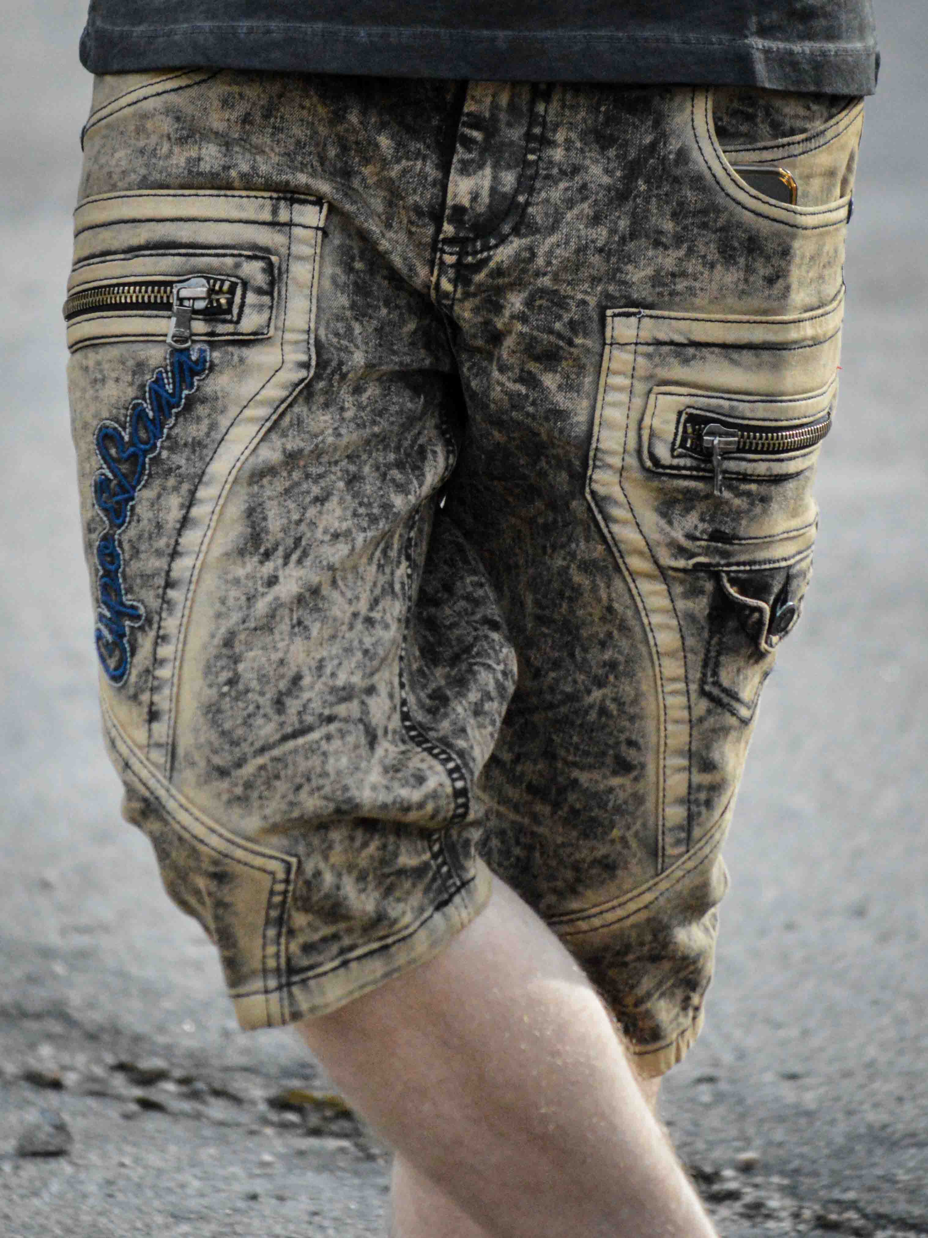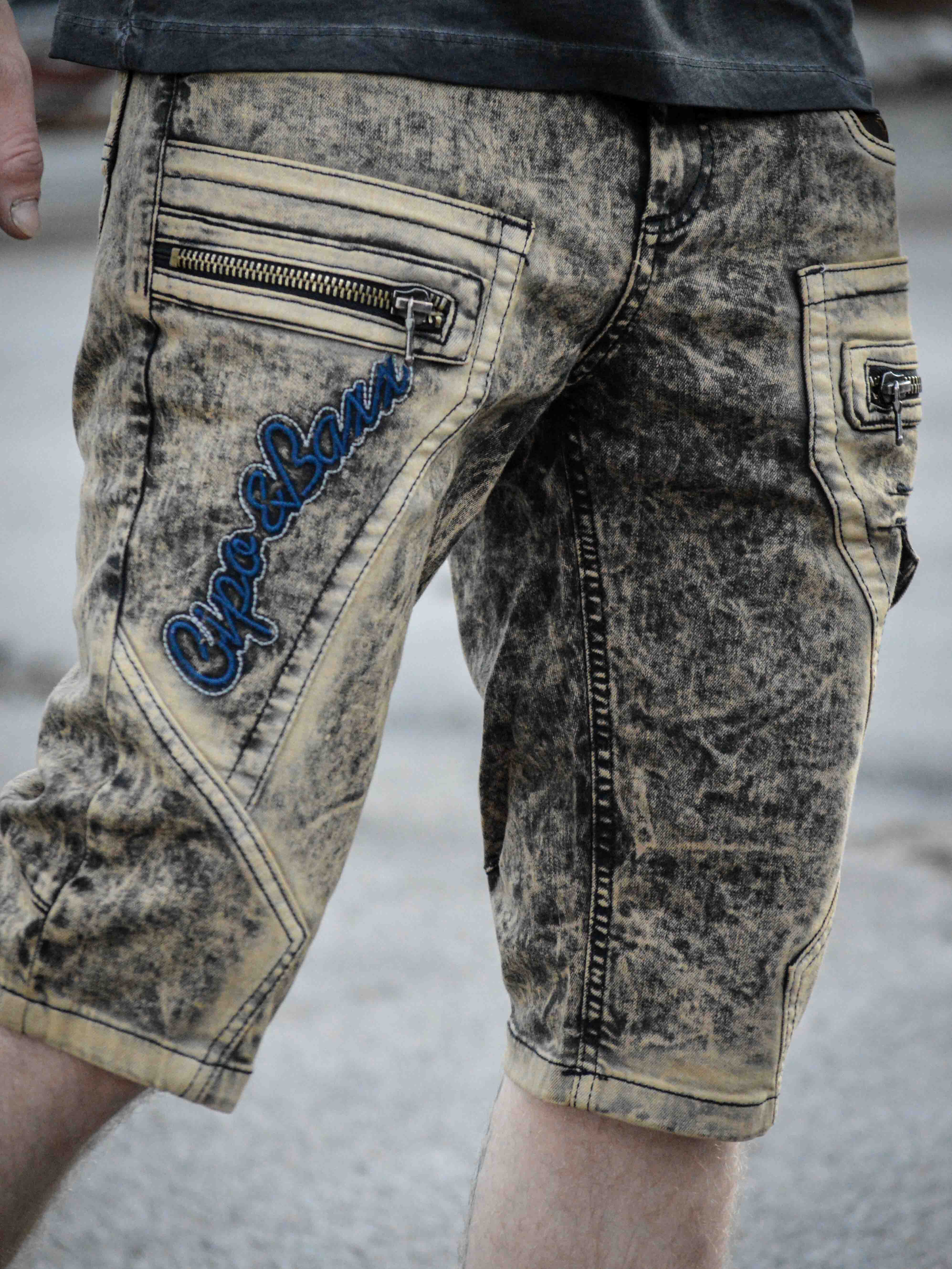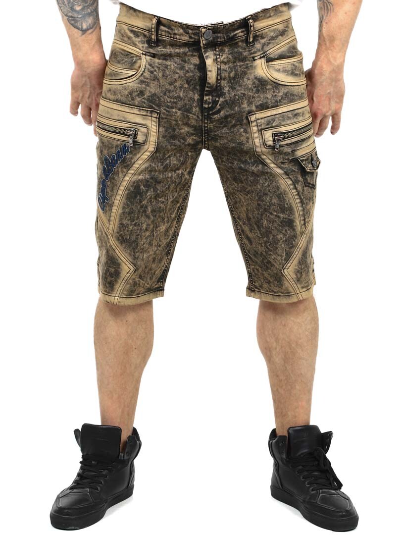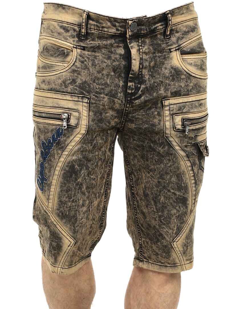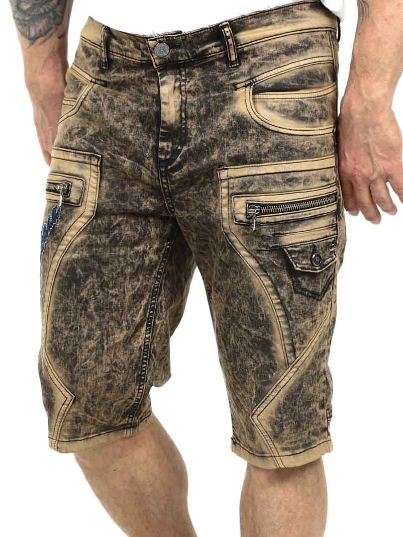 Upgrade your streetwear style with these unique shorts. Made from durable denim with a heavily washed finish for a tough look. They feature multiple functional pockets, embroidered logo and chunky stitching for extra edge. The front zippers are decorative and not functional.