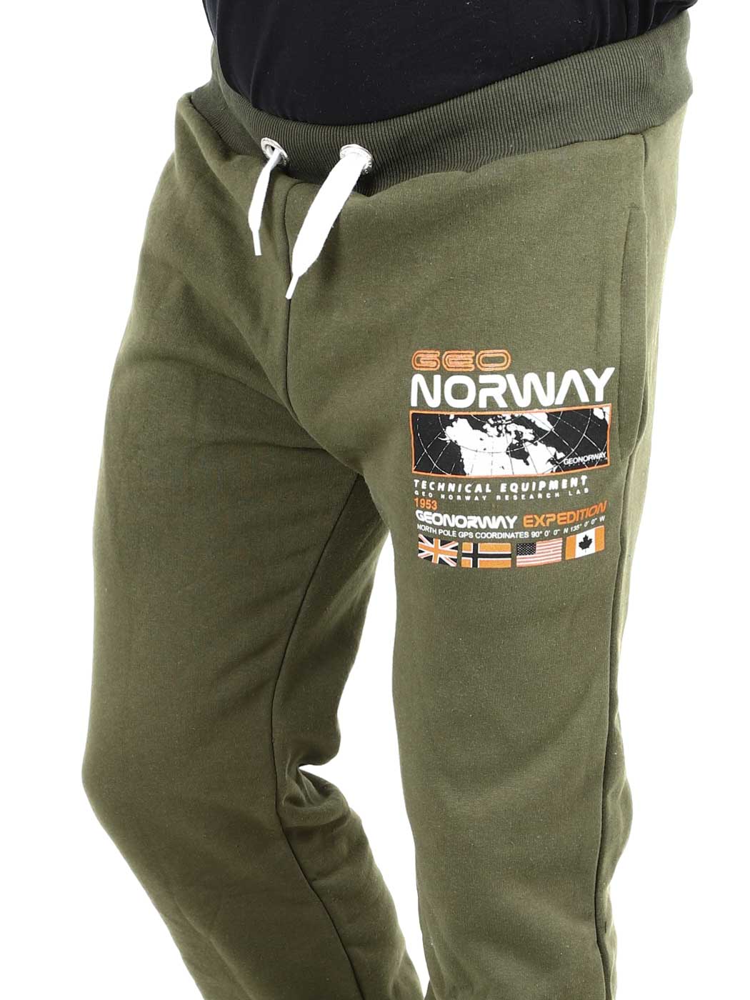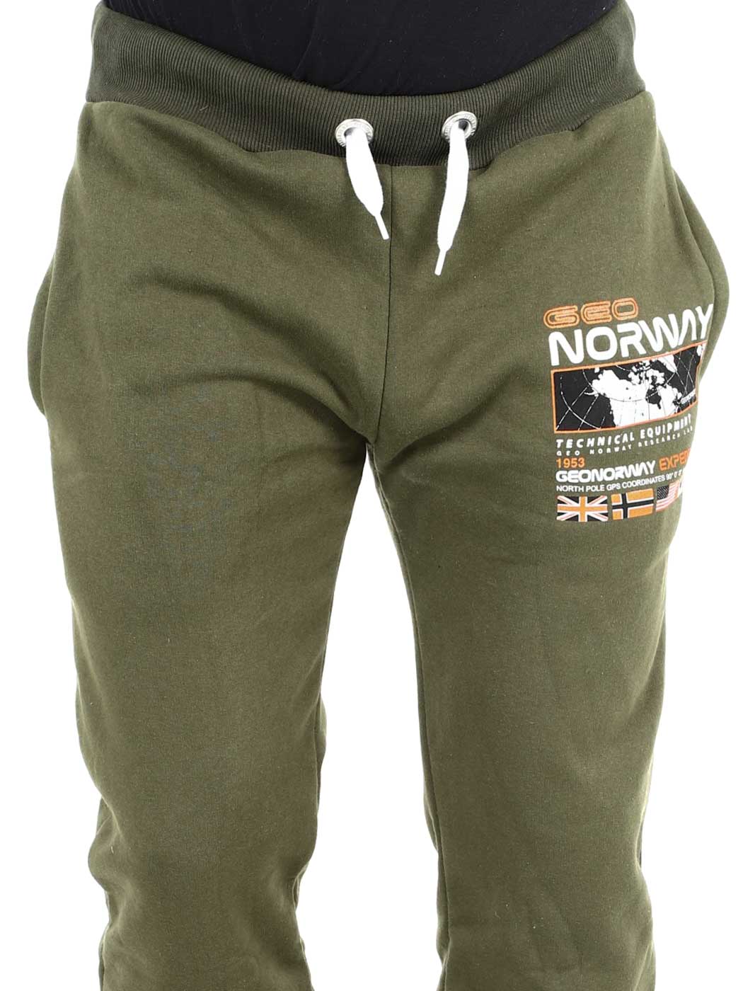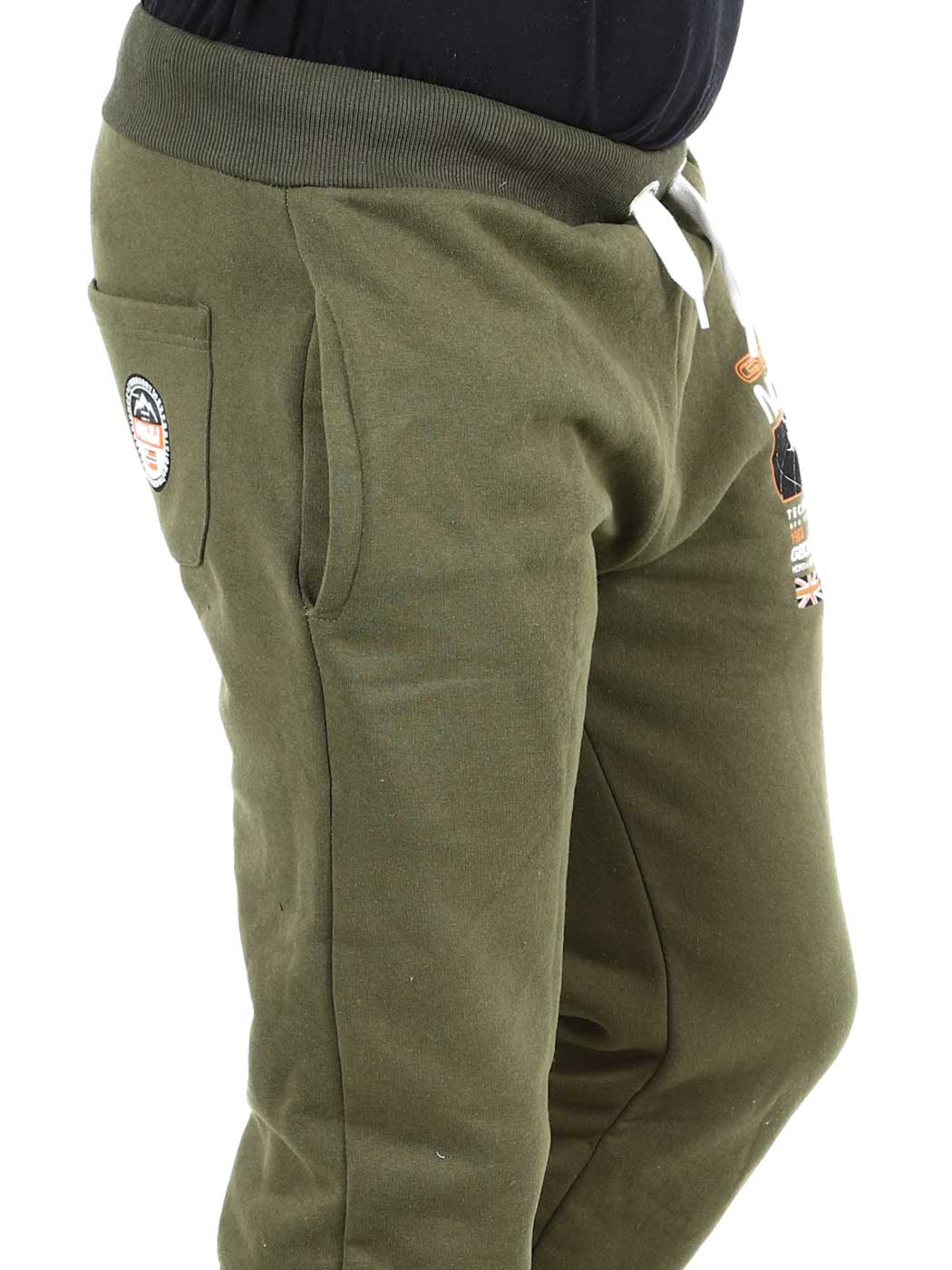 Green trousers with contrasting colour print on the leg and back pocket. They have three open pockets, brushed inside and drawstring waist. Ribbed cuffs at the waist and elasticated leg ends.
