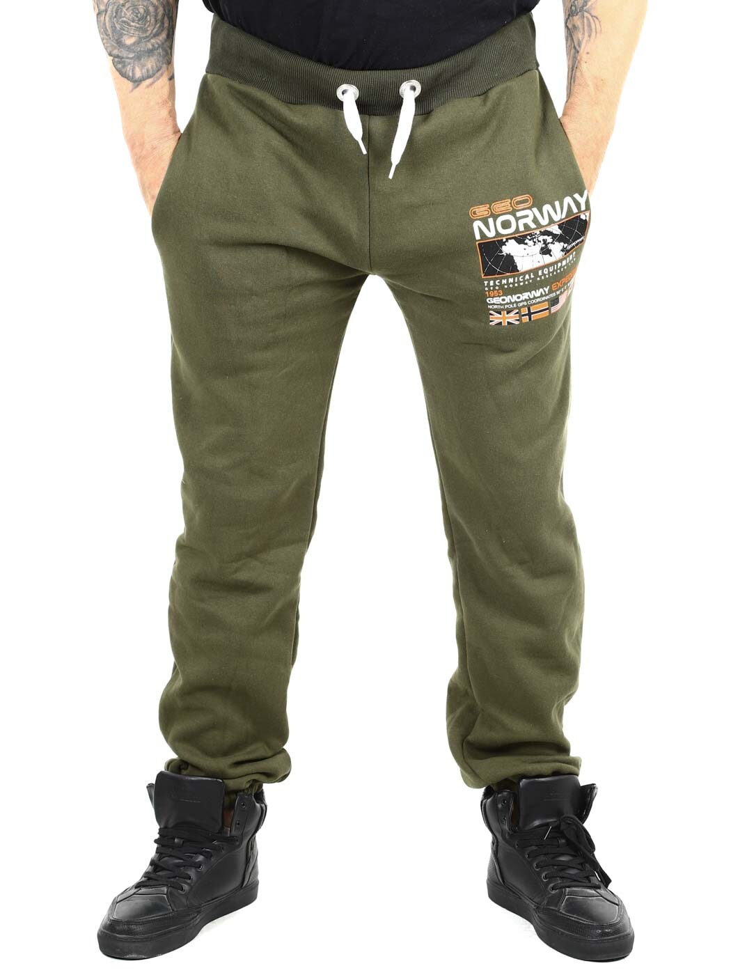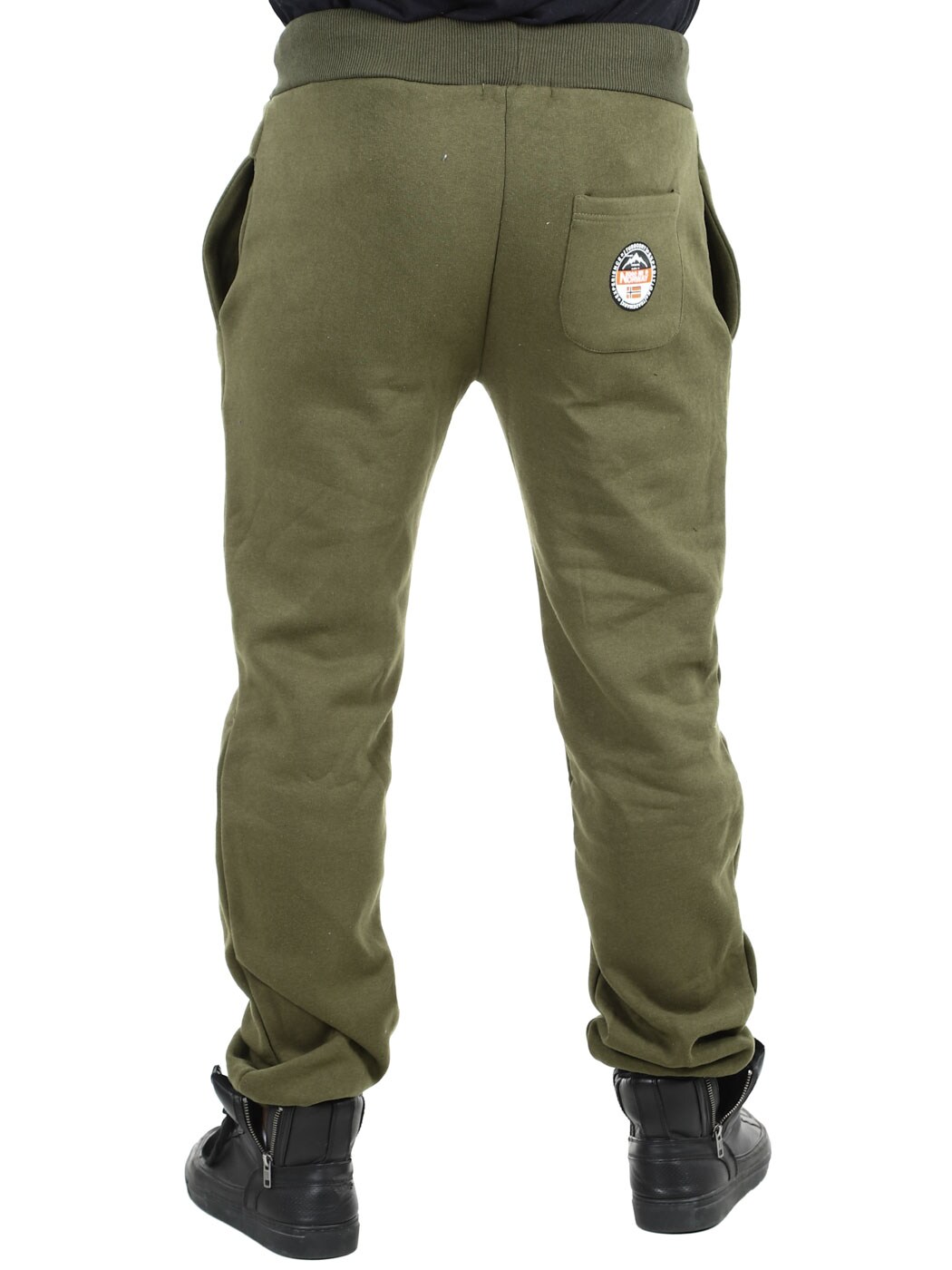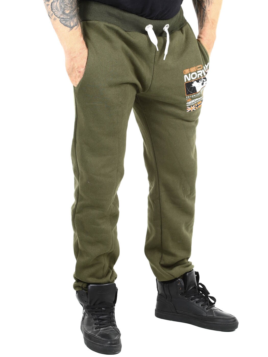 Green trousers with contrasting colour print on the leg and back pocket. They have three open pockets, brushed inside and drawstring waist. Ribbed cuffs at the waist and elasticated leg ends.