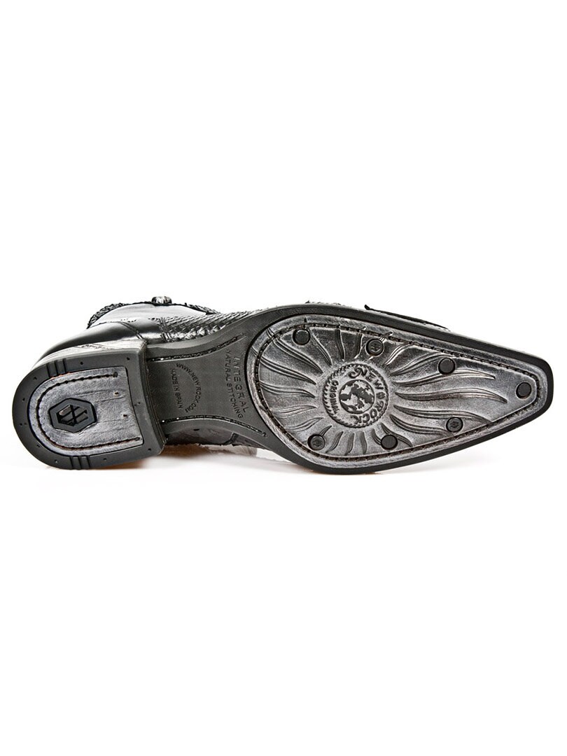 Black boots in a cowboy/rock style with metal details. They have skull patch on the top edge and metal heel. Zipper on the inside that makes them easy to put on and take off.