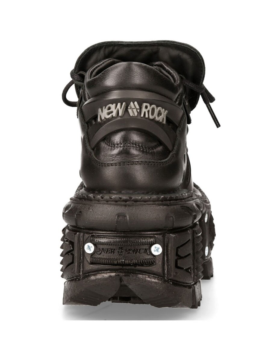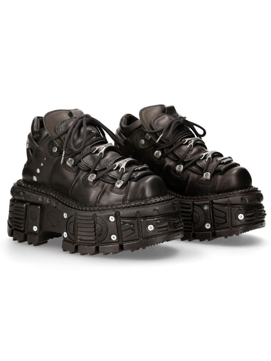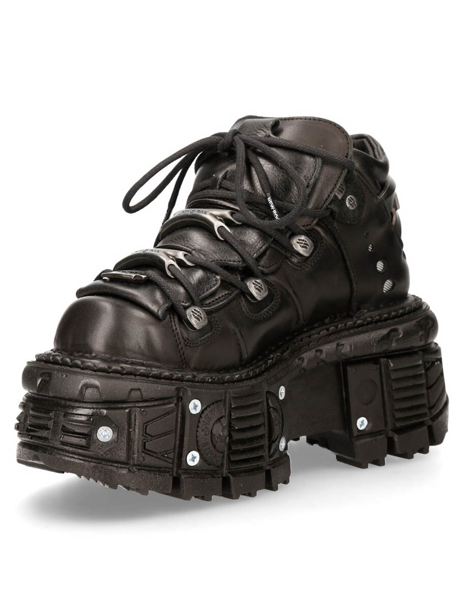 These black, chunky genuine leather shoes are a true statement piece for anyone looking to stand out. Crafted from durable leather with heavy-duty lacing and metallic details. The massive, patterned platform sole is reinforced with studs, offering both height and stability.