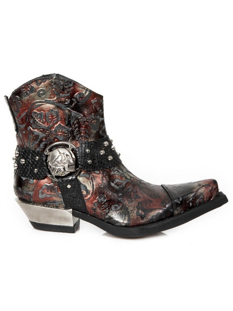 Solid genuine leather shoes with a slightly higher shaft, low heel and pointed toe. Metal buckle with a skull around the ankle and red pattern in the leather. The heel has a metallic coating that highlights the rock design.