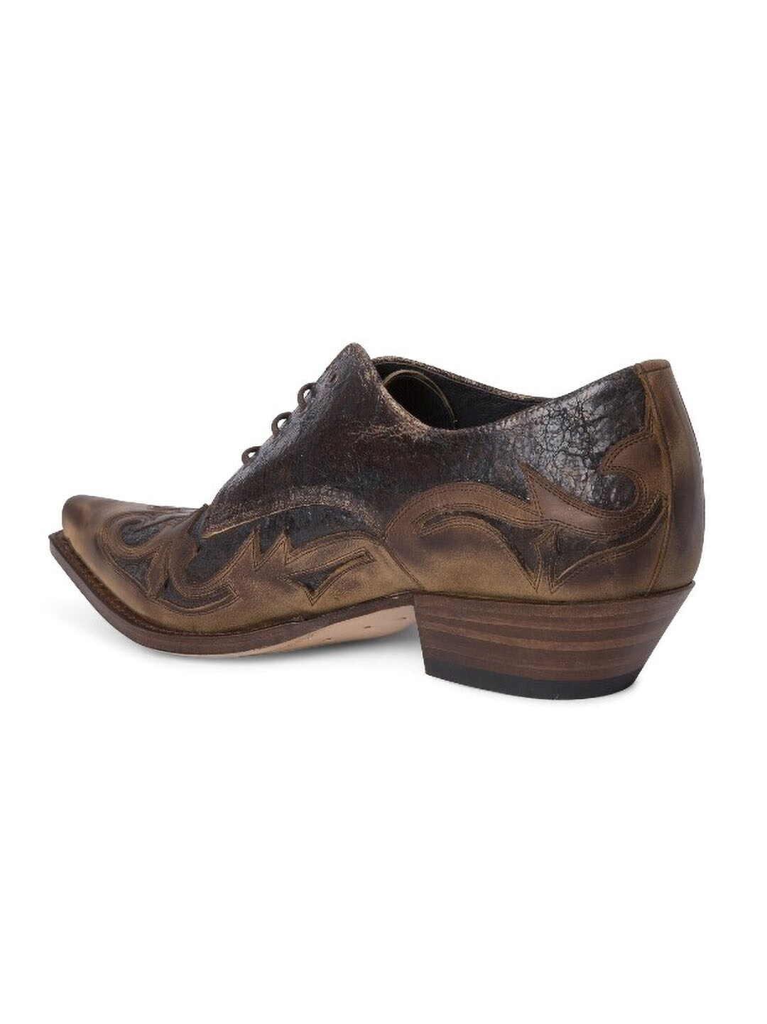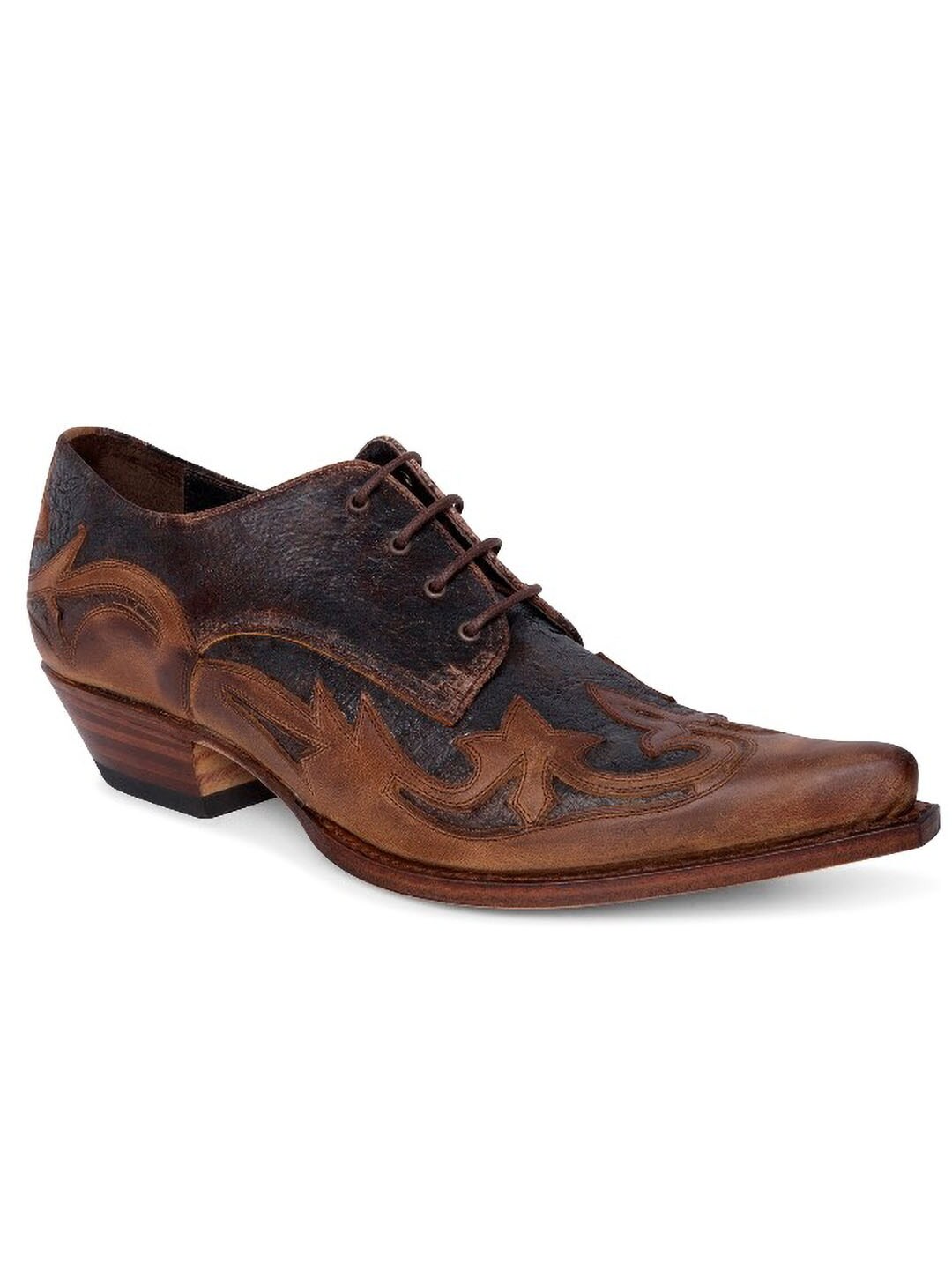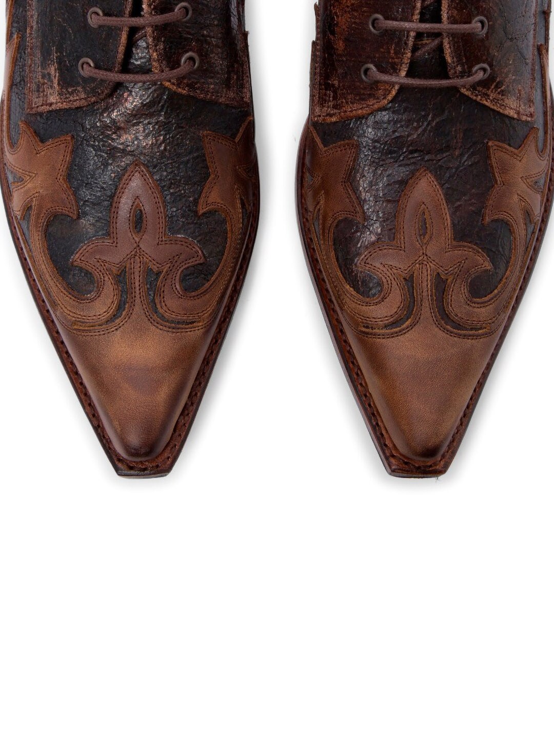 A unique shoe crafted from rustic, aged cow leather featuring two shades of brown that create a natural vintage appearance. The profiled shape and cut-out details provide a distinct western-inspired look. The sole is made of Spanish calfskin, and the shoe is handcrafted using the traditional Goodyear Welt system — one of the most durable and prestigious constructions in shoemaking. The result is a shoe with impressive longevity, stability, and comfort that molds to your foot over time. Perfect for those who value something robust, elegant, and full of character.