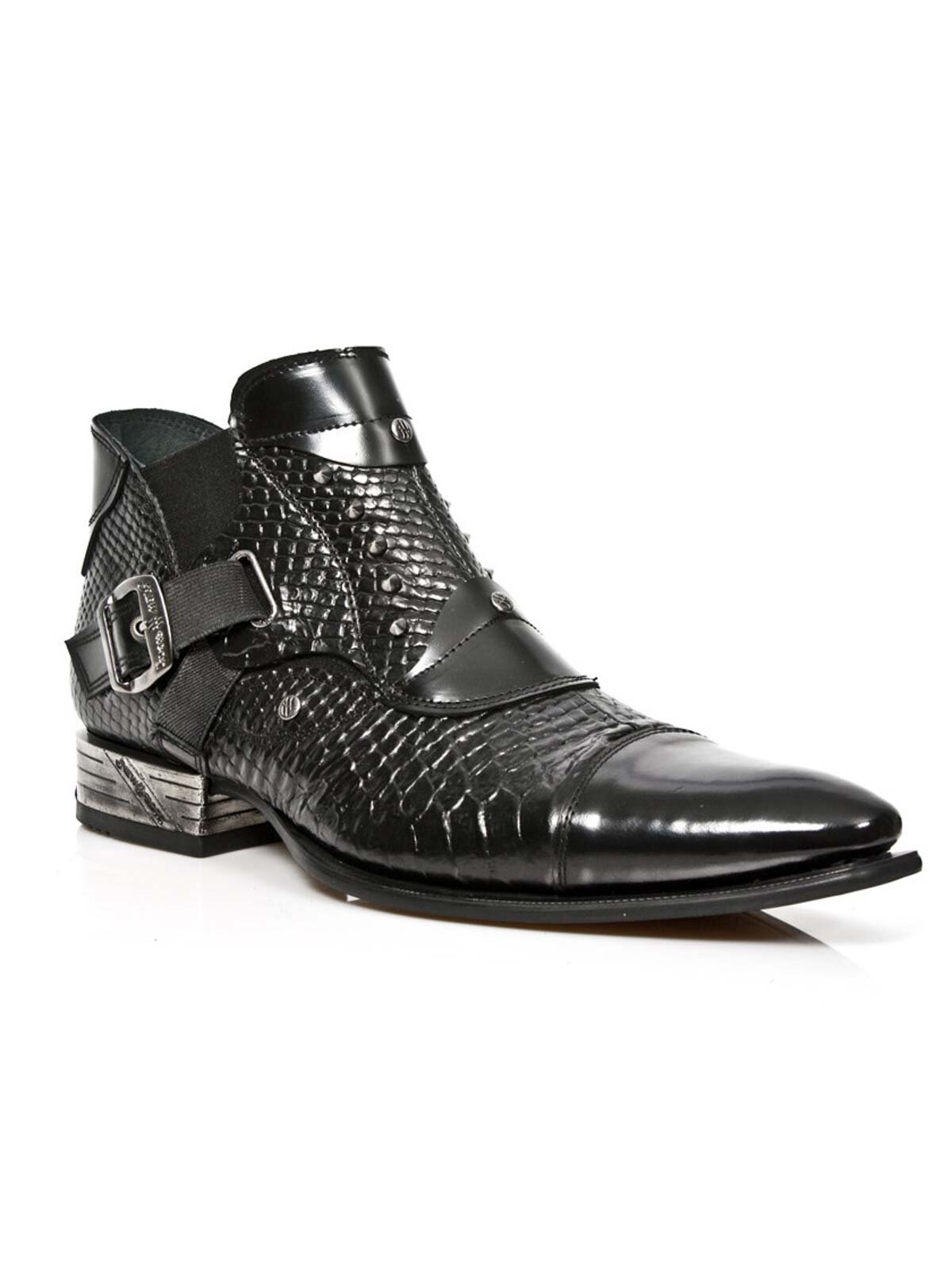 Black leather boots with pattern and low shaft. Detailed with studs and elastic straps with metal buckle. Elasticated shaft opening on both sides for easy on/off. This unique shoe is available in a limited edition!