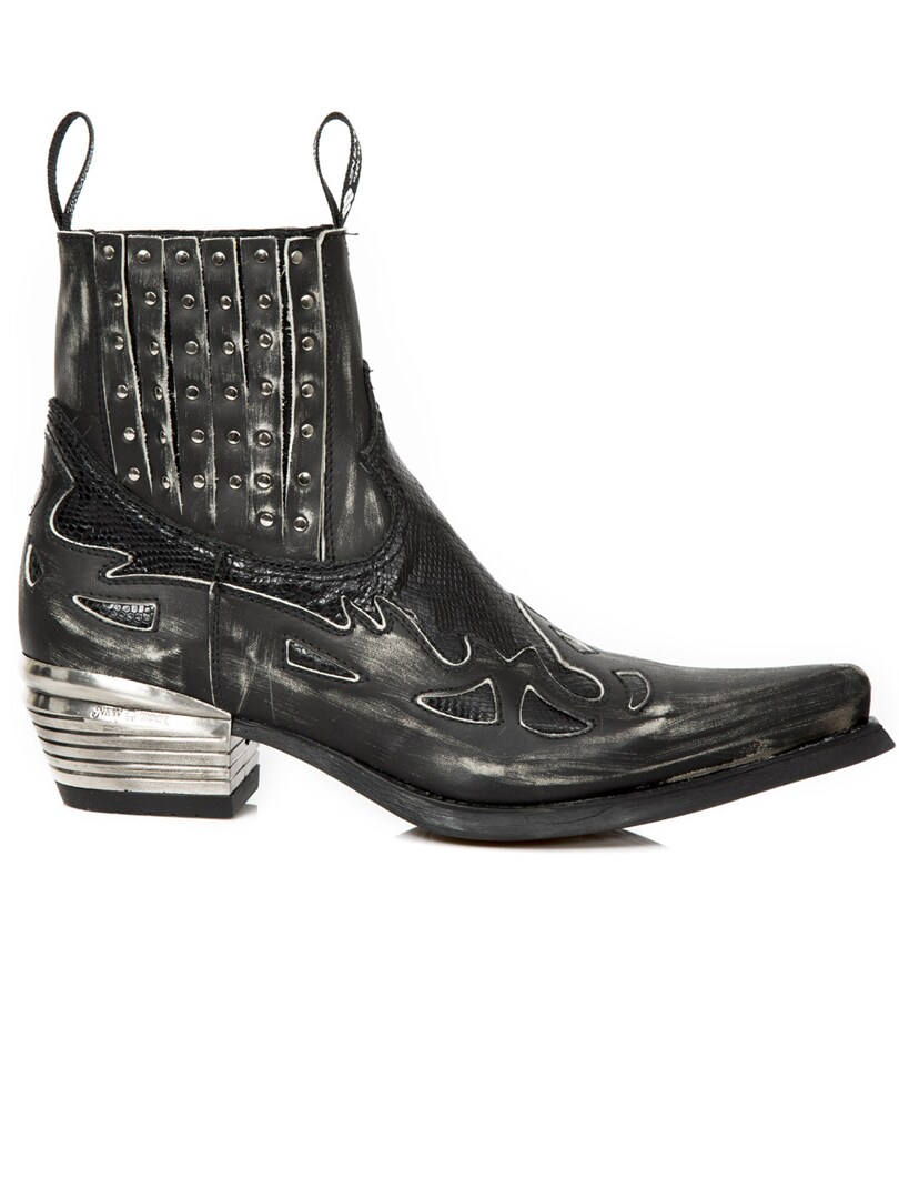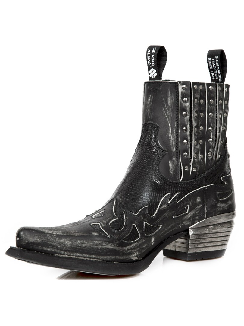 Black boots in a cowboy/rock style. The shoes are made in Spain from 100% genuine quality leather. All New Rock shoes are handmade in a limited edition which makes each shoe unique. Rubber sole with strong metal heel.