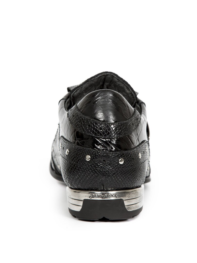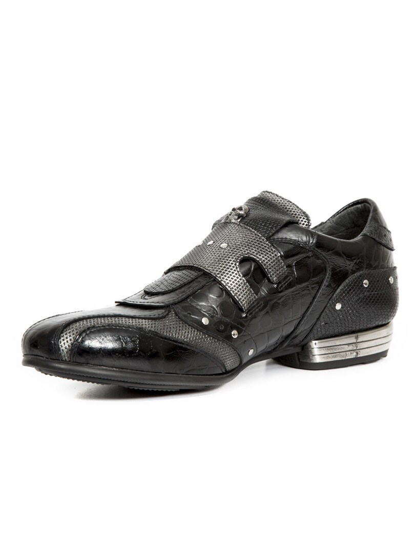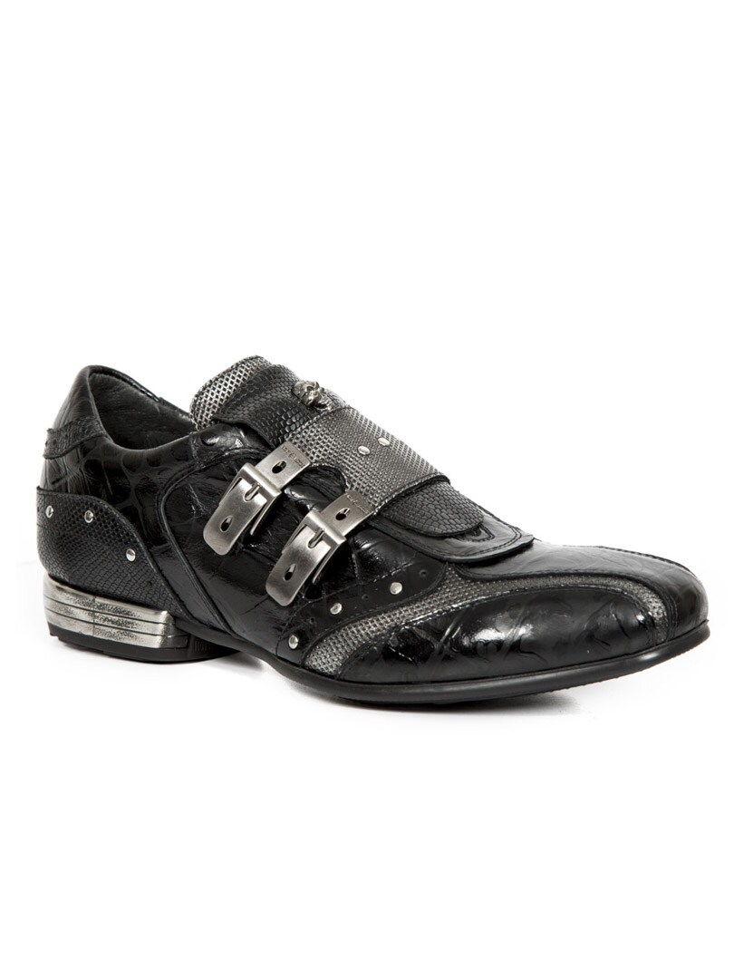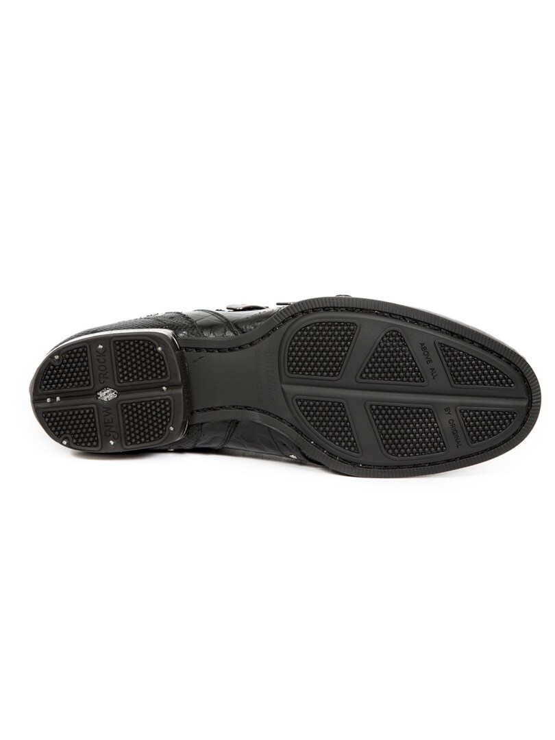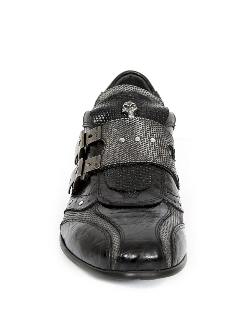 Black genuine leather boots with pattern and low shaft. Detailed with grey panels, rivets and a leather strap with two metal buckles. Skull patch on the front of the shoe. This unique shoe is available in limited edition!