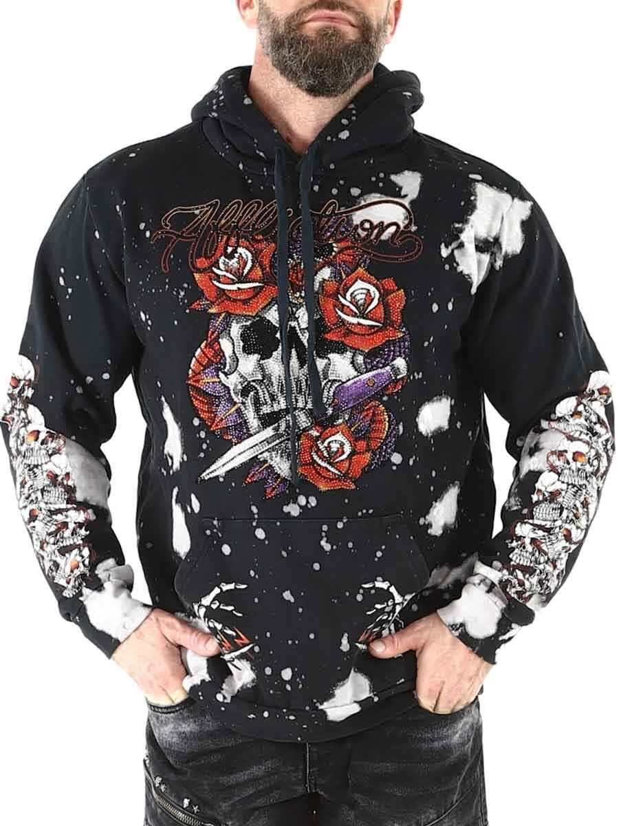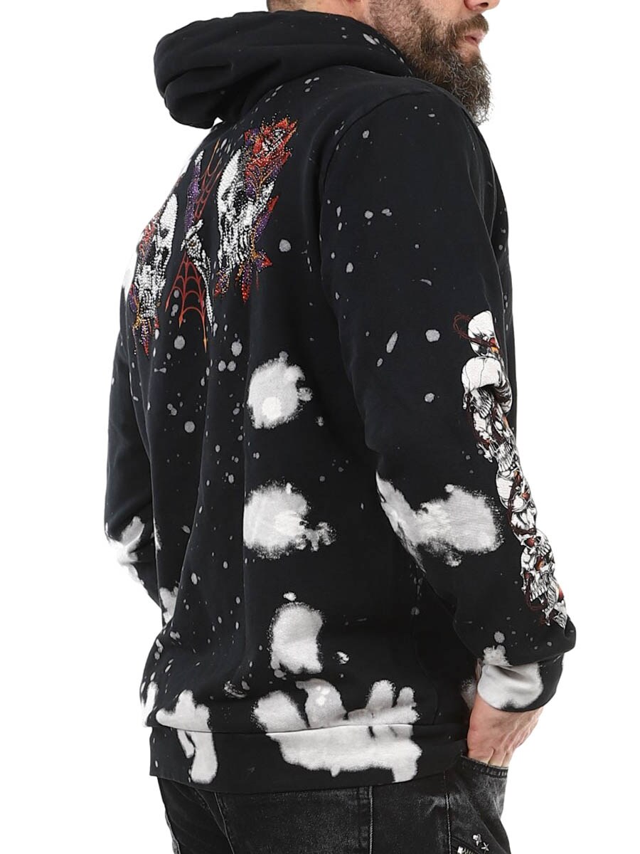 A hoodie with strong attitude and standout details. The black base is bleached in a splatter pattern and decorated with large graphic designs. It features a classic kangaroo pocket, adjustable hood, and ribbed cuffs for comfort and fit. Perfect for those who want a hoodie with bold rock character and plenty of expression.