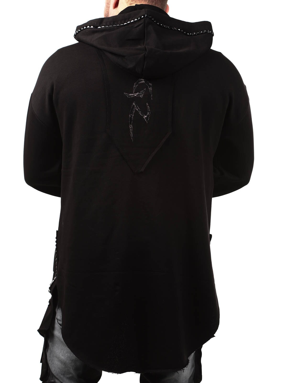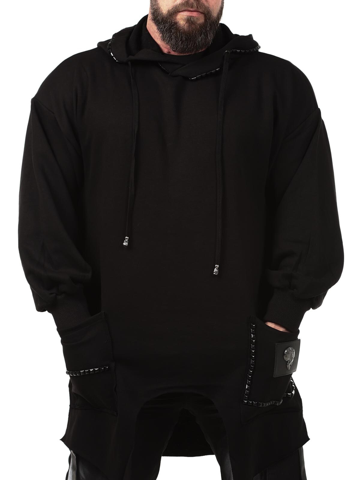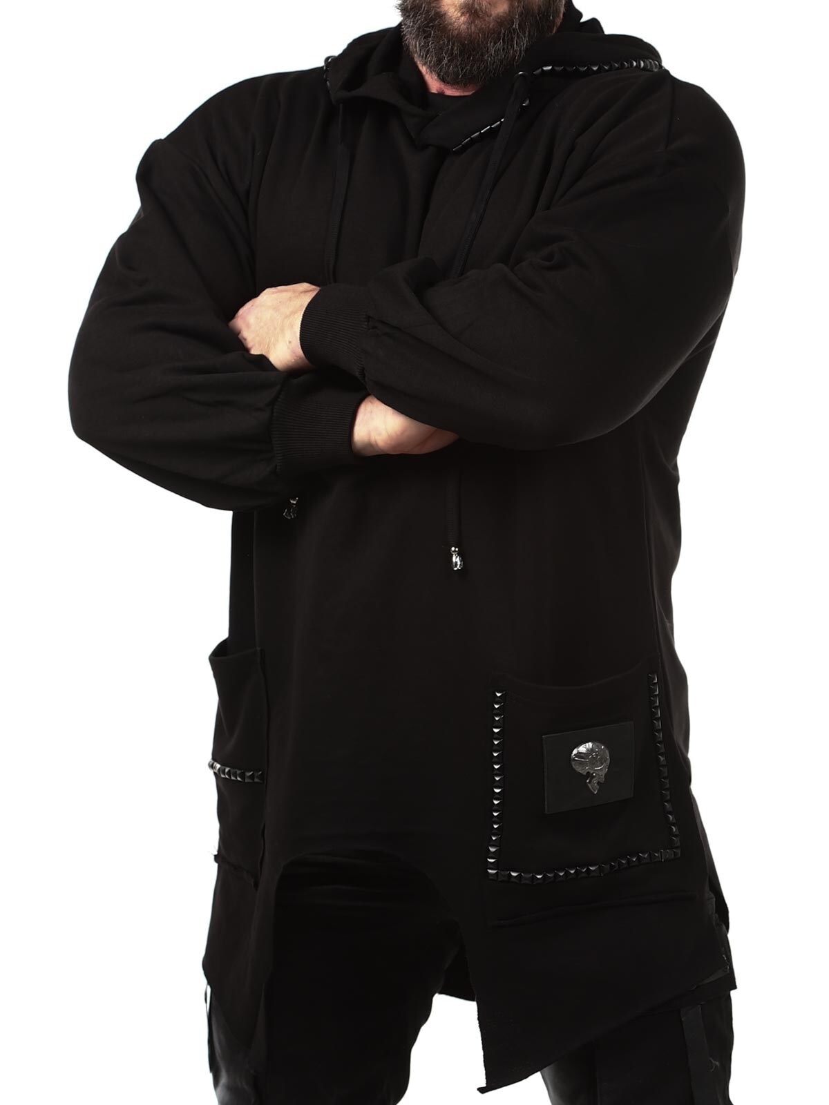 Hoodie in a longer style with cutout at the bottom. Detailed with black studs, patch and embroidered logo on the back. It has a drawstring hood and two open front pockets.