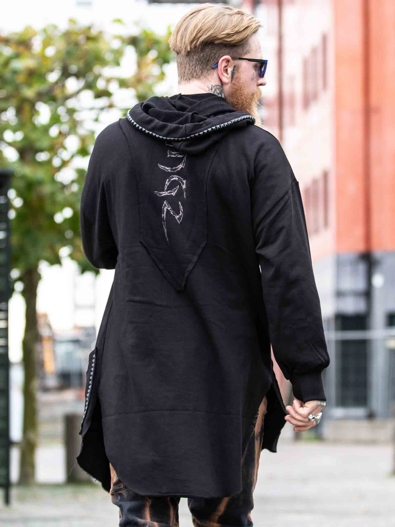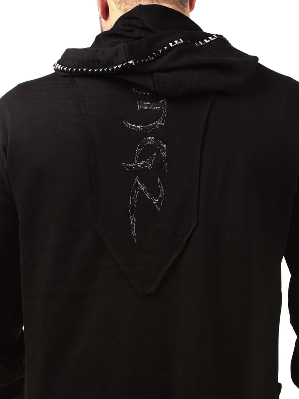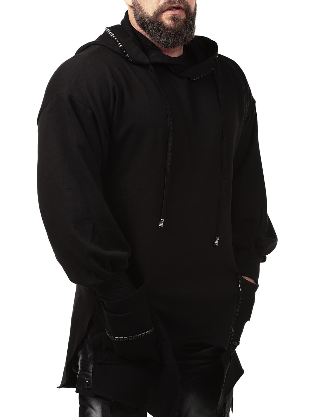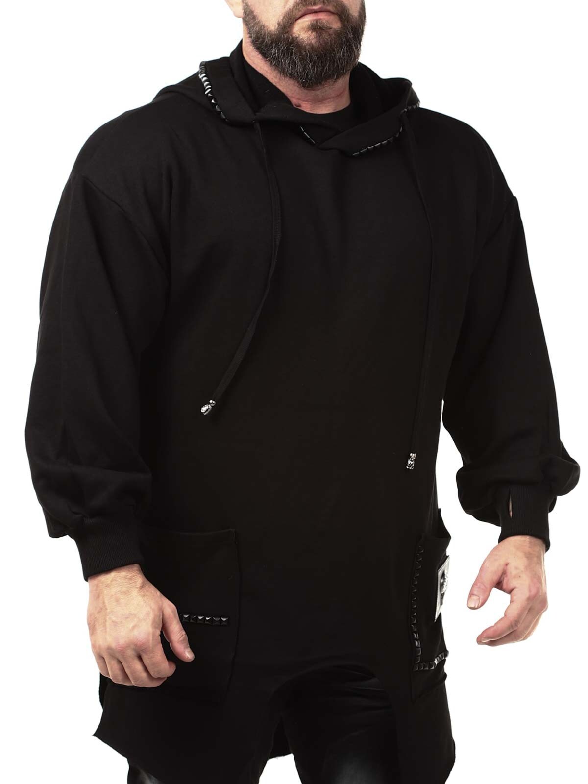 Hoodie in a longer style with cutout at the bottom. Detailed with black studs, patch and embroidered logo on the back. It has a drawstring hood and two open front pockets.