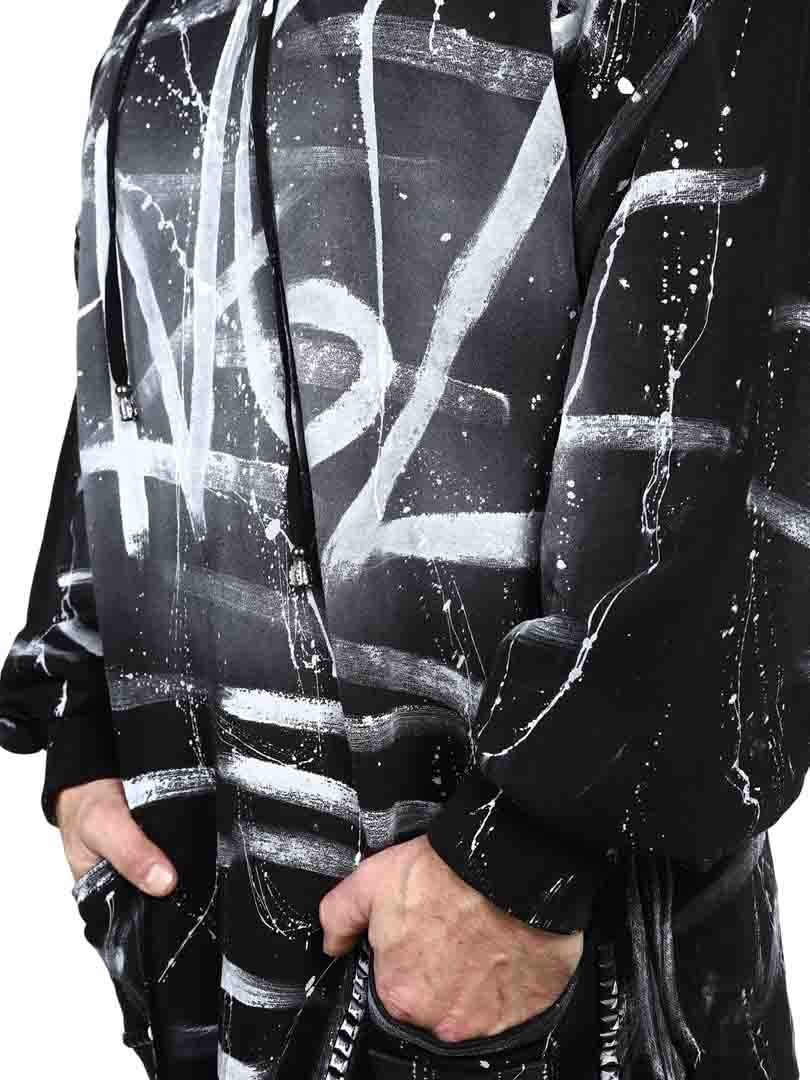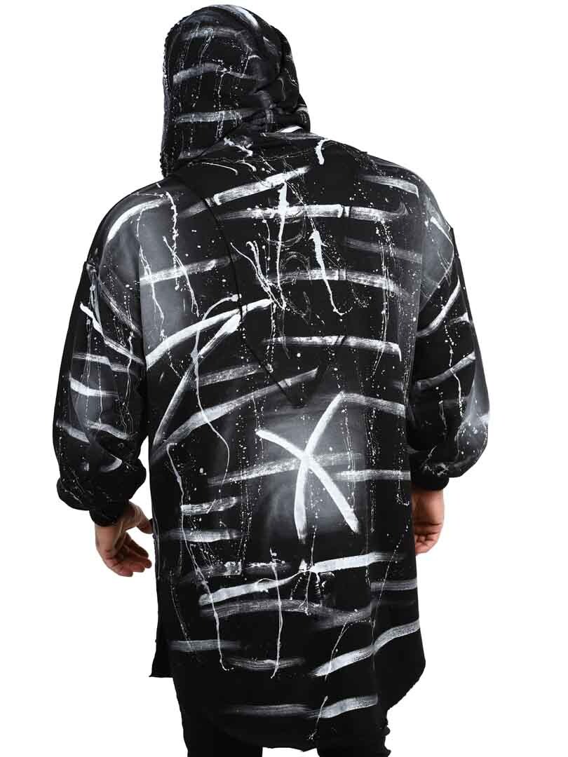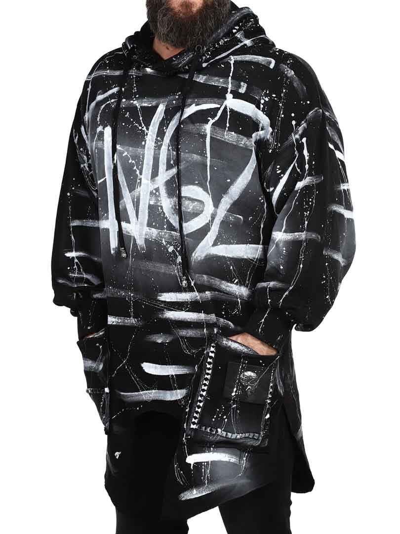 Hoodie in a longer style with cutout at the bottom. Detailed with black studs, patch and embroidered logo on the back. It has a drawstring hood and two open front pockets.