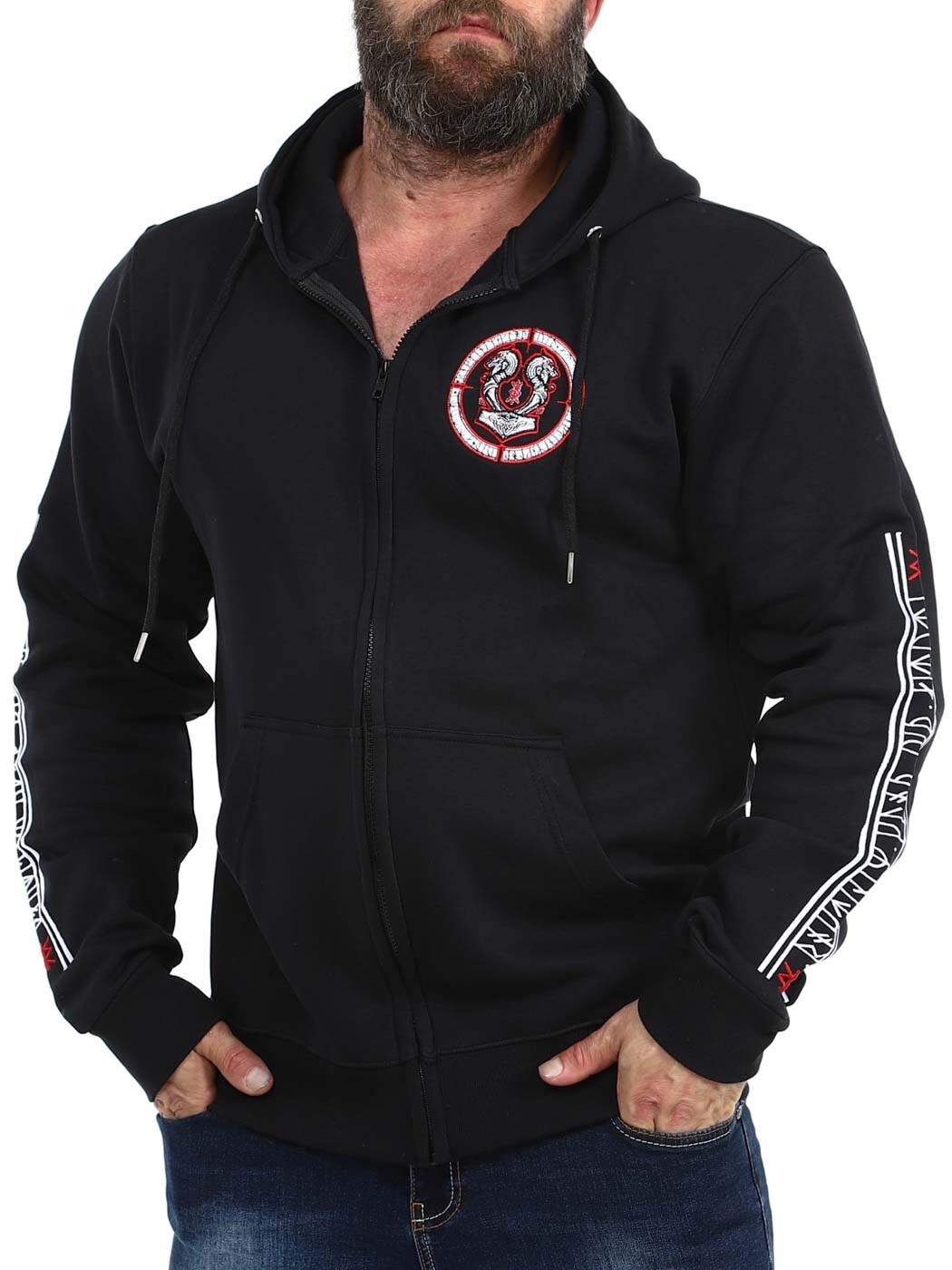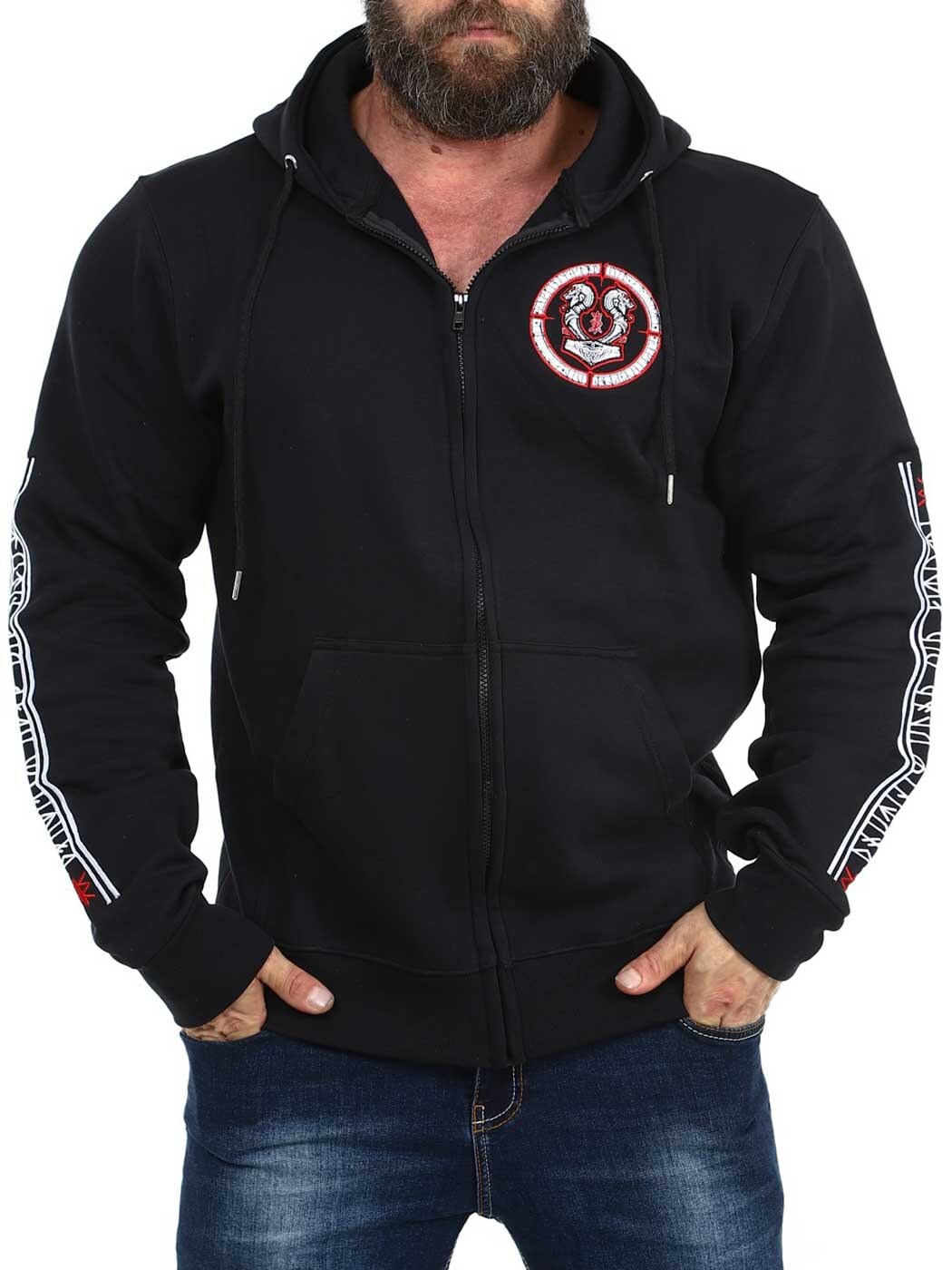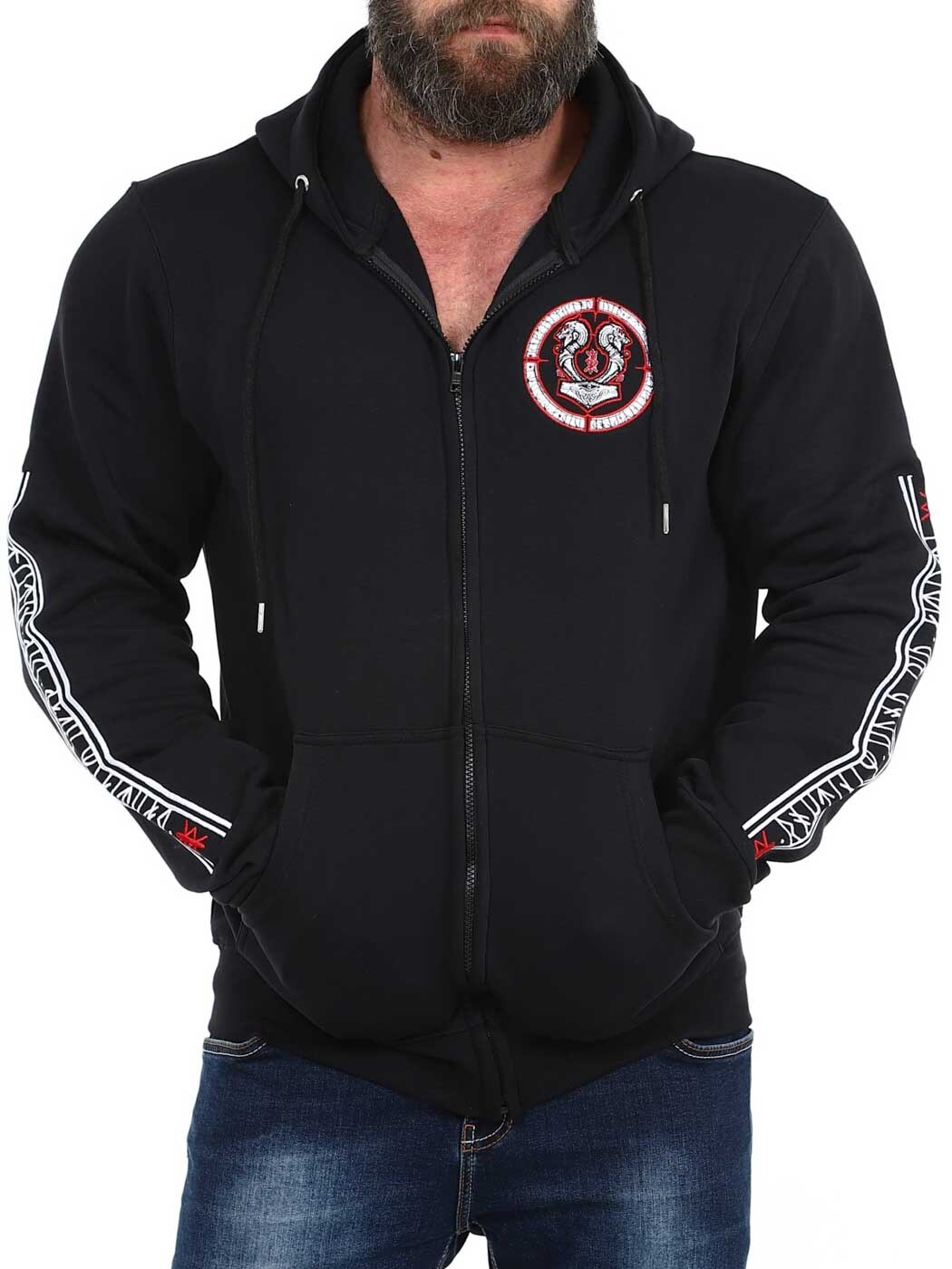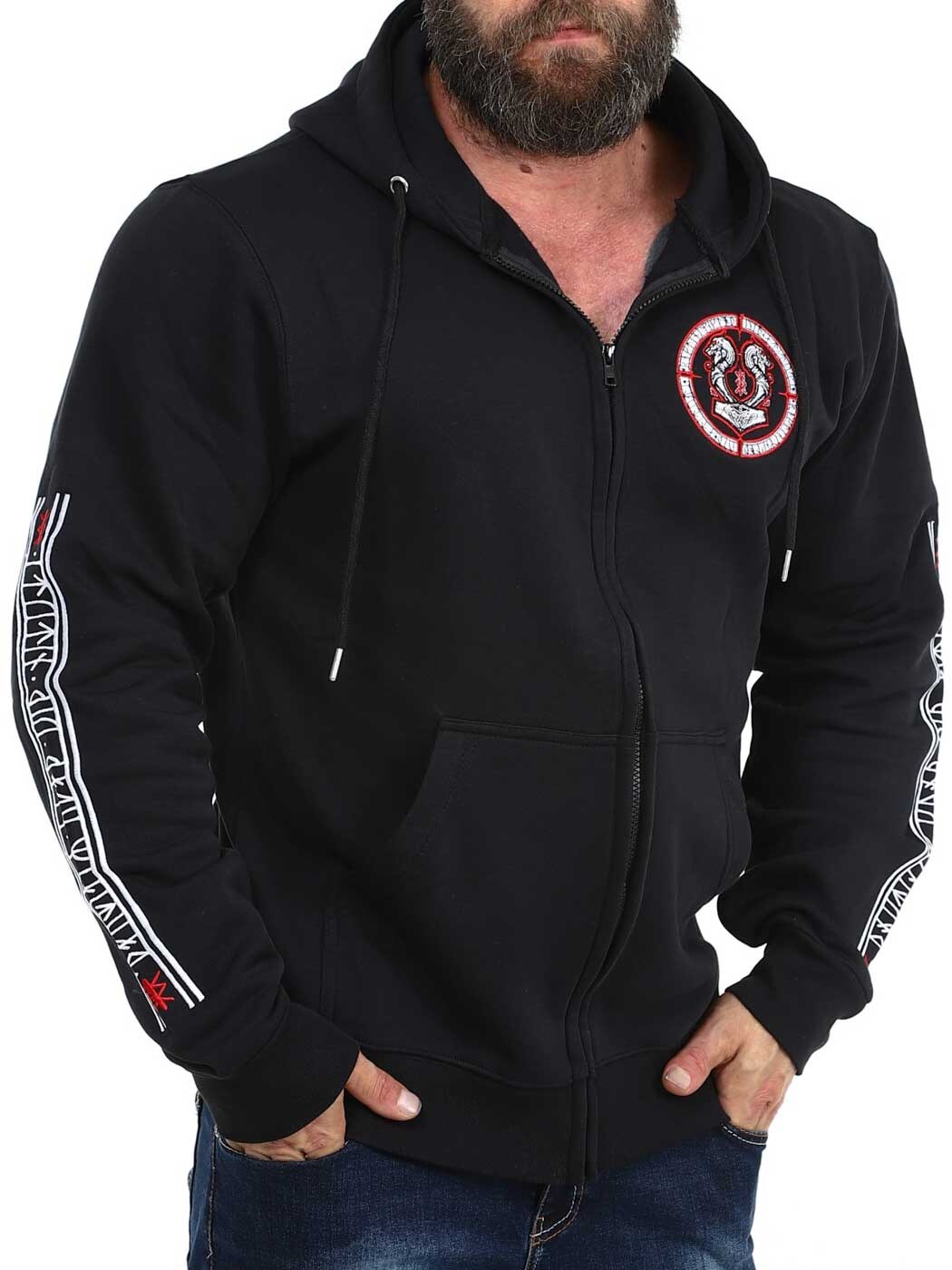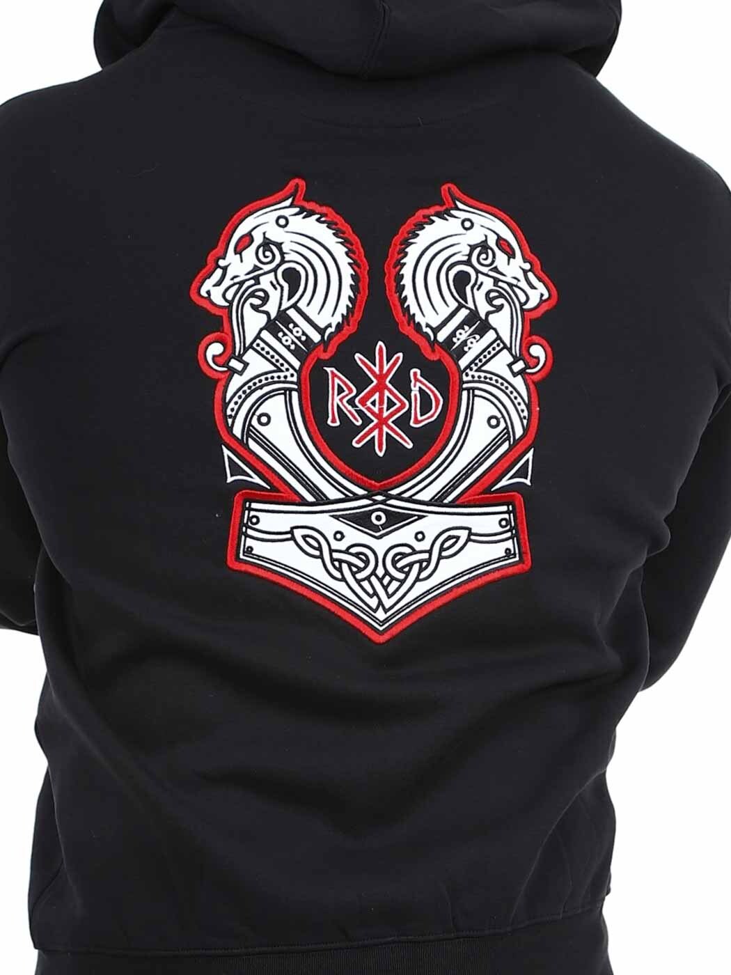 Hoodie with zipper and Viking-inspired motifs. It has two front pockets and ribbed cuffs at the ends. This unique hoodie is only available at RockDenim!