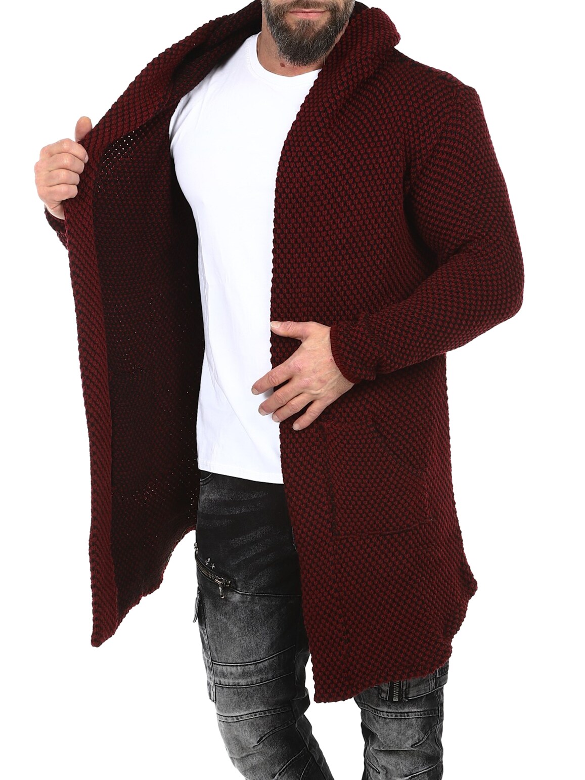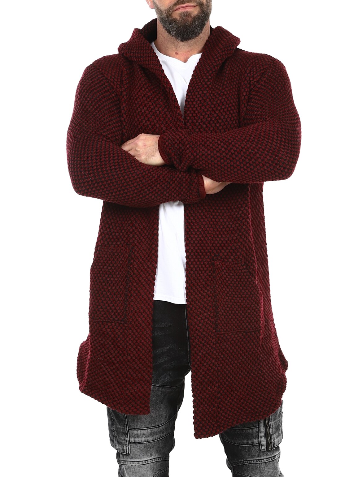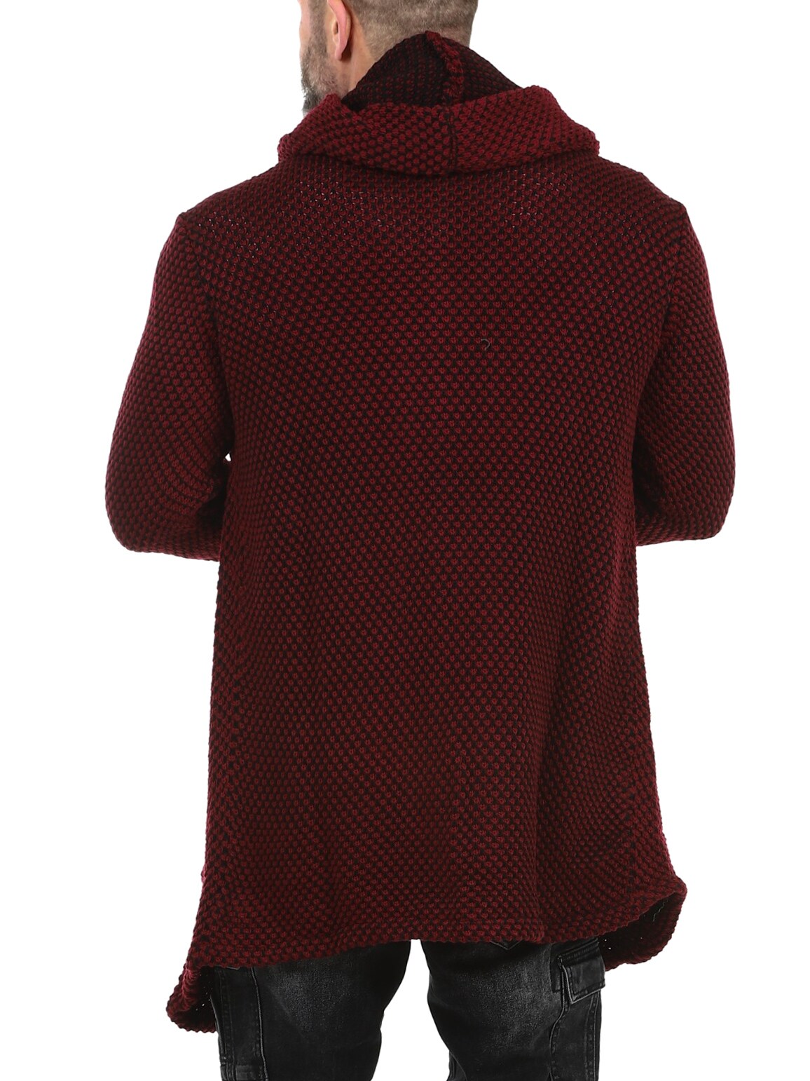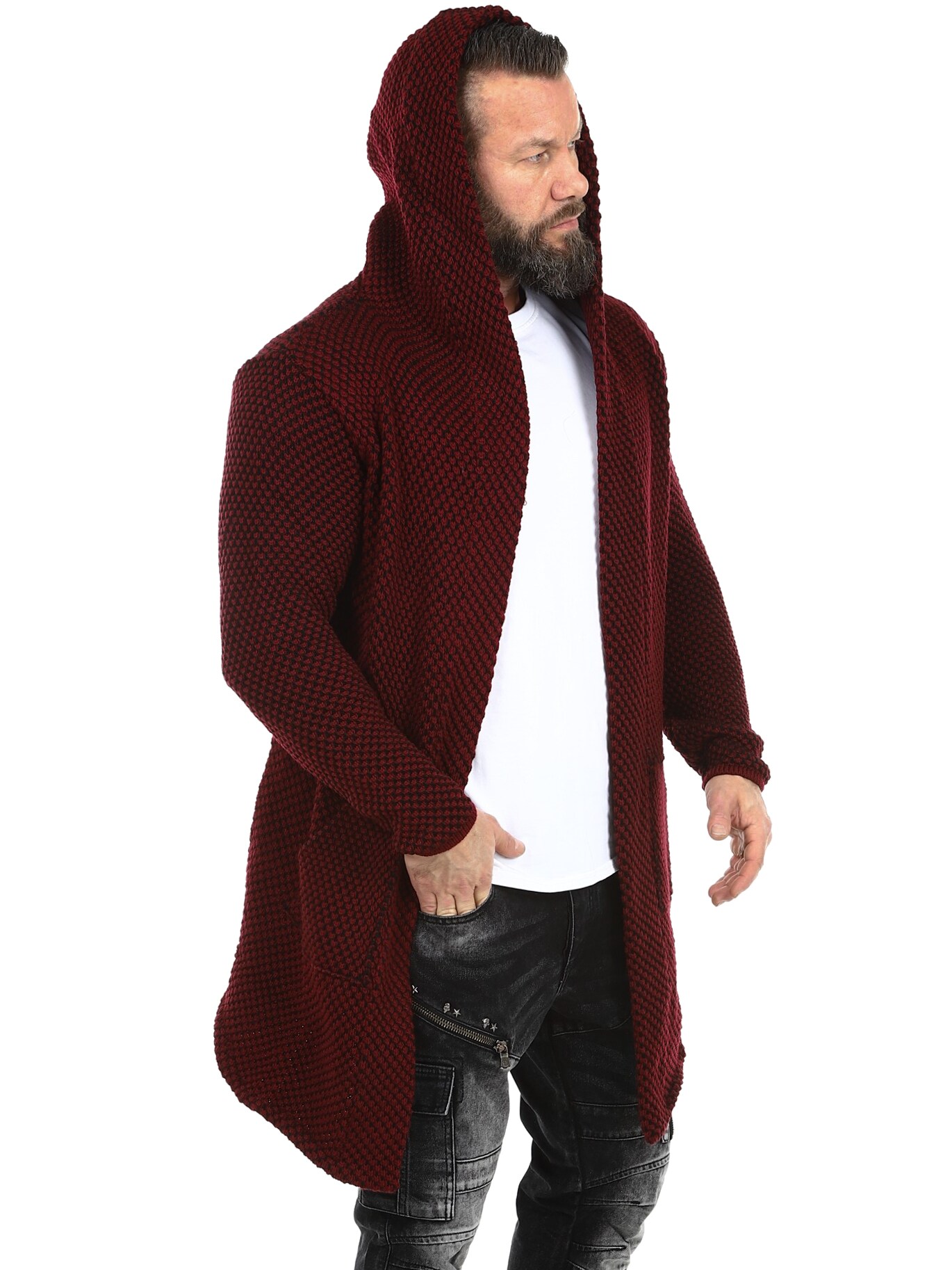 A chunky knitted jumper with a stylish pattern. Long and stretchy model with spacious hood and pointed cut at the front. Made of comfortable and warming material.