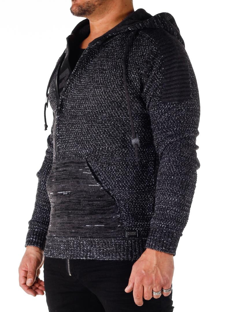 Hoodie in knitted stretch with rips on the sides that give a masculine look. Unique front zipper that goes down over the chest and hidden letters in knitwear that are visible when the zipper is open. Thick, comfortable hood with drawstring and front through pocket. Available in more colors!
