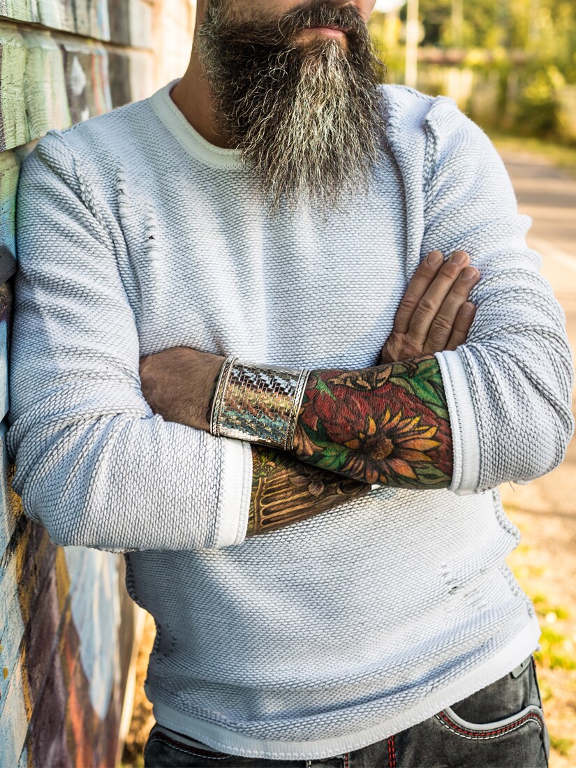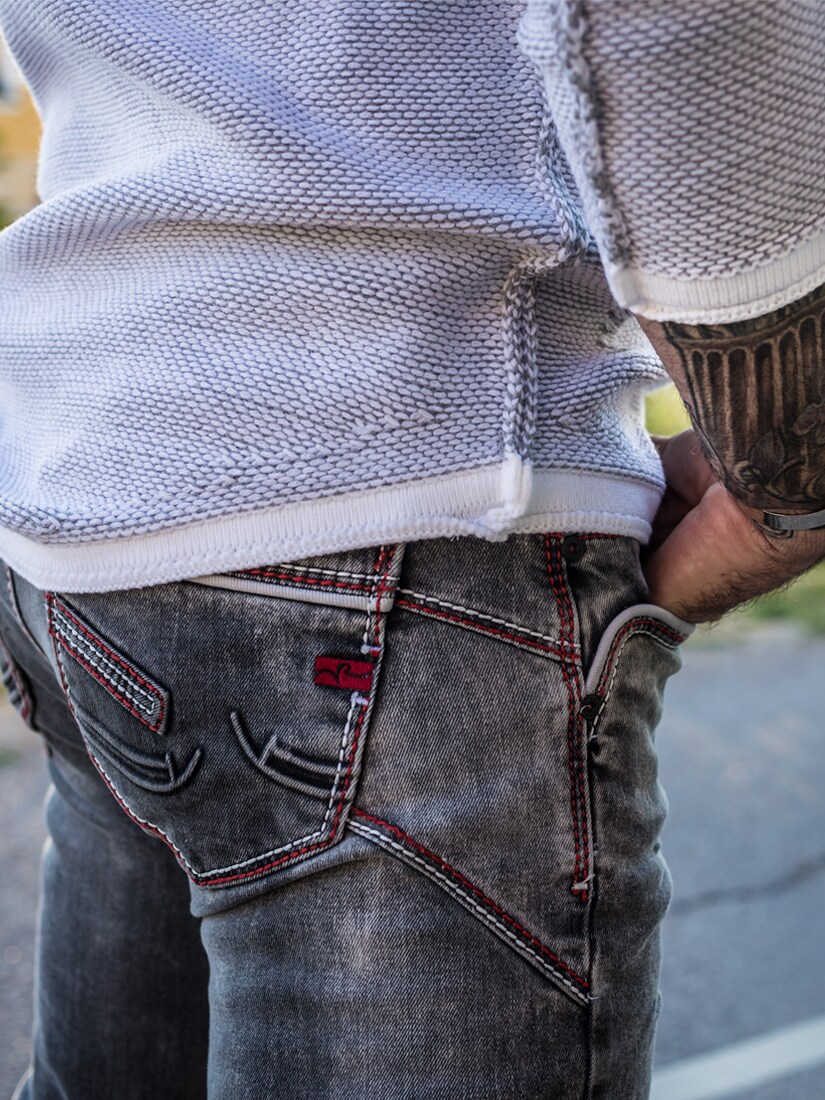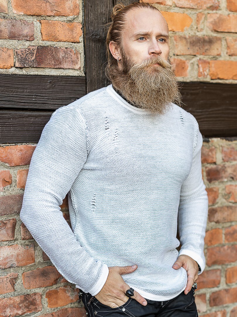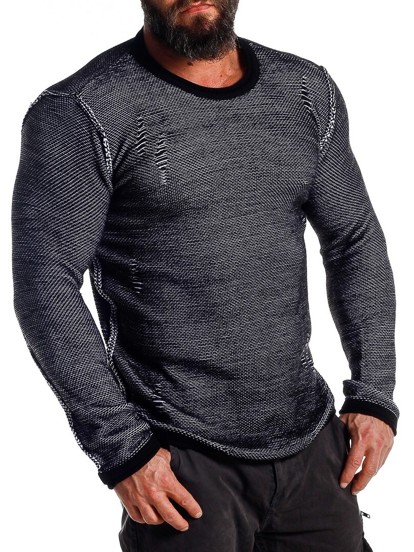 A masculine sweater that combines clean design with raw attitude. The knitted texture together with distressed details at the shoulders, sides, and sleeves gives the garment a tough and modern look. It features a crew neckline and a comfortable fit, making it easy to pair with both jeans and more dressed-up trousers. Perfect for those who want a sweater with strong character and standout details!