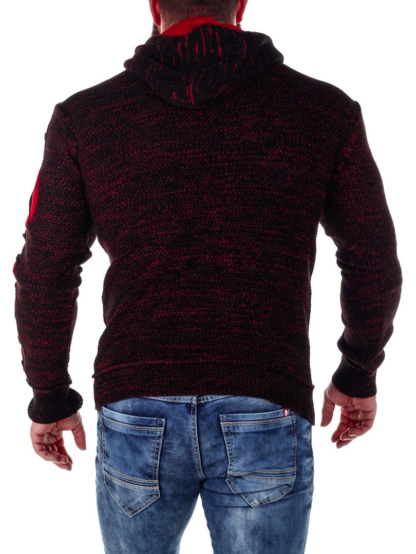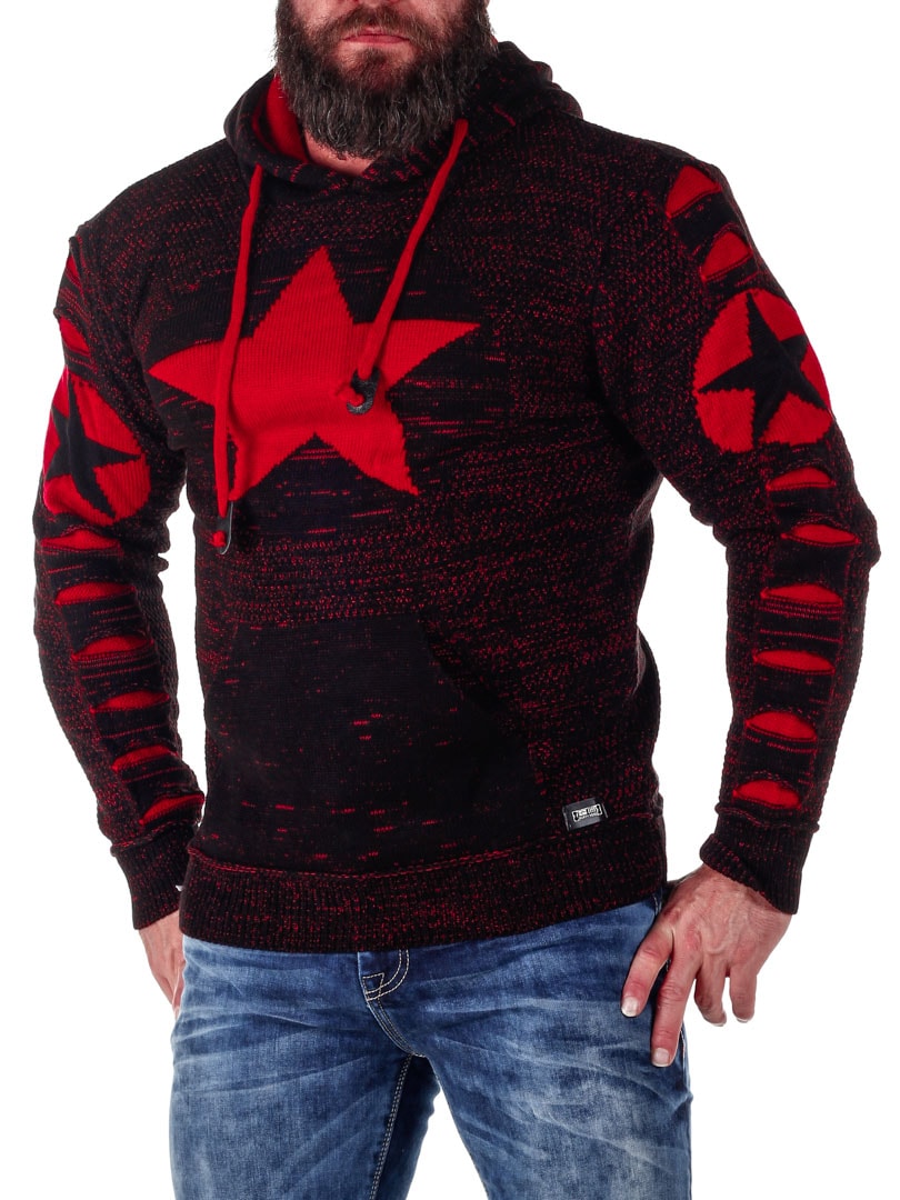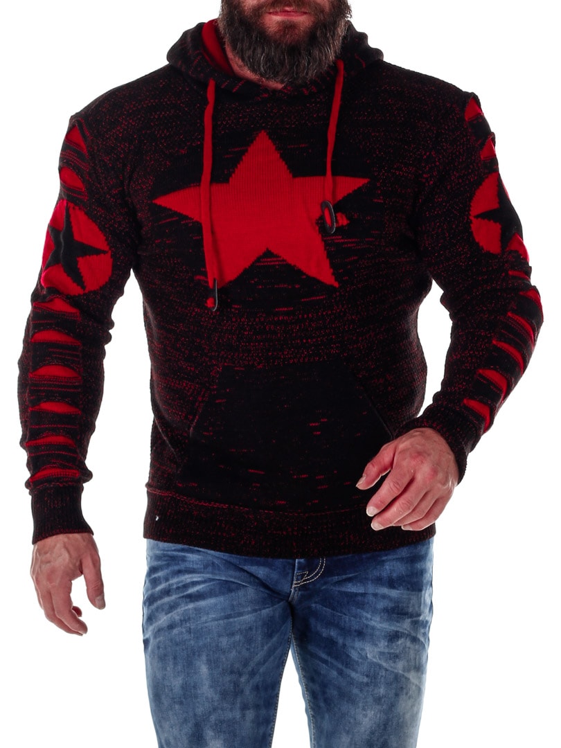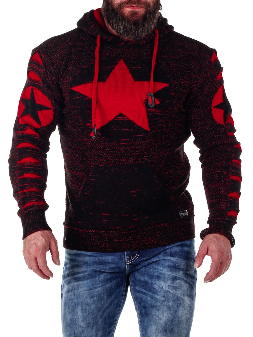 Comfortable and warm knitted hoodie featuring a large front pocket and an adjustable hood. Designed with star patterns and red distressed details.