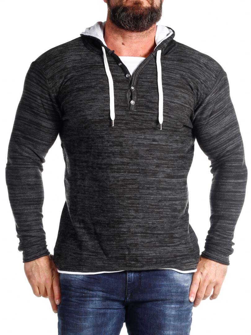 Black and gray sweater with white details. It features buttons at the neckline and drawstrings in the hood. Made from a lightweight and comfortable material.
