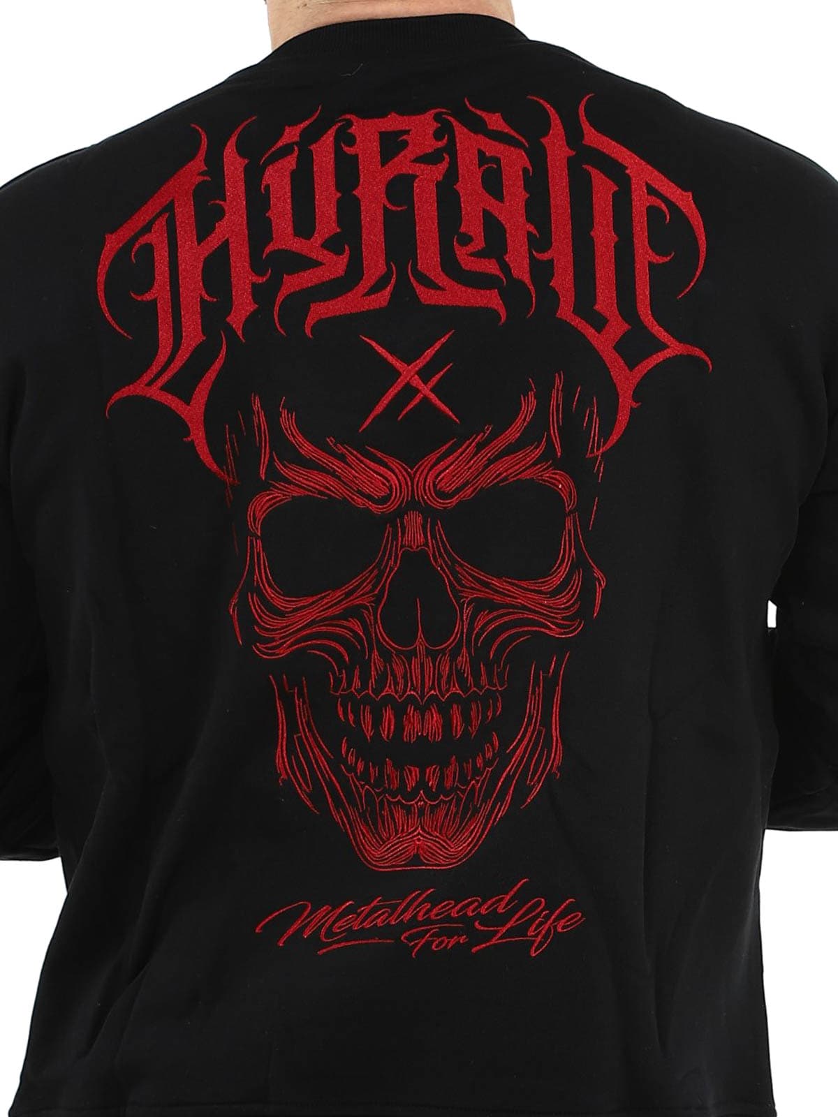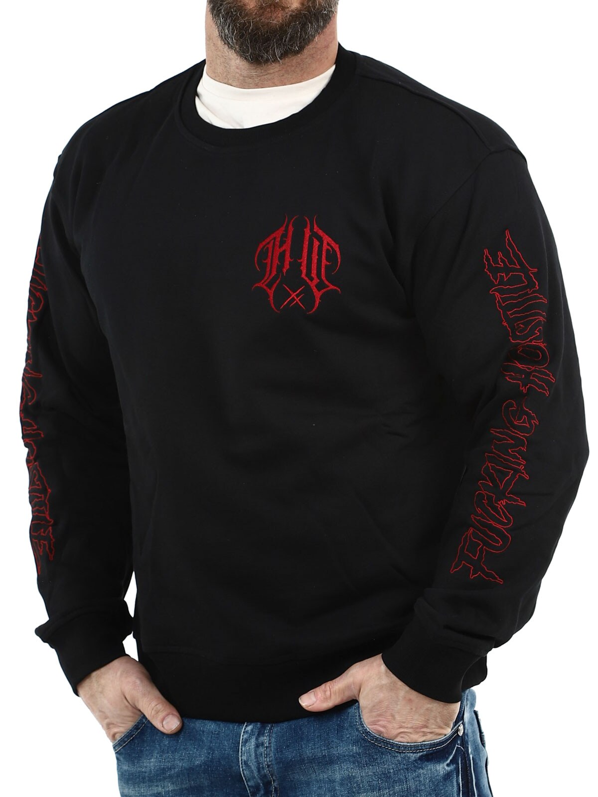 Black sweatshirt designed with red embroidered prints on the chest, back and sleeves. It features a round neckline and ribbed cuffs. A cool sweatshirt that works equally well for everyday wear or a more alternative streetwear look.