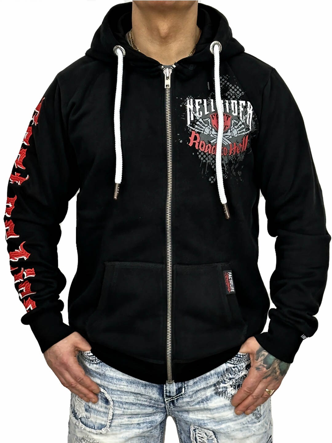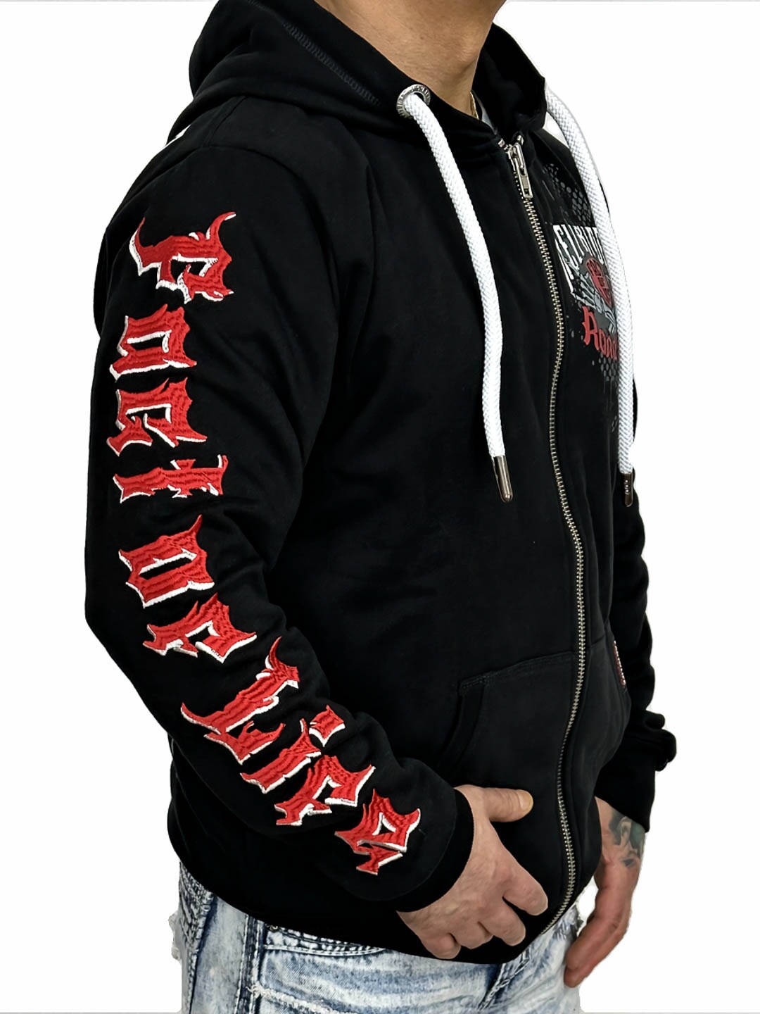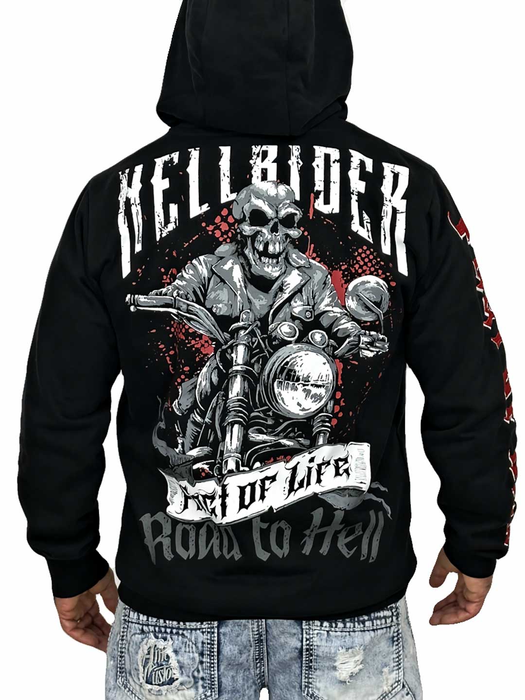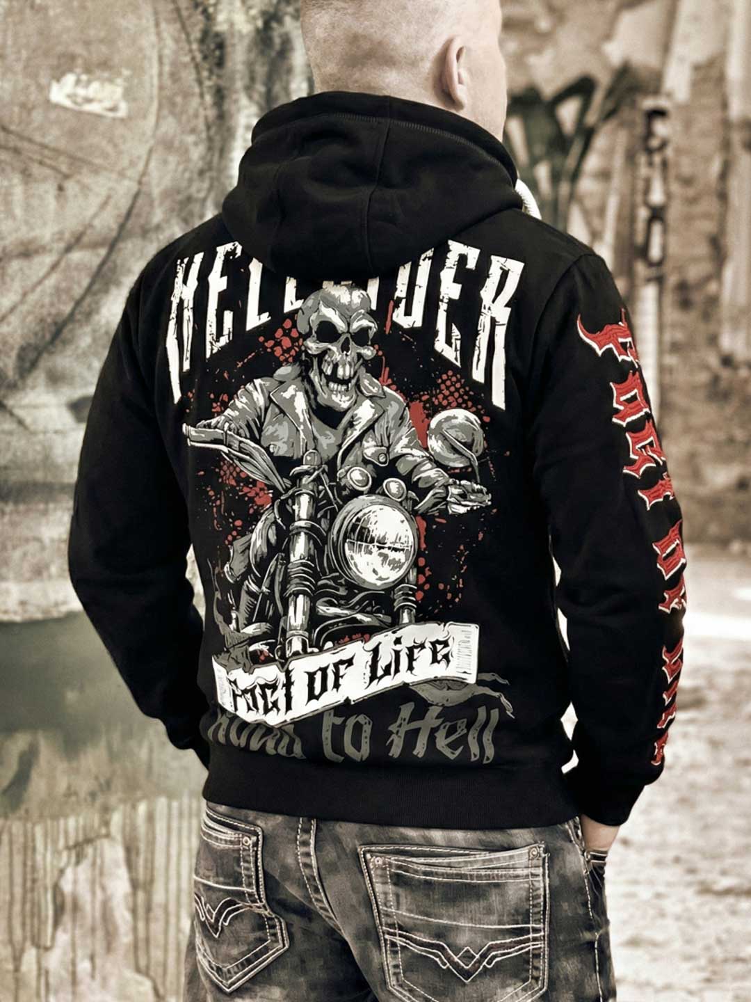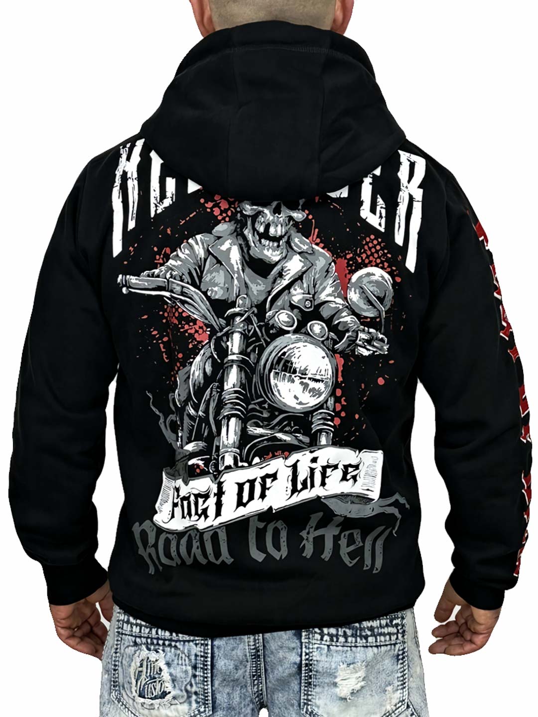 A bold hoodie with strong attitude and large graphic prints that create a powerful biker-inspired look. The model features a front zipper, a hood with contrasting drawstrings, and classic kangaroo pockets, making it both comfortable and practical. Perfect for those who want a hoodie with a rock vibe and a design that stands out!
