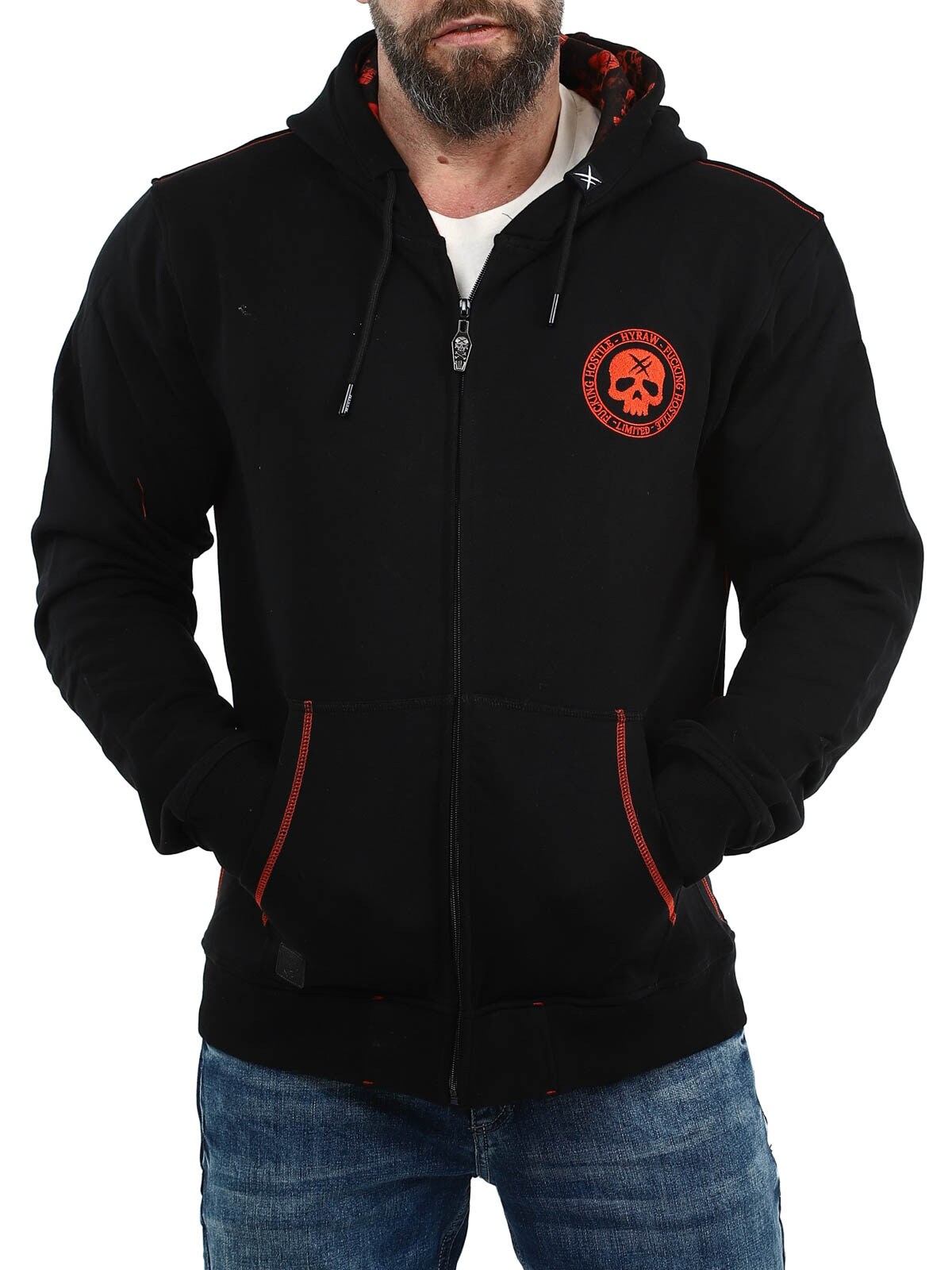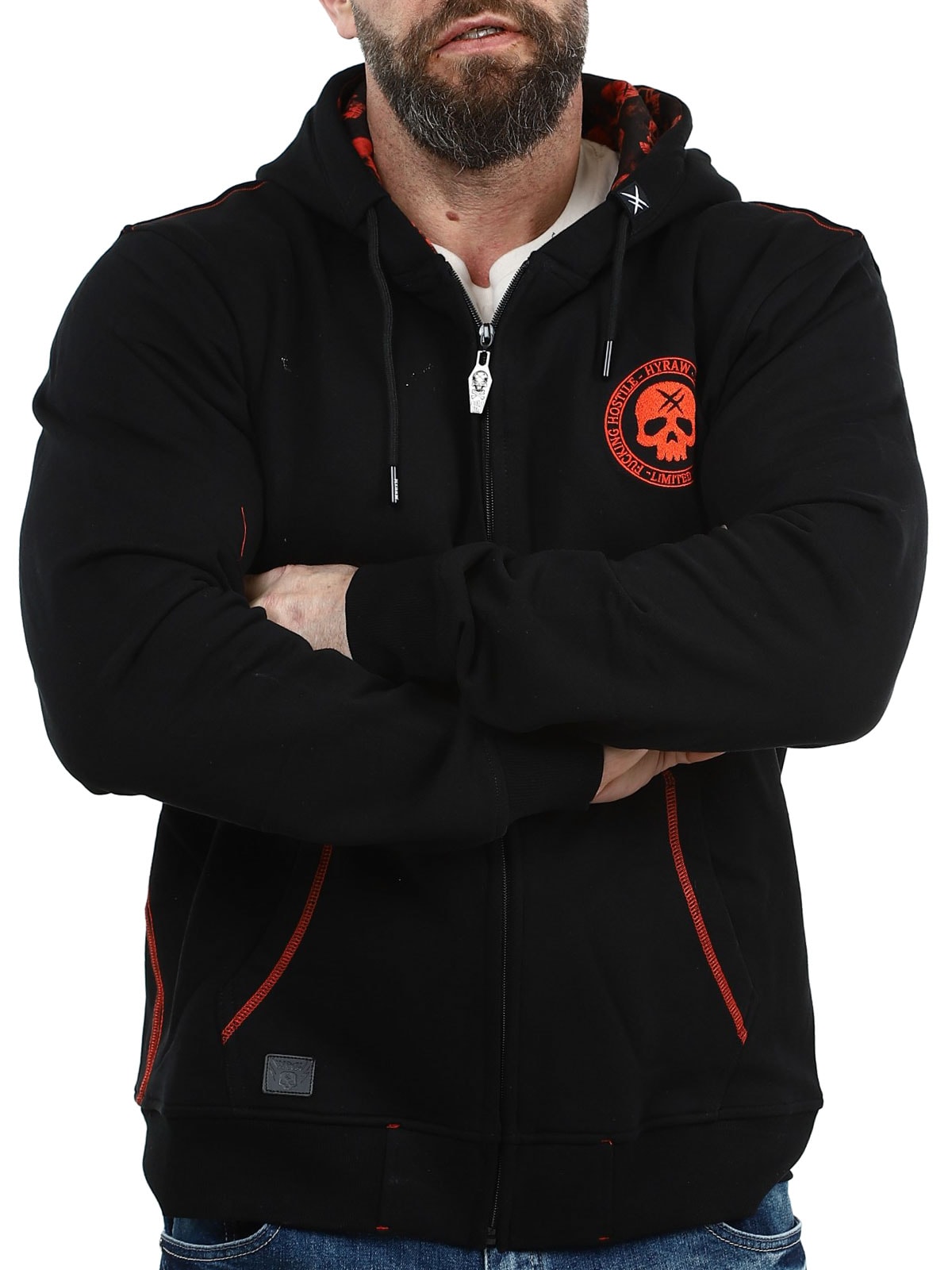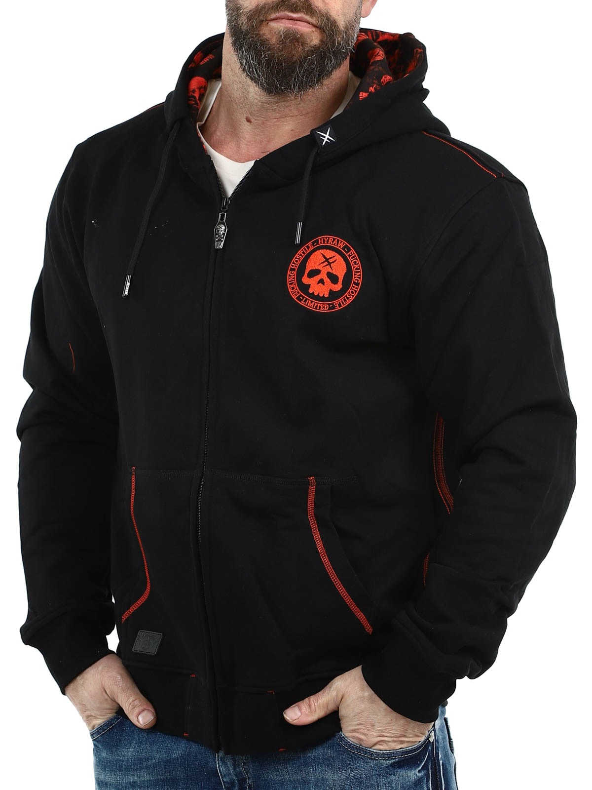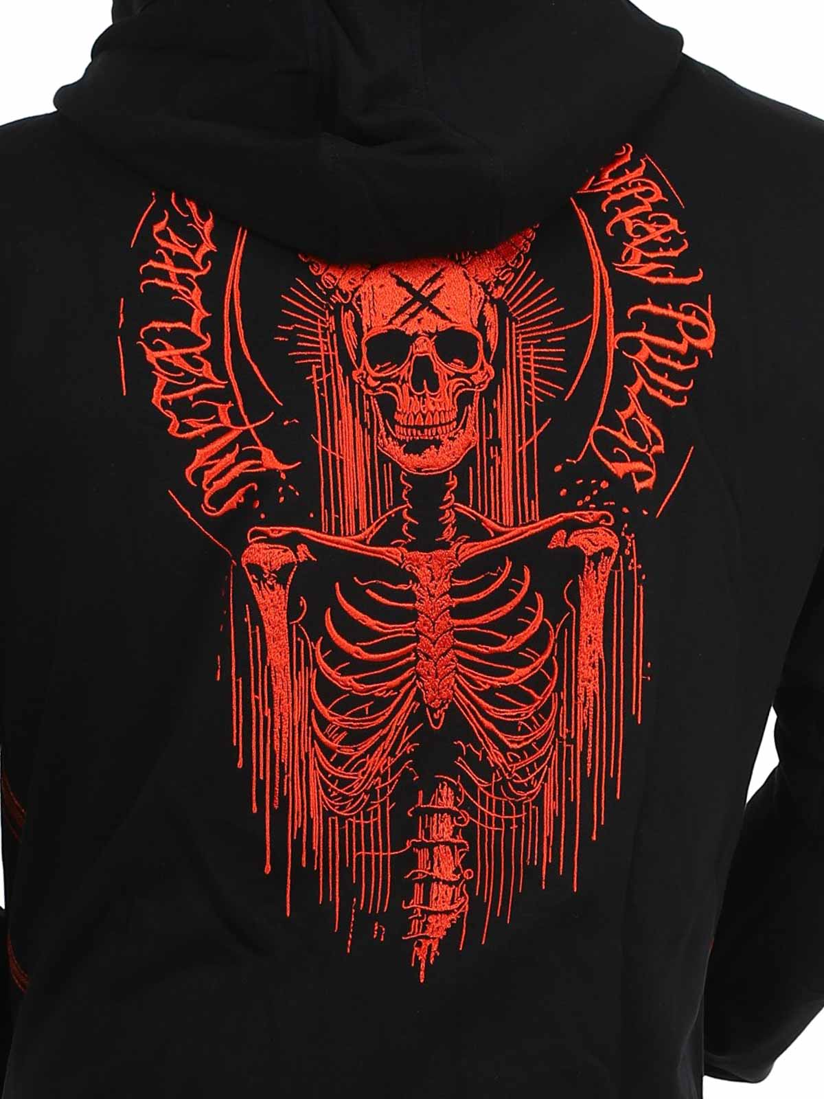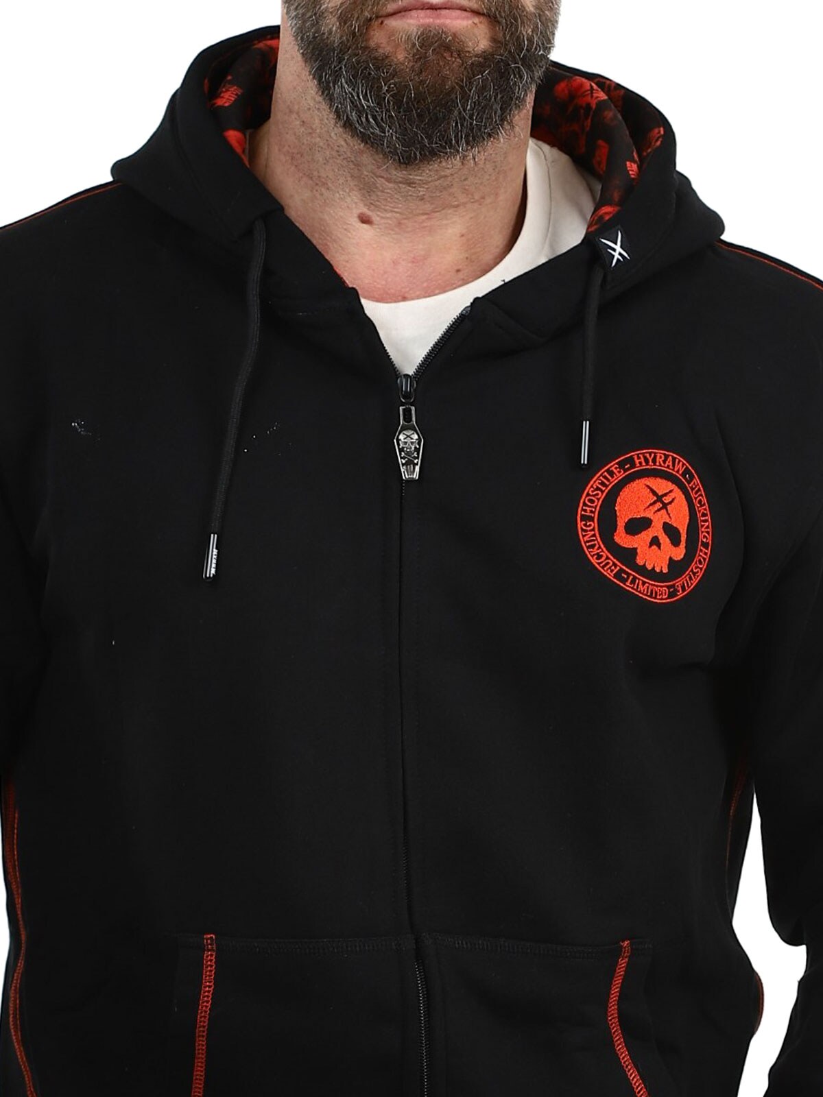 A cool hoodie designed with a large red embroidered print on the back and a smaller print on the chest. It features a hood with drawstrings and two open front pockets. The hoodie also has a unique print on the inside of the hood that really stands out when the hood is worn, giving the garment an extra cool detail.