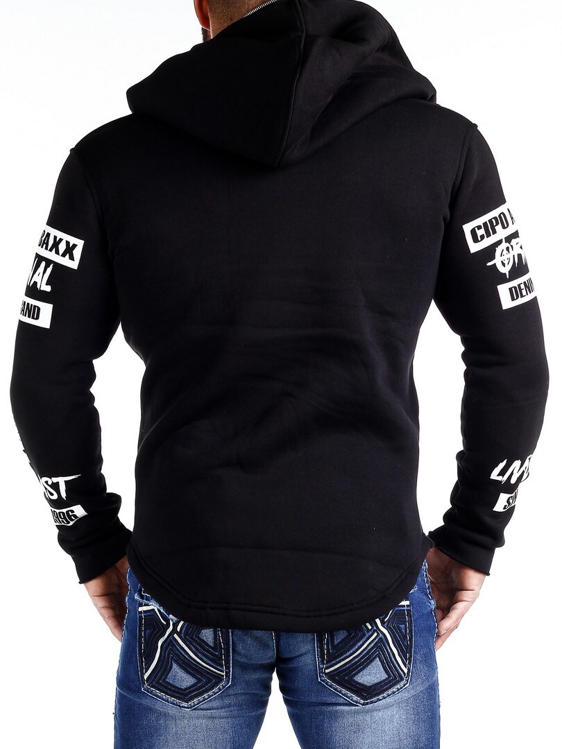 Stylish and comfortable hoodie that stands out from the crowd! The zippers are slanted and white text print is visible on sleeves and in the hood. Rounded waistband at the bottom and two pockets on the stomach.