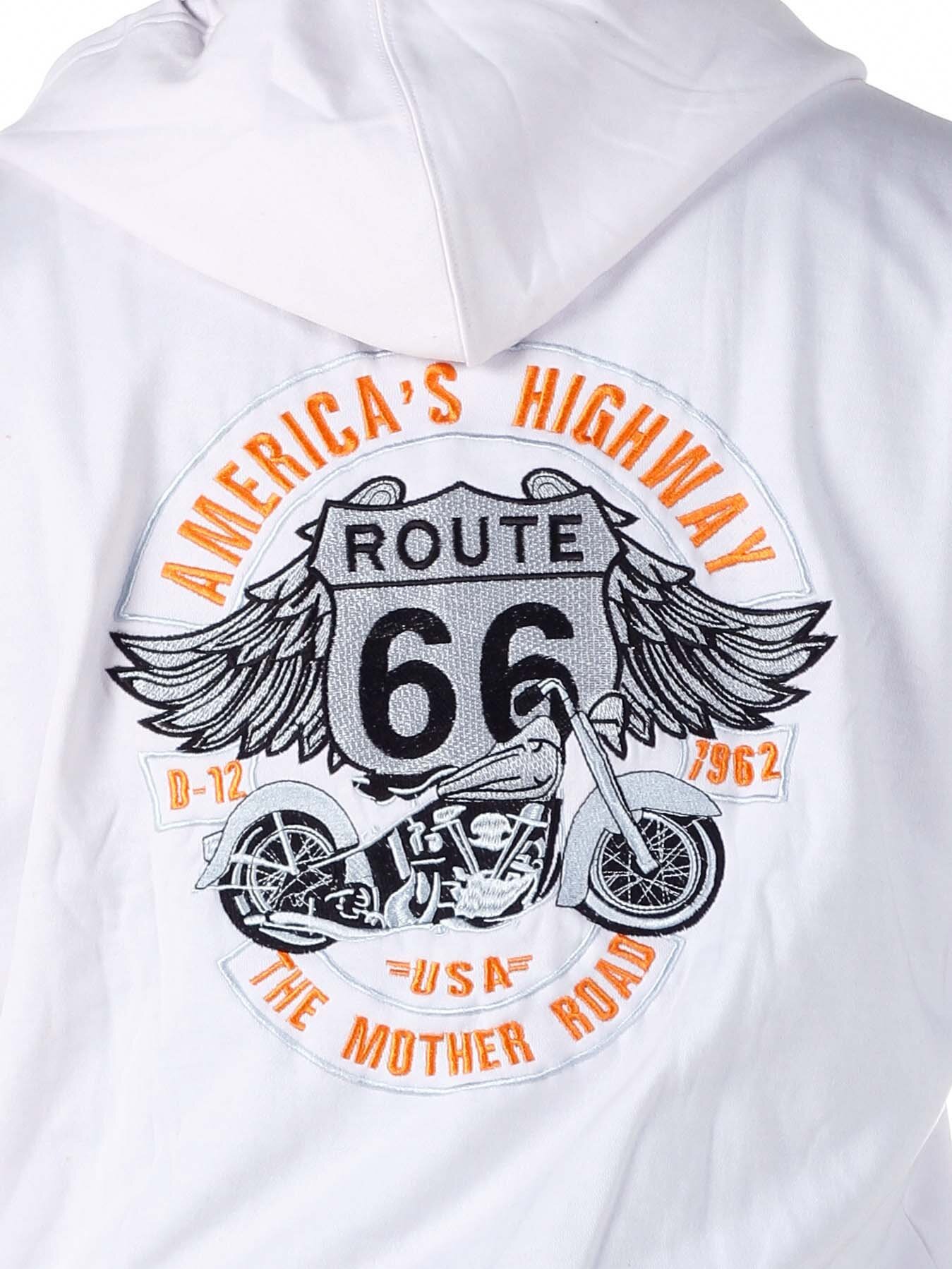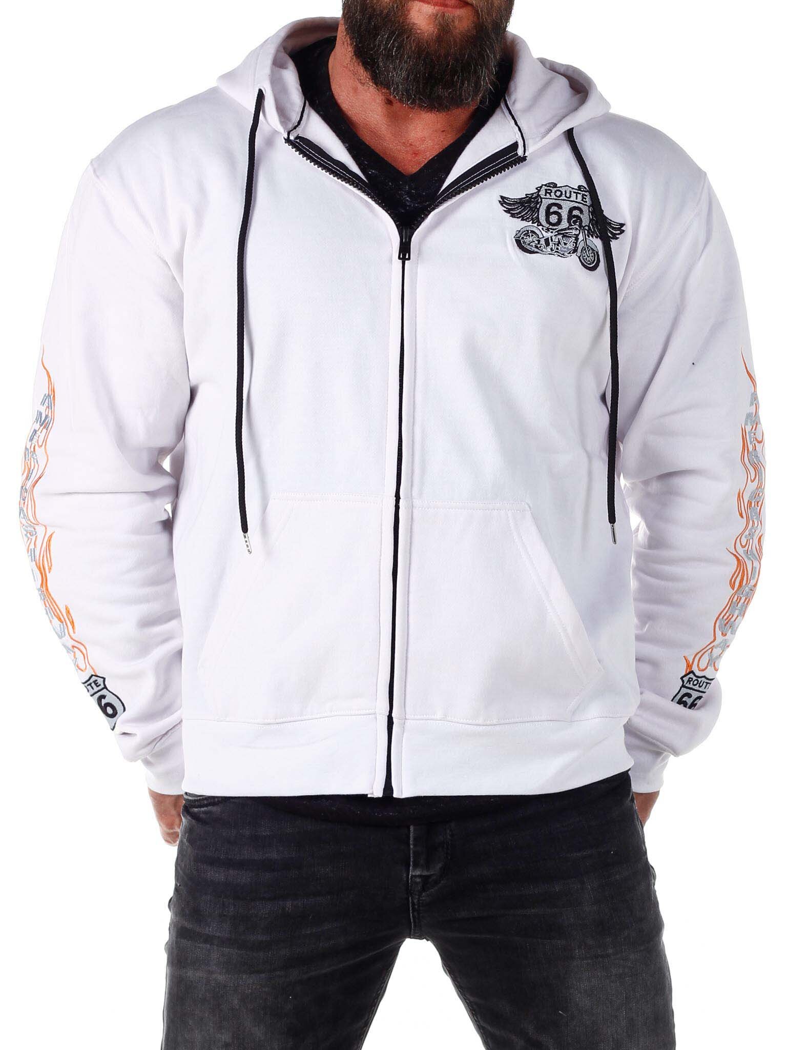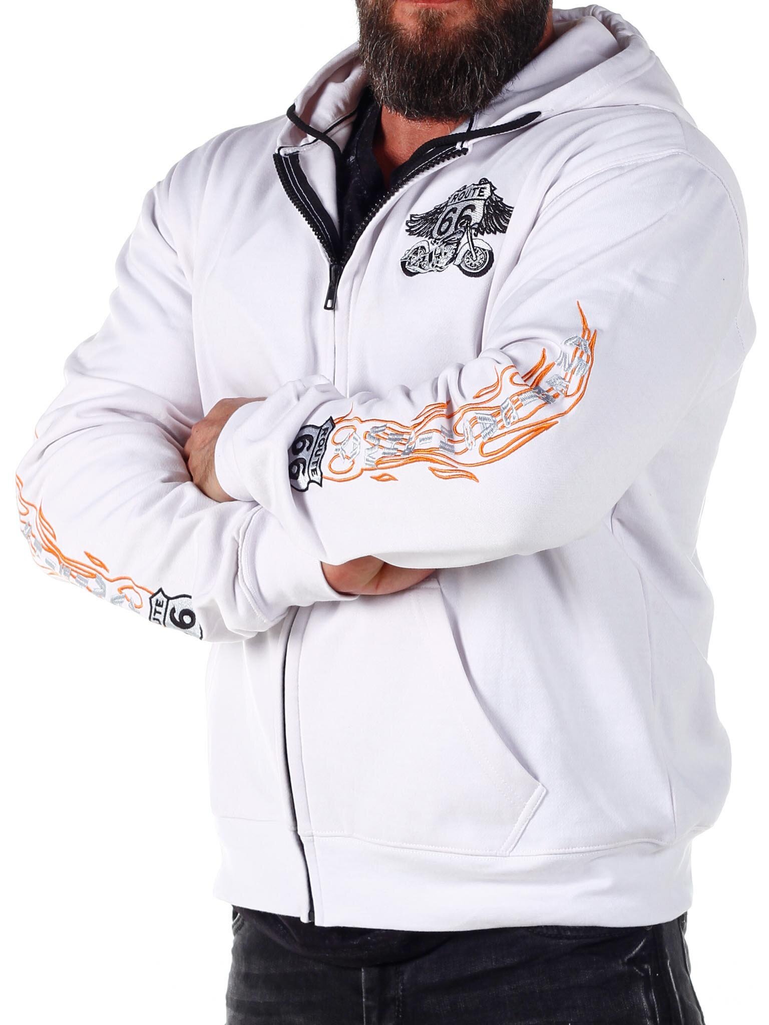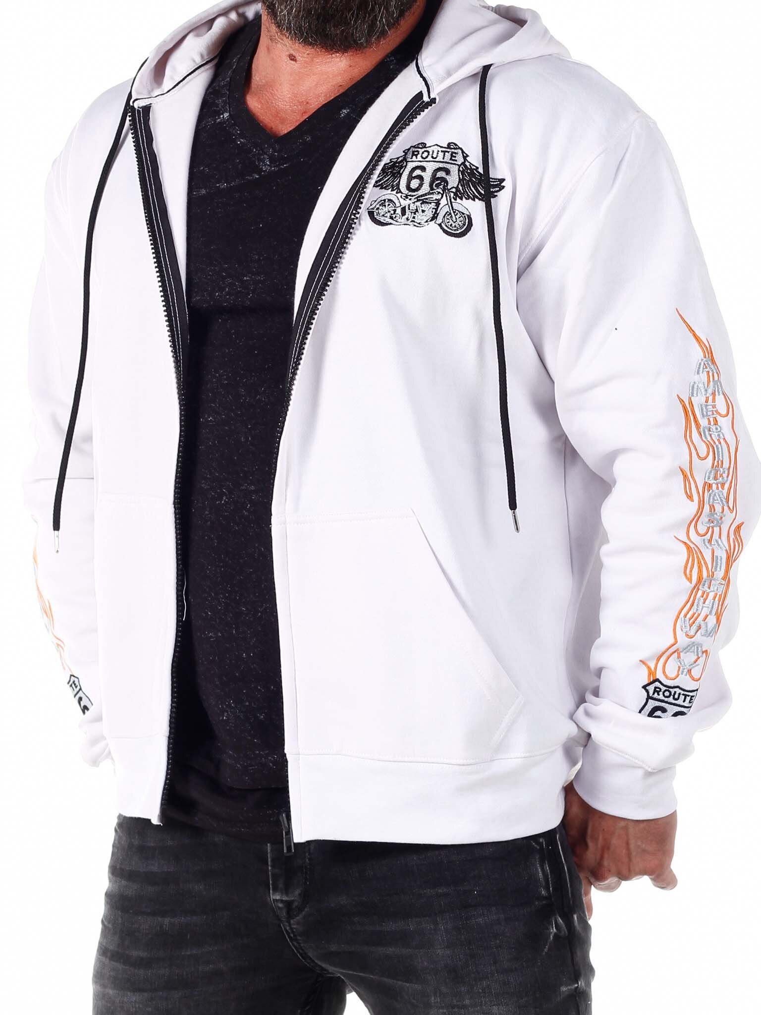 Hoodie with a zipper and front pockets. Spacious and comfortable model with a tailored design in white, black, and orange. Wide ribbed hem and sleeve cuffs.