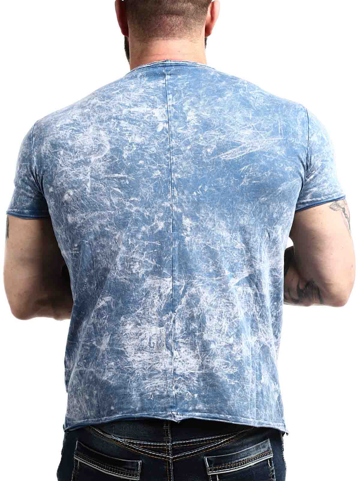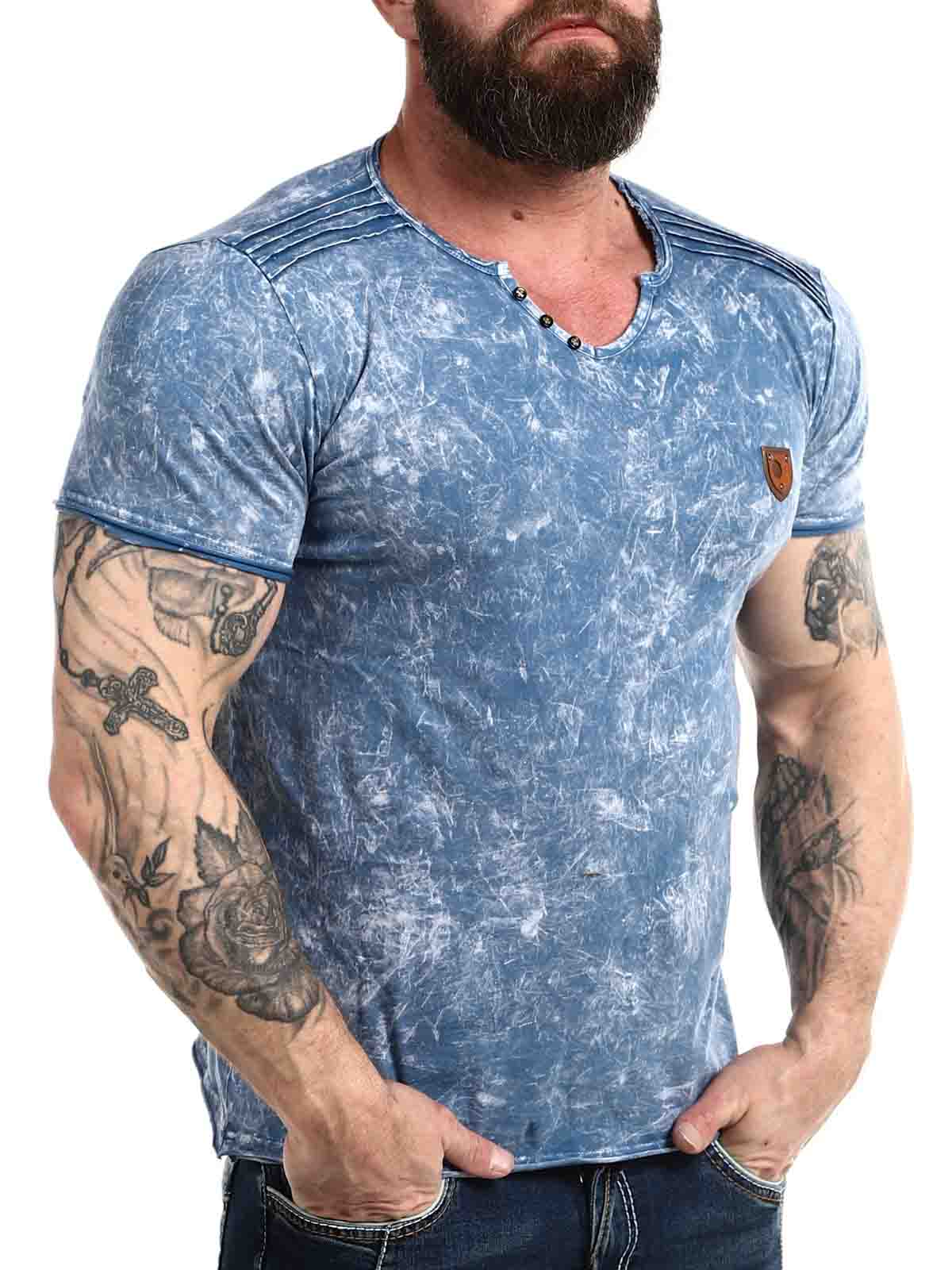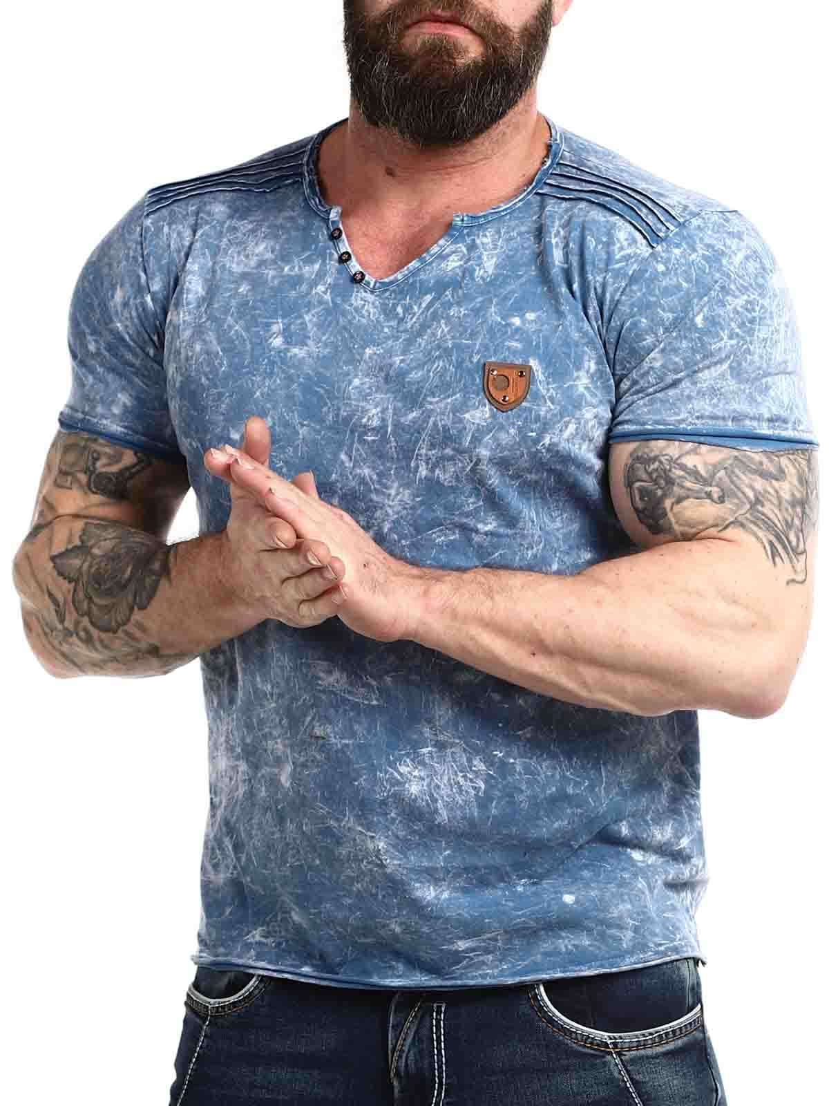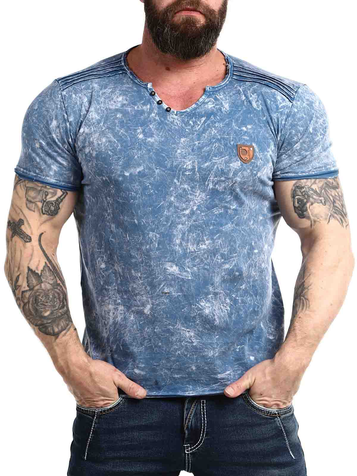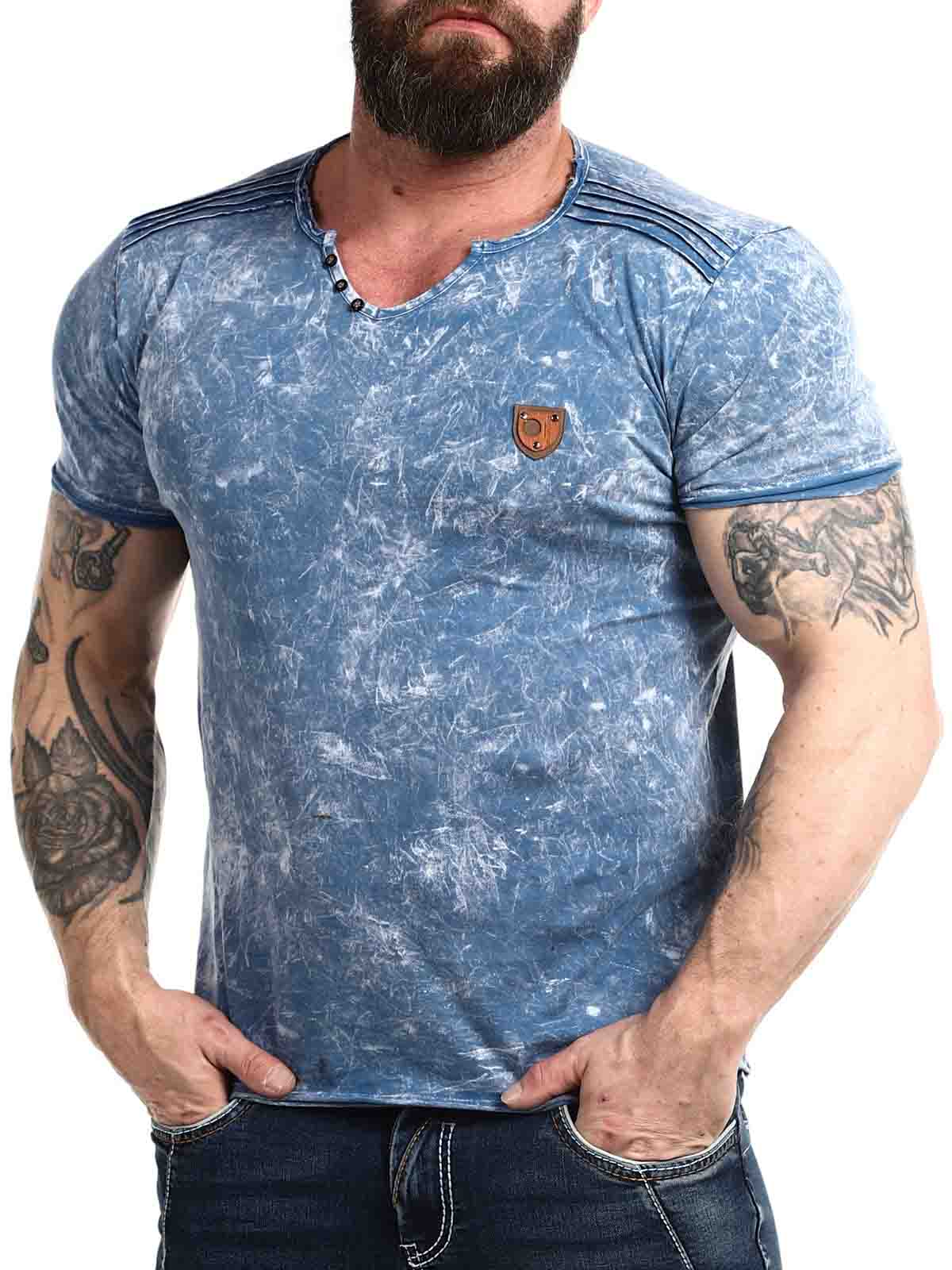 Made from comfortable and stretchy cotton with buttons at the neckline. Patterned with raw edges and rough stitching that nicely highlights the shoulders. Imitation leather logo patch on the left chest.