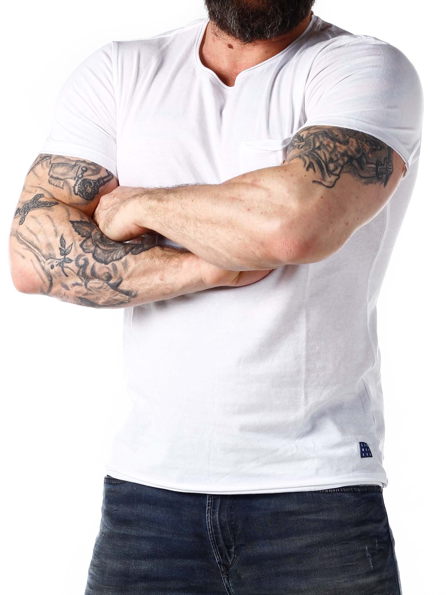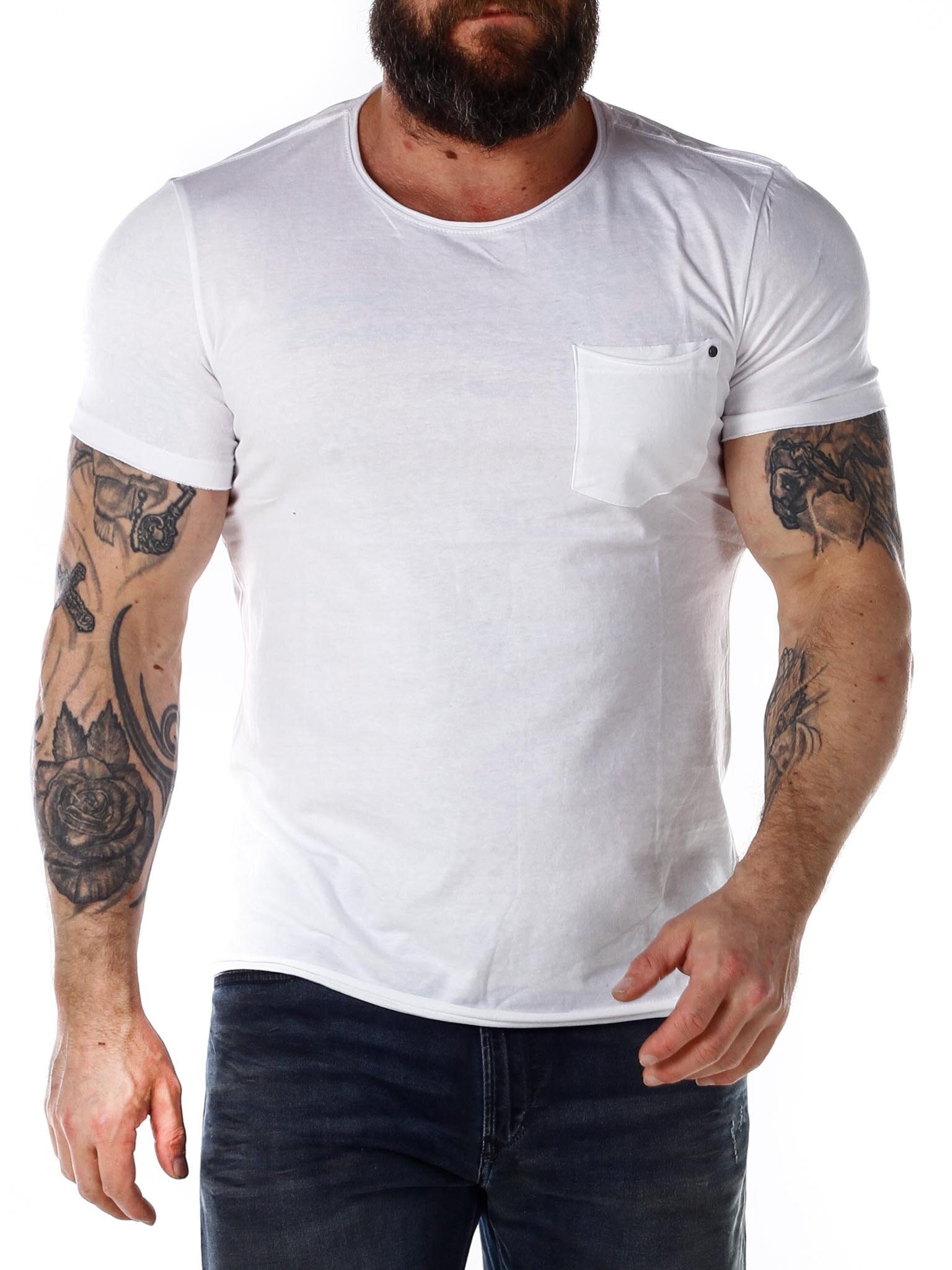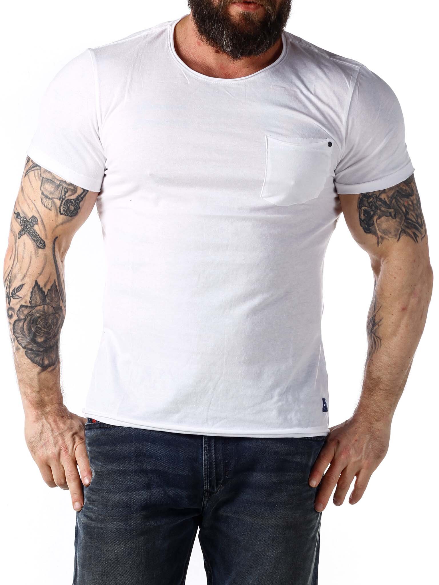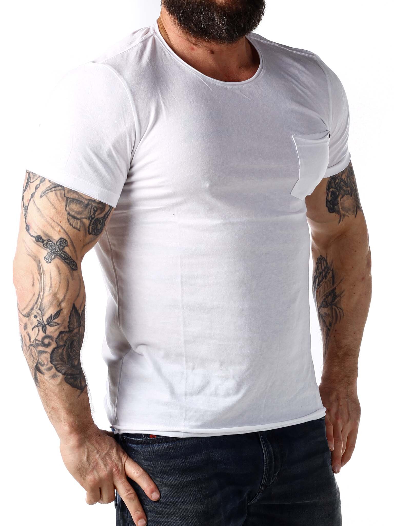 Super soft t-shirt with a round neckline and raw edges. It has a pocket on the chest and a patch on the bottom. Made in 100% cotton.