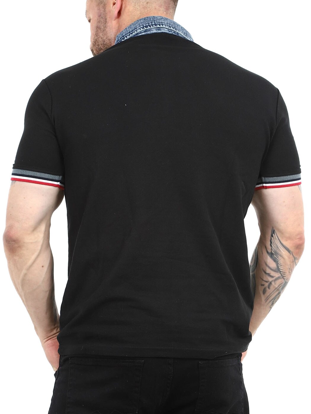 Black pique designed with collar in denim with buttoning. It has a classic fit with prints and patches on the front and ribbed cuffs. Made in 100% cotton.