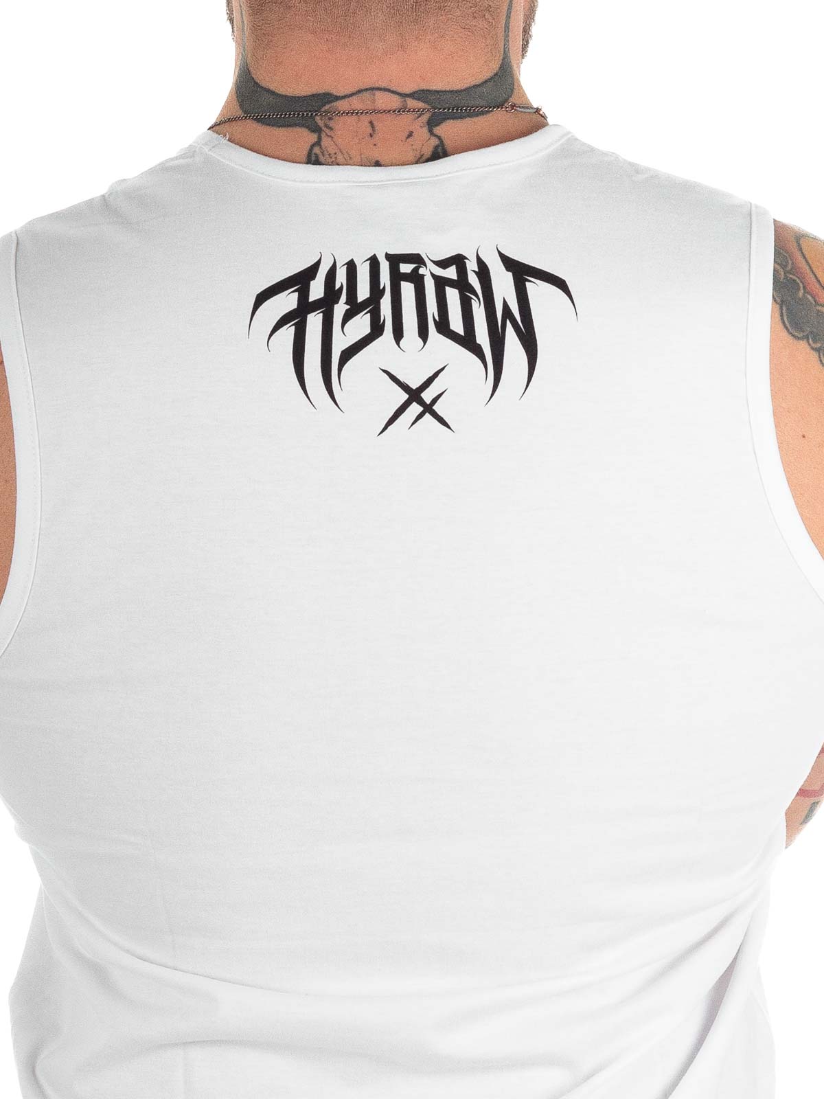 White tank top with a bold print and logo in a contrasting color. Classic design with a round neckline. Made from 100% cotton.