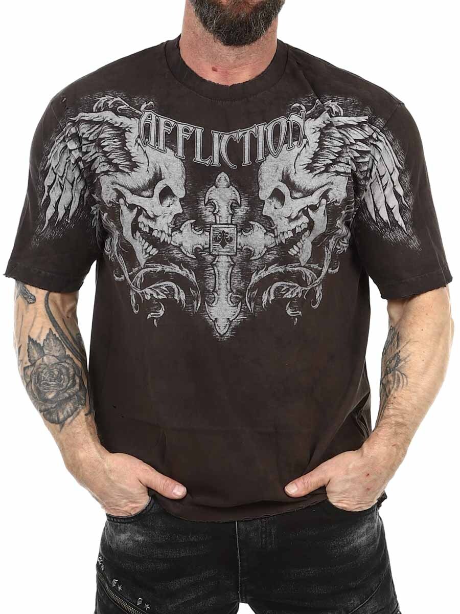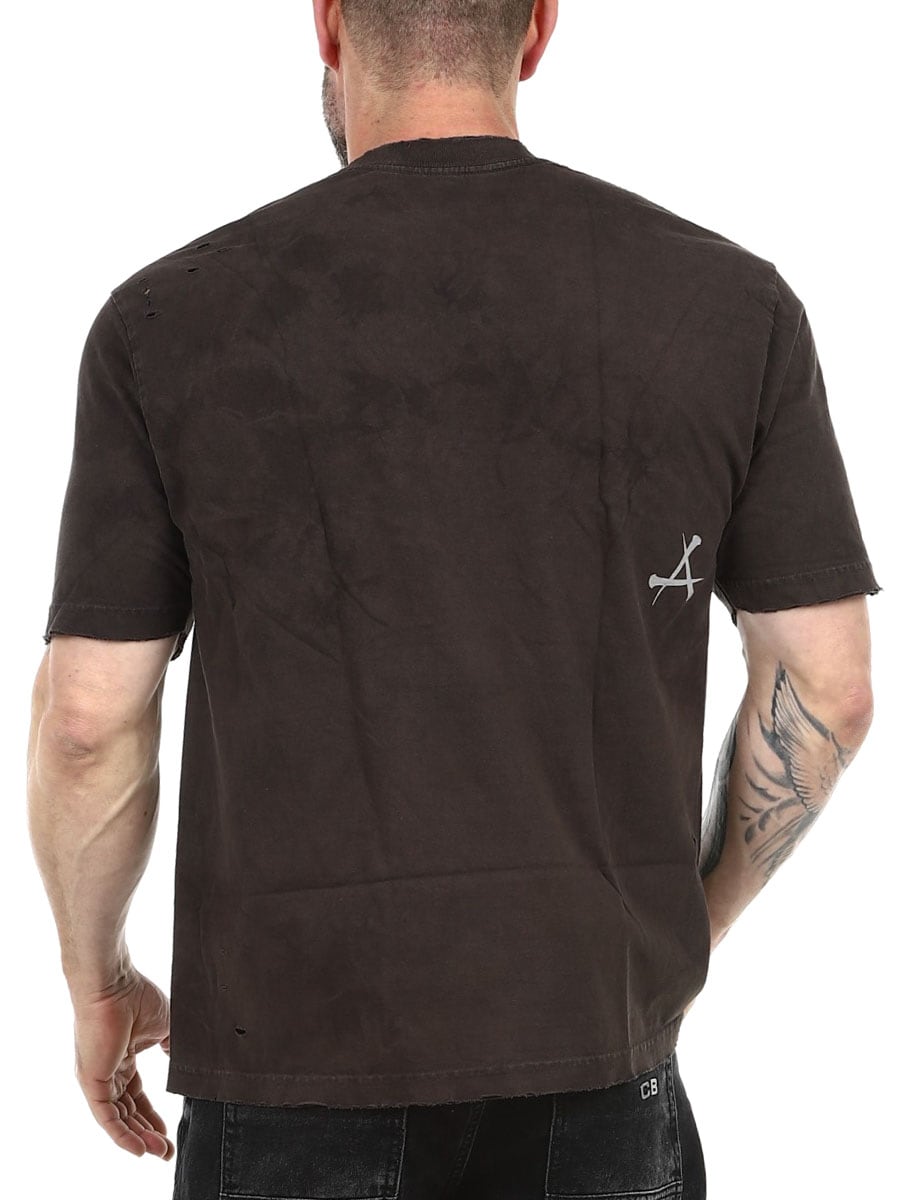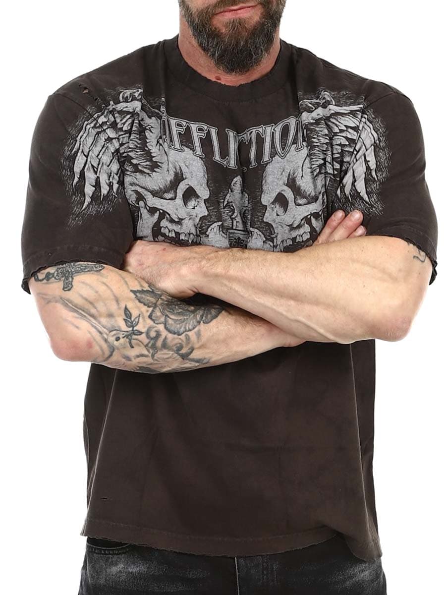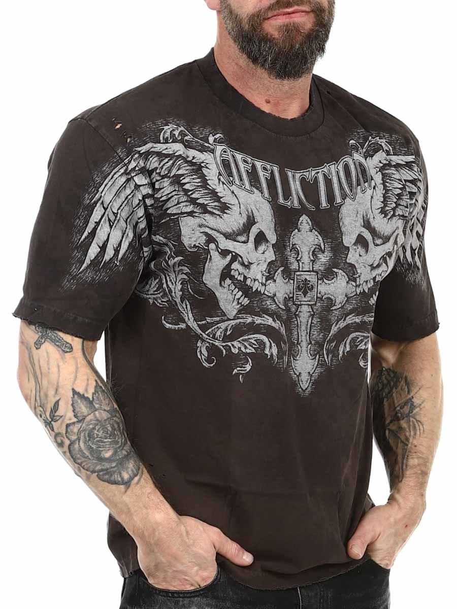 A unique and stylish T-shirt with distressed details and powerful graphics. The washed-out color combined with wings, a skull, and crosses creates a bold rock expression that truly stands out. For those who want to wear something that gets noticed!