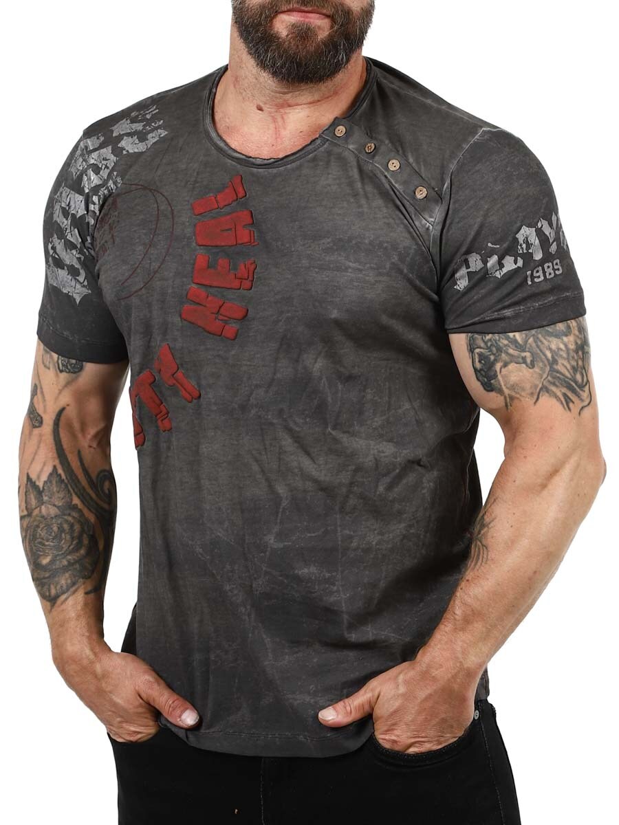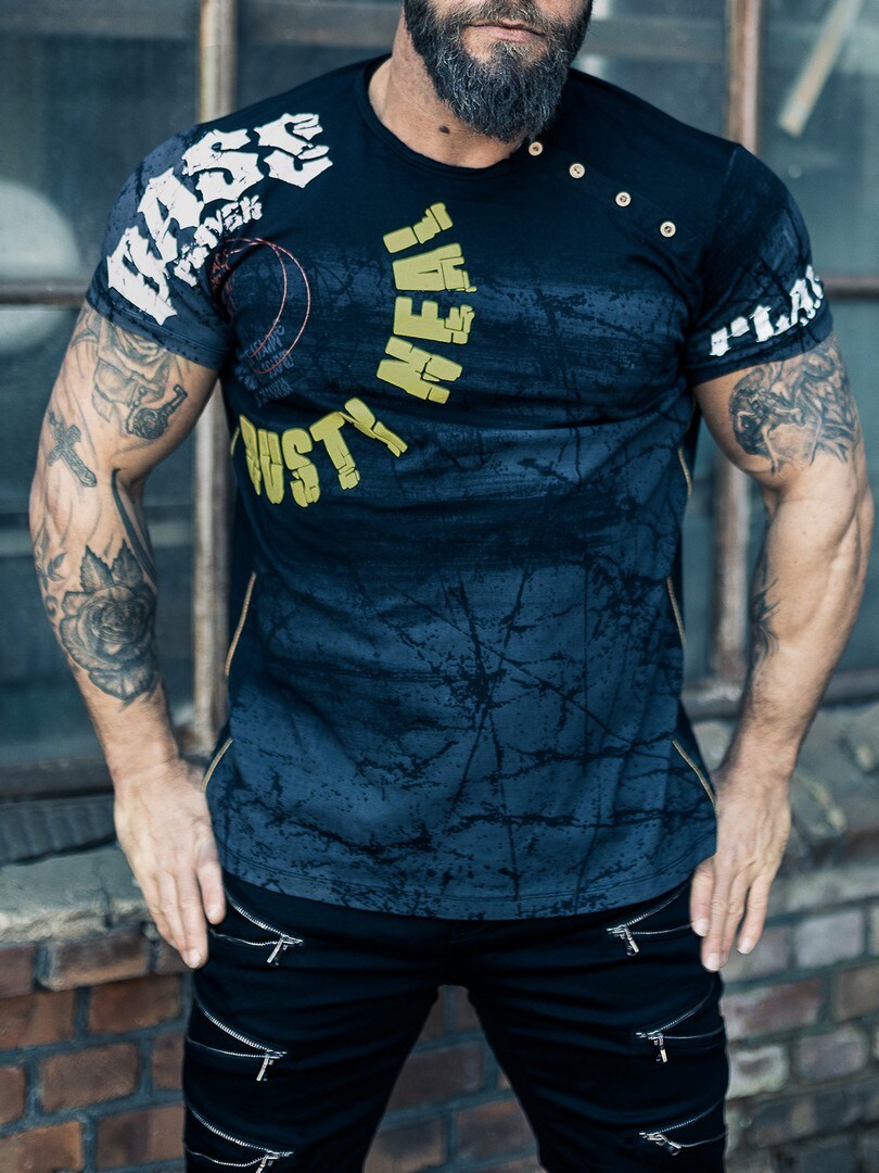 A unique t-shirt with stylish details such as 3D prints and patterns. The buttons at the rounded neckline are adjustable, allowing for a deeper neckline. Features a printed design on the front and is available in several color variations!
