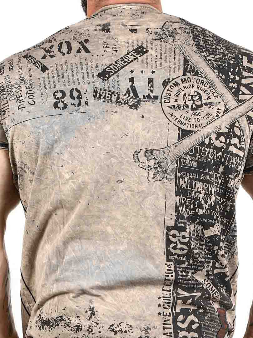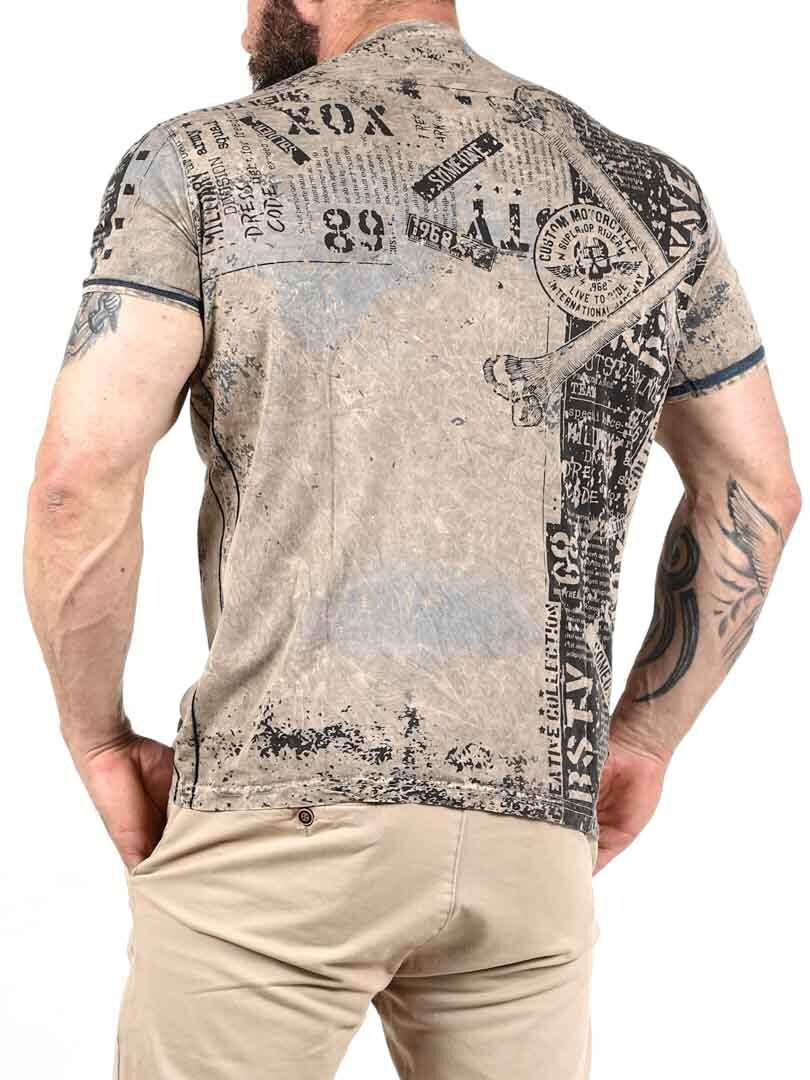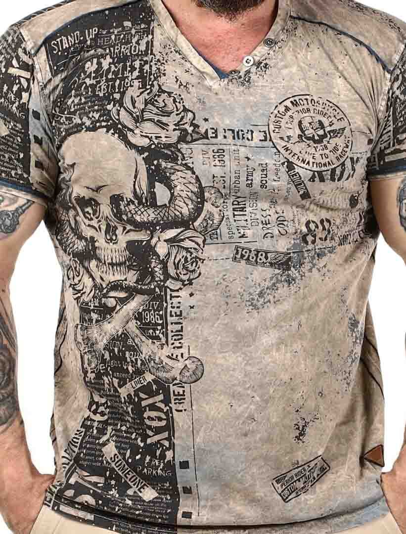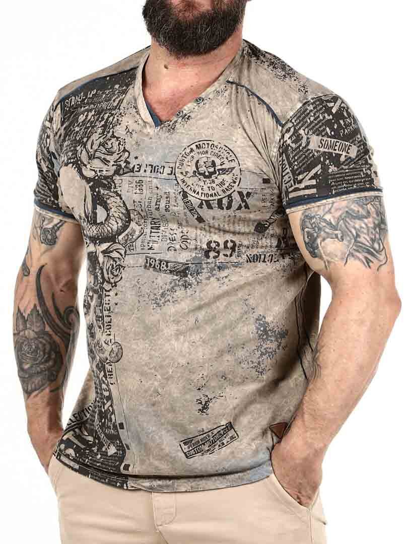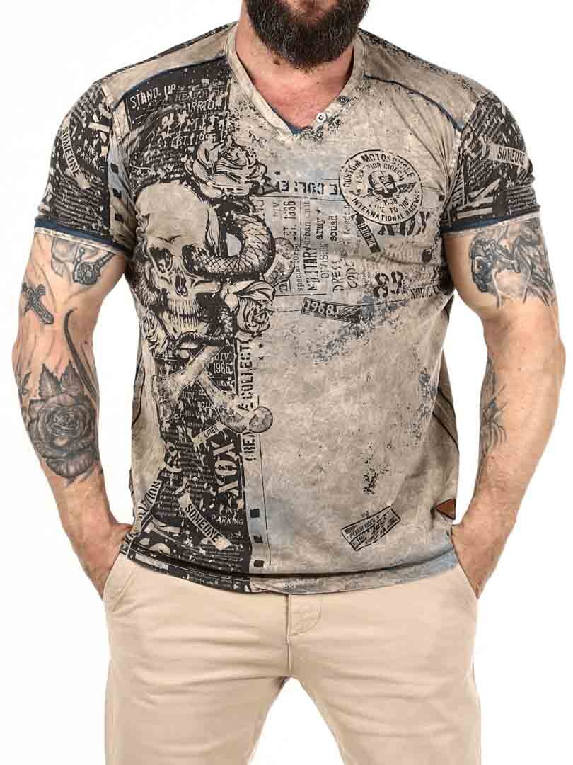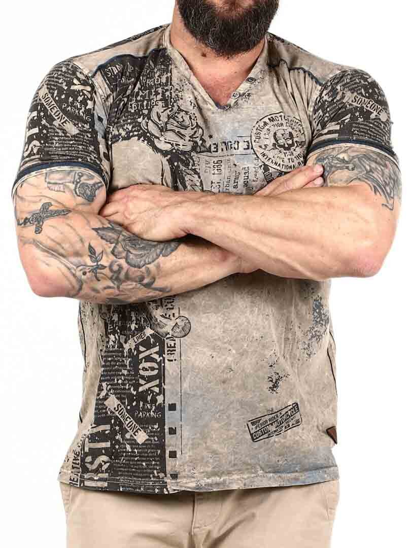V-neck t-shirt with print and text prints. Detailed with buttons at the neck opening and patches with logo at the bottom. Made from soft and stretchy cotton.