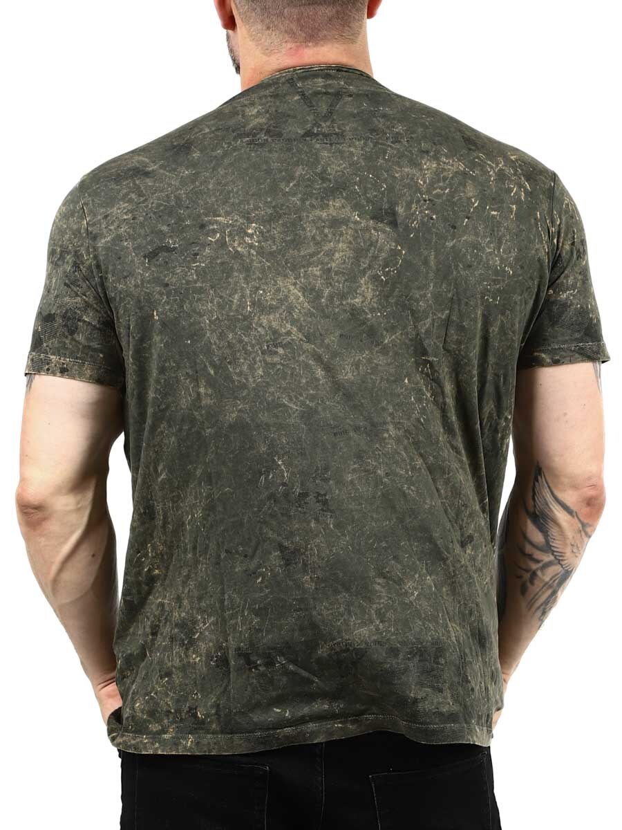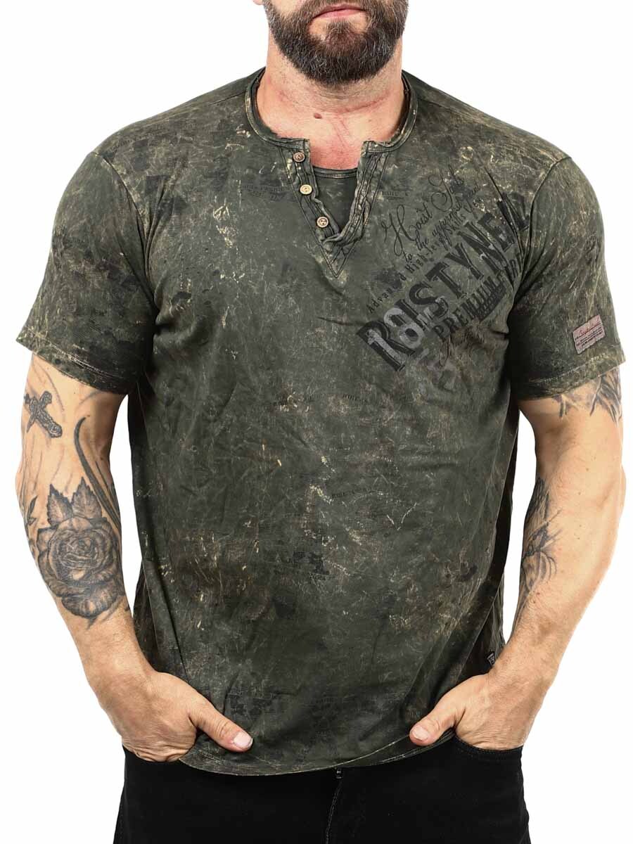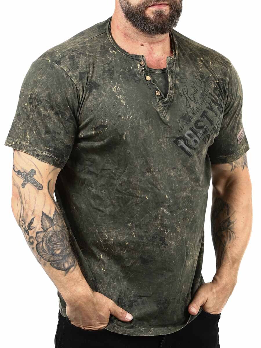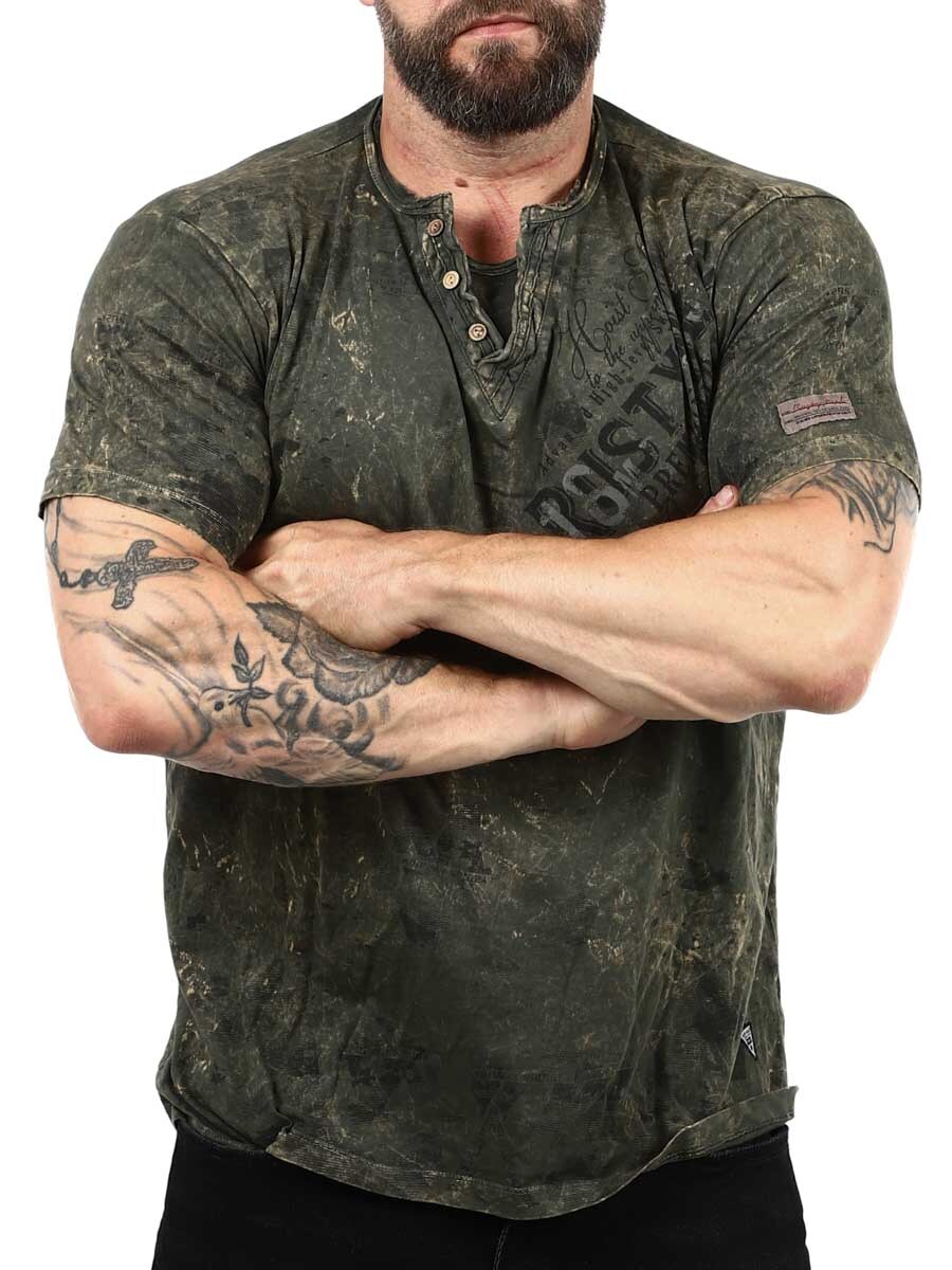 Patterned t-shirt detailed with buttons at the neckline, a fabric patch with a logo on the left sleeve, and one at the bottom hem. Made from soft and stretchy cotton, making it comfortable on the body!