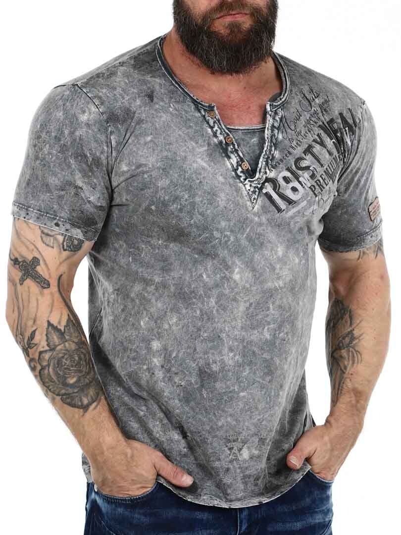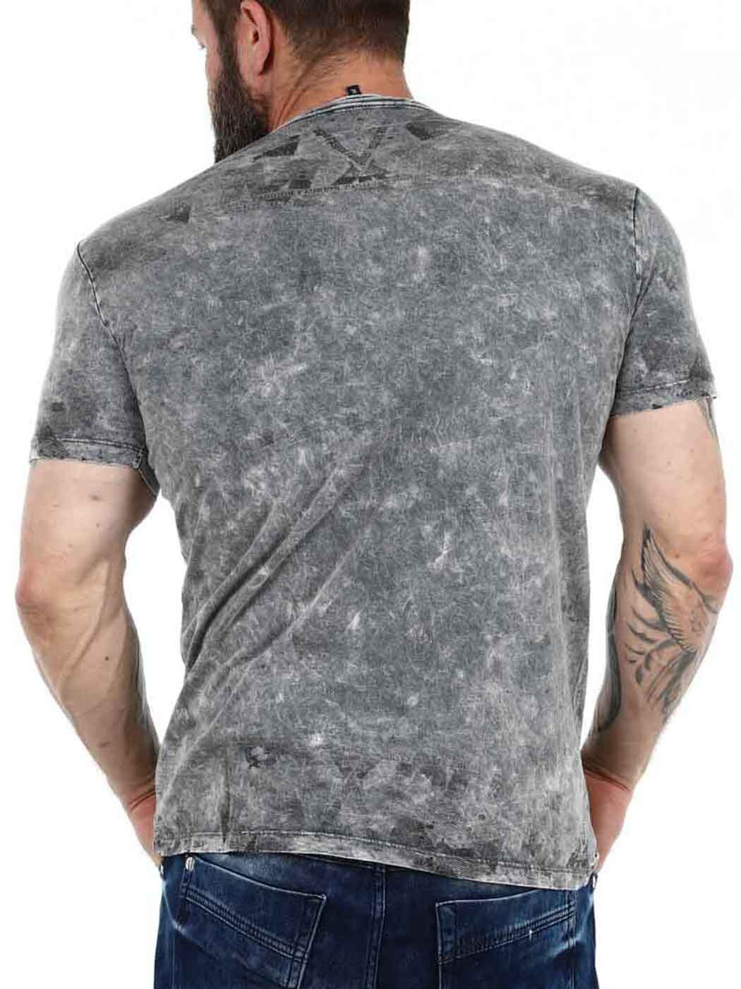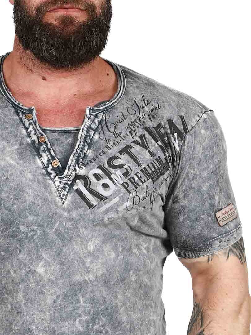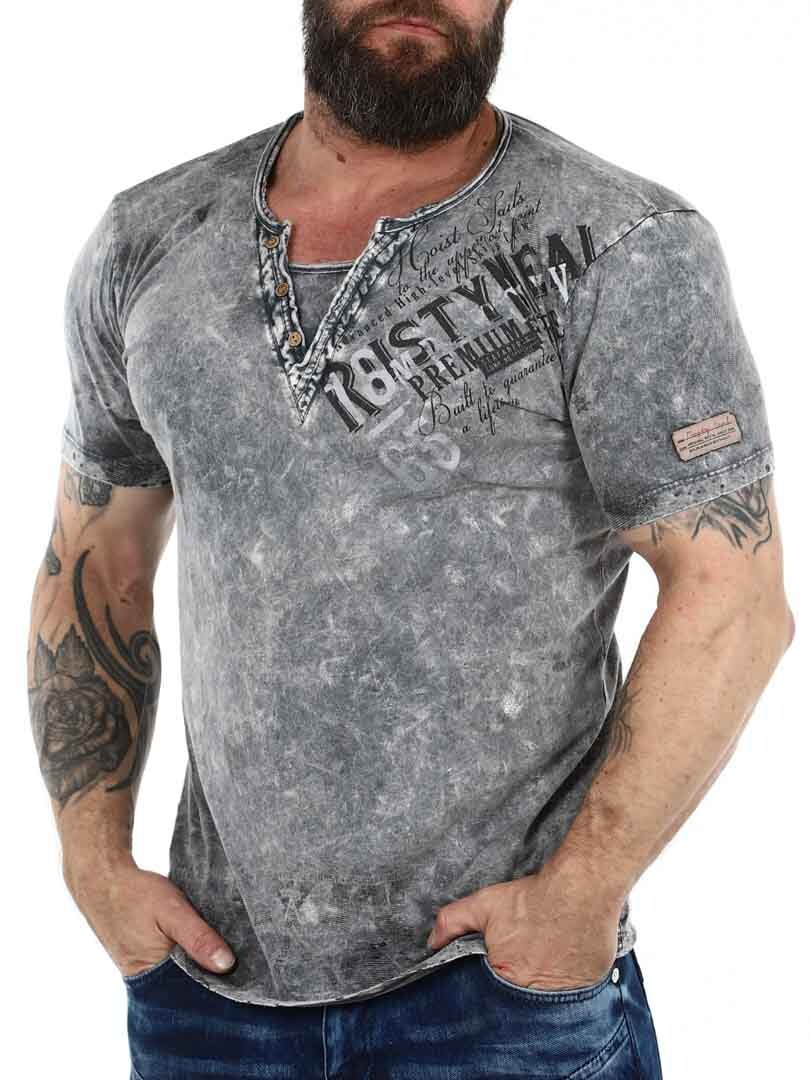 Patterned t-shirt detailed with buttons at the neckline, a fabric patch with a logo on the left sleeve, and one at the bottom hem. Made from soft and stretchy cotton, making it comfortable on the body!