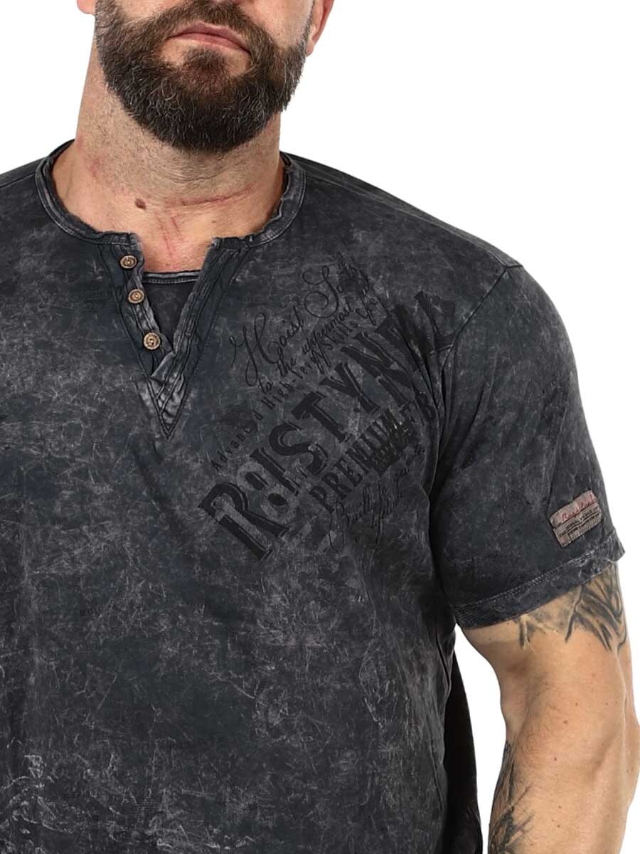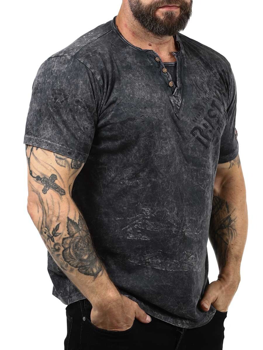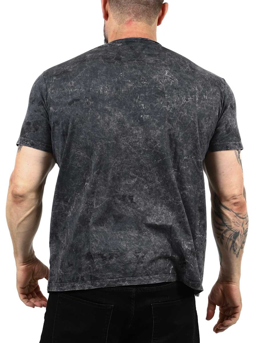 Patterned t-shirt detailed with buttons at the neckline, a fabric patch with a logo on the left sleeve, and one at the bottom hem. Made from soft and stretchy cotton, making it comfortable on the body!
