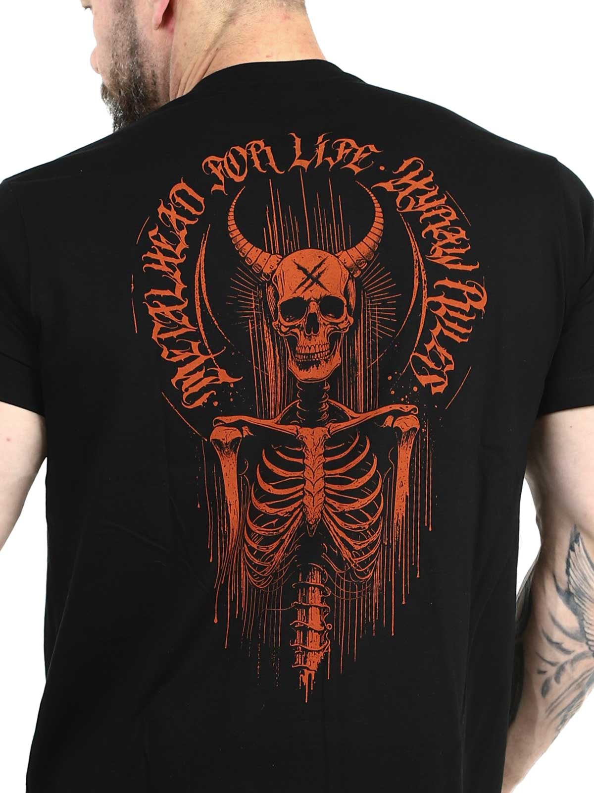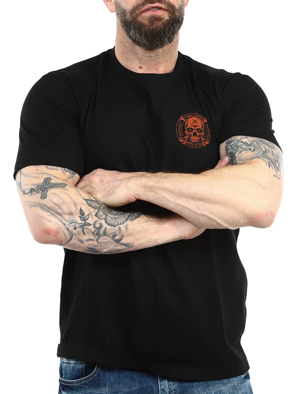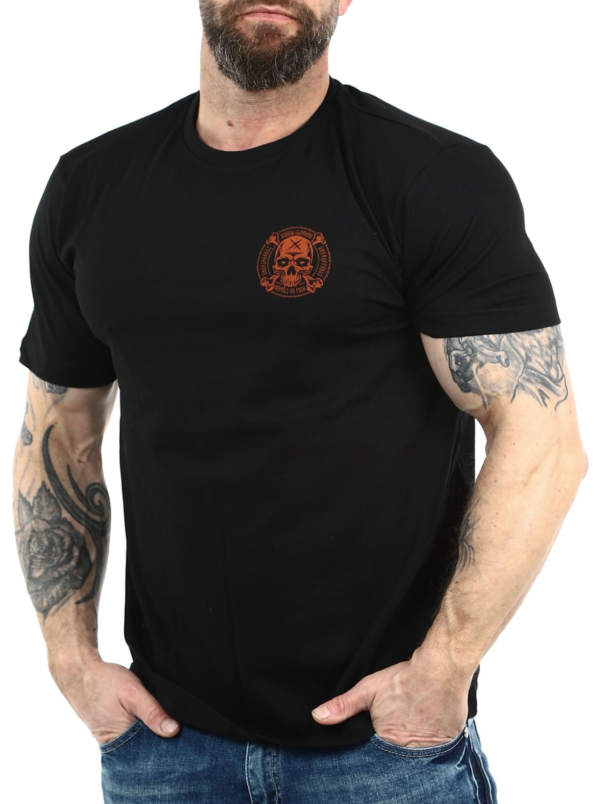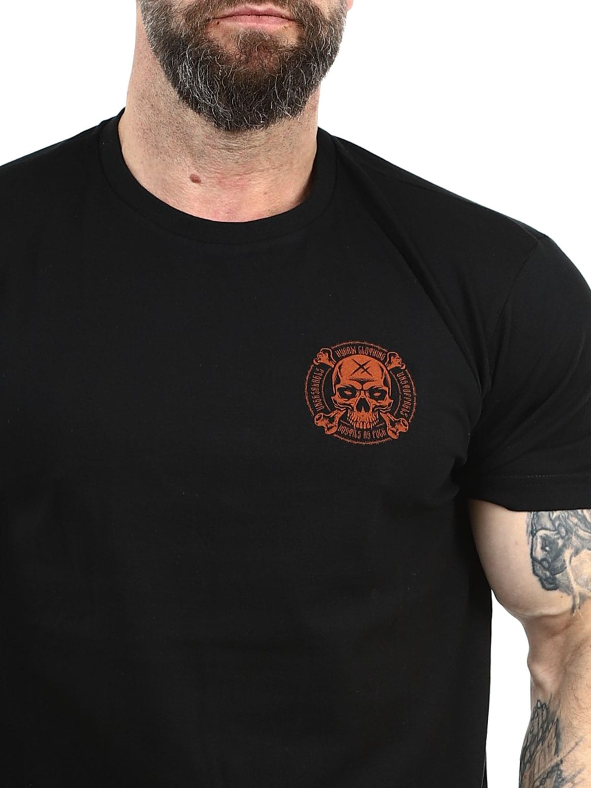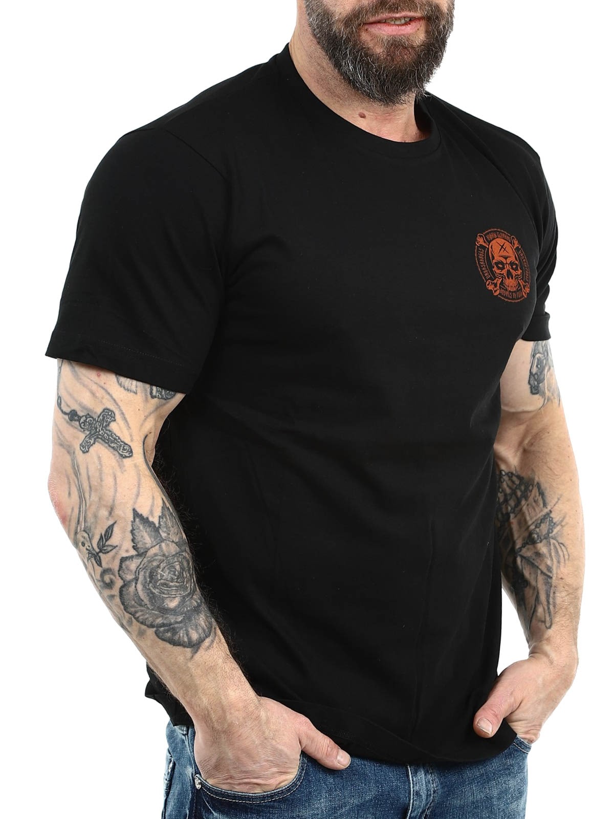 Black t-shirt designed with a large print at the back and a smaller print at the front. Straight model with rounded and ribbed neck opening. Produced in 100% cotton!