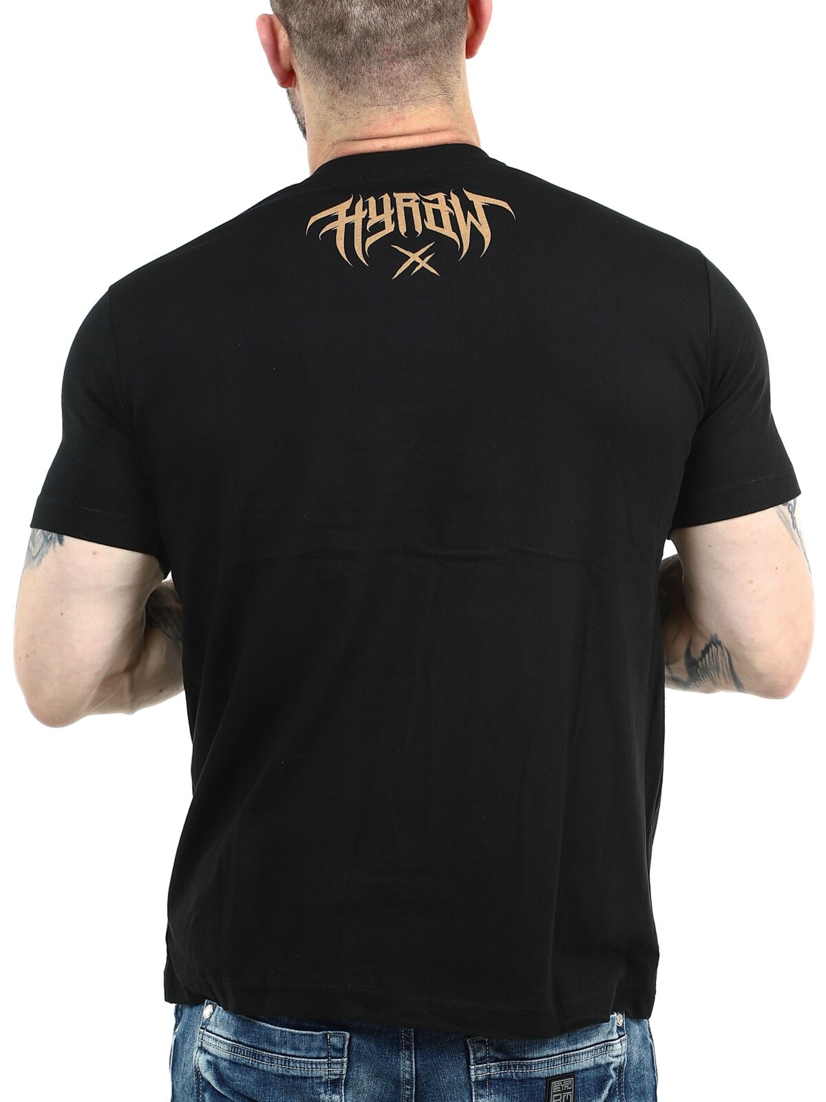 Black t-shirt with a bold chest print in a contrasting color and a subtle Hyraw logo printed on the back of the neck. The classic design with a round neckline provides a comfortable fit and makes the shirt easy to style with everything from jeans to streetwear looks.