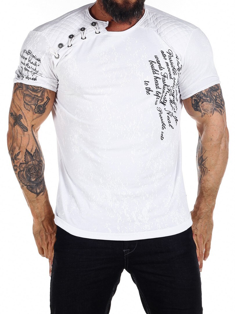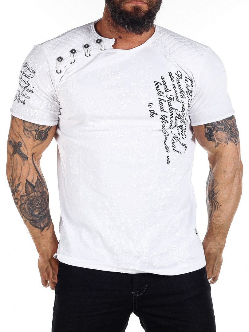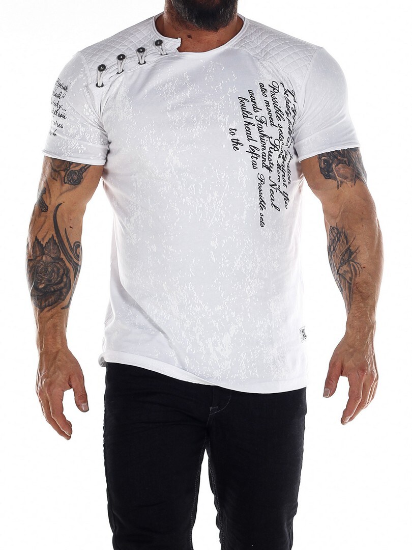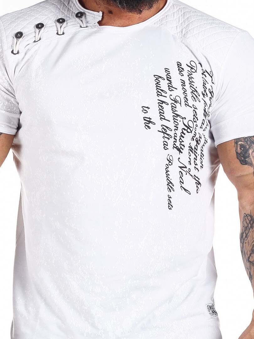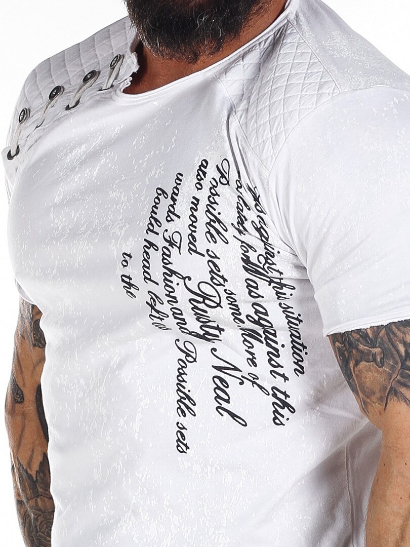 Patterned t-shirt in stretch cotton fabric with text print on the left chest and right arm. Marked shoulders with buttons and plaid pattern, rounded neck, raw edges and fabric patch with the logo in the waistband netill. Available in several colors!
