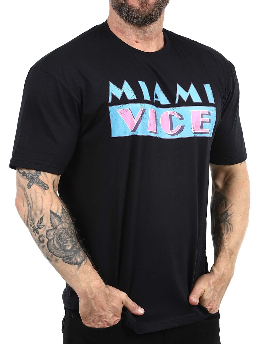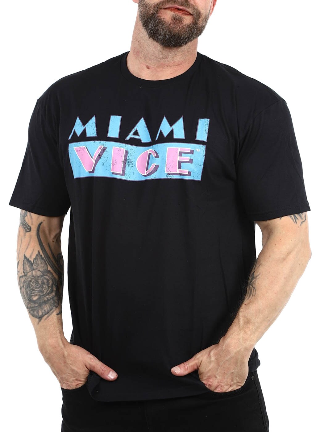 Feel the vibe of the legendary TV series Miami Vice with this retro-style t-shirt. The iconic Miami Vice logo is printed in a neatly worn look that gives an authentic vintage feel.